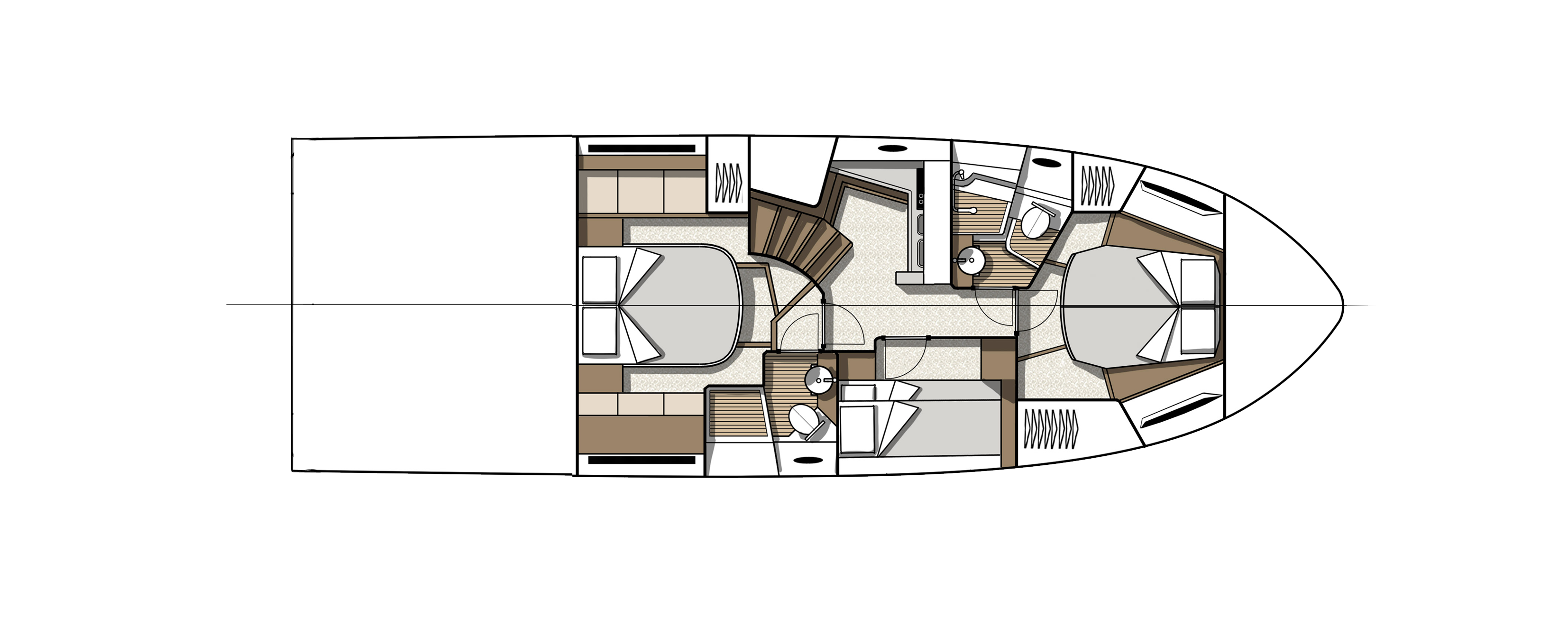 With its sleek lines and sporty hull, this 14.78-metre yacht boasts elegant details such as the metallic grey “fashion plates” fixed to the sides of the hard-top and on the engine air intakes. The hard-top and the large hull windows, a feature of the new generation of Express Cruiser, give the boat a sleek, modern look and infuse the interior with soft, natural daylight.