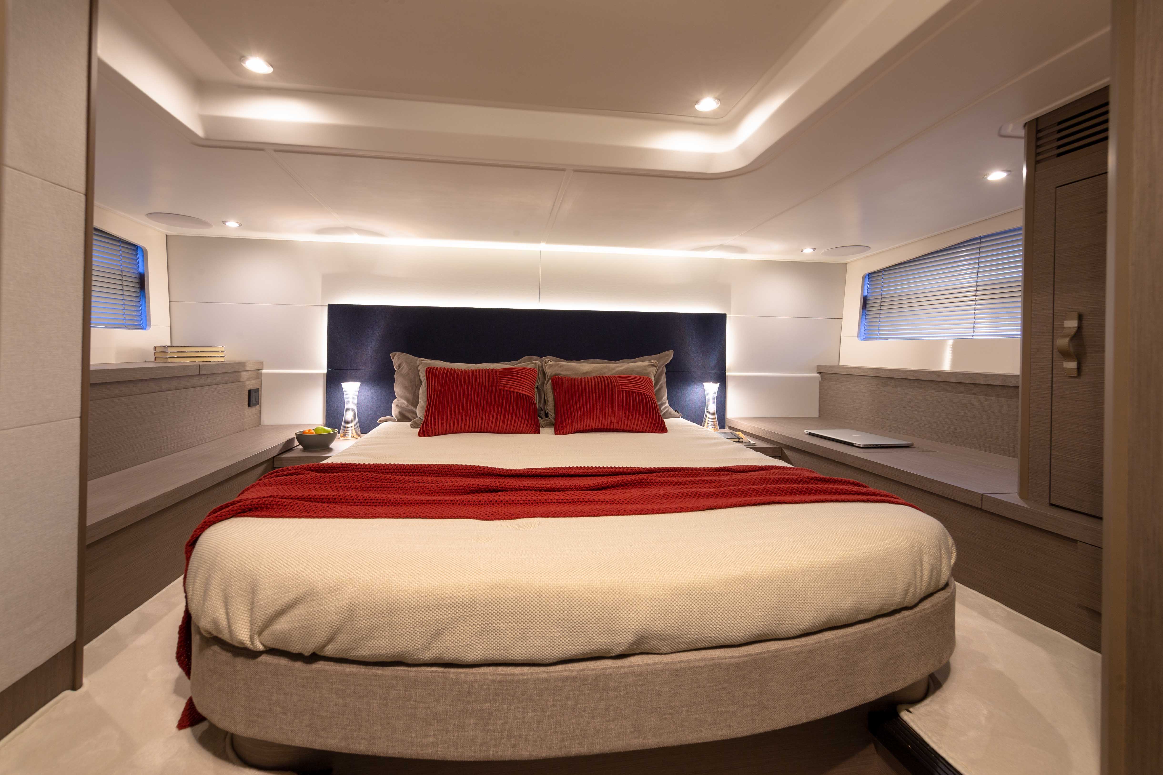 The cockpit of the Gran Turismo 45 is furnished with a vast U-shaped seat that creates a comfortable and convivial area for guests, who sit facing the Wet Bar that features a sink, fridge and ice-maker. This wetbar contains a retractable TV that can be raised to provide entertainment.