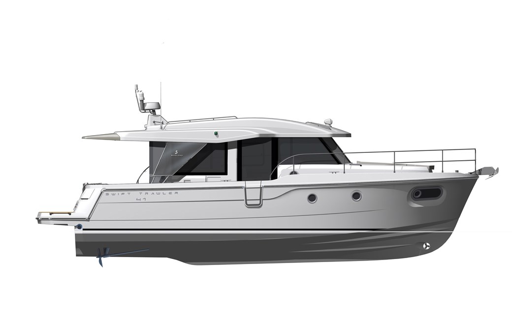 The Beneteau Swift Trawler 41 Sedan is the first Sedan version in the latest generation of Swift Trawlers. The ST41 has all the award-winning features of this successful range, with superb seaworthiness and clever innovations giving her a fresh contemporary feel. She is a generous passage maker and successfully renews the spirit and style of the trawler range with ample living spaces that are both comfortable and practical. Her stylish, modern, aggressive look reflects the Swift Trawler line renewal, marked by the launch of the Swift Trawler 47. The Swift Trawler 41 has a fluid and balanced profile, emphasized by a slender flared out hull, which means she cuts perfectly through the sea. Her new hull has also been designed for optimum fuel consumption and efficiency. The aft galley layout links seamlessly with the cockpit, which has a sliding bench making it easy to get to the swim platform. In the wheelhouse, the pilot seat rotates allowing seating for eight in the saloon. The lounge space converts to a comfortable double berth while below deck, the three cabins allow up to seven to sleep comfortably on this innovative family cruiser.