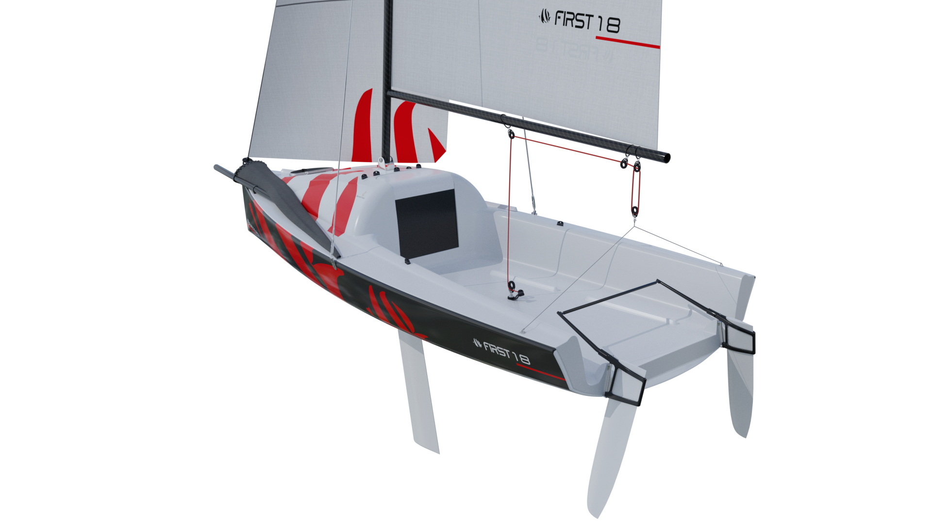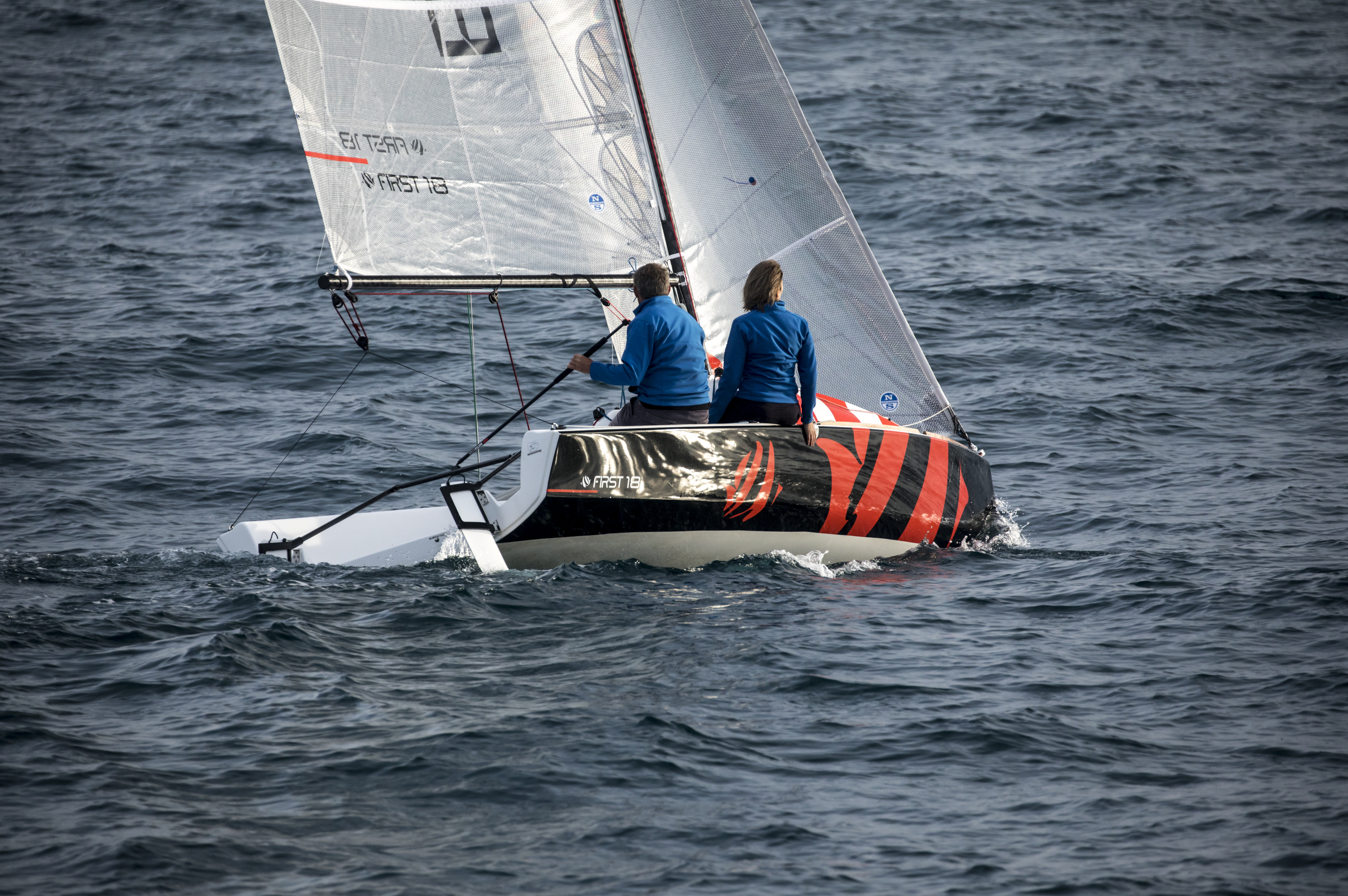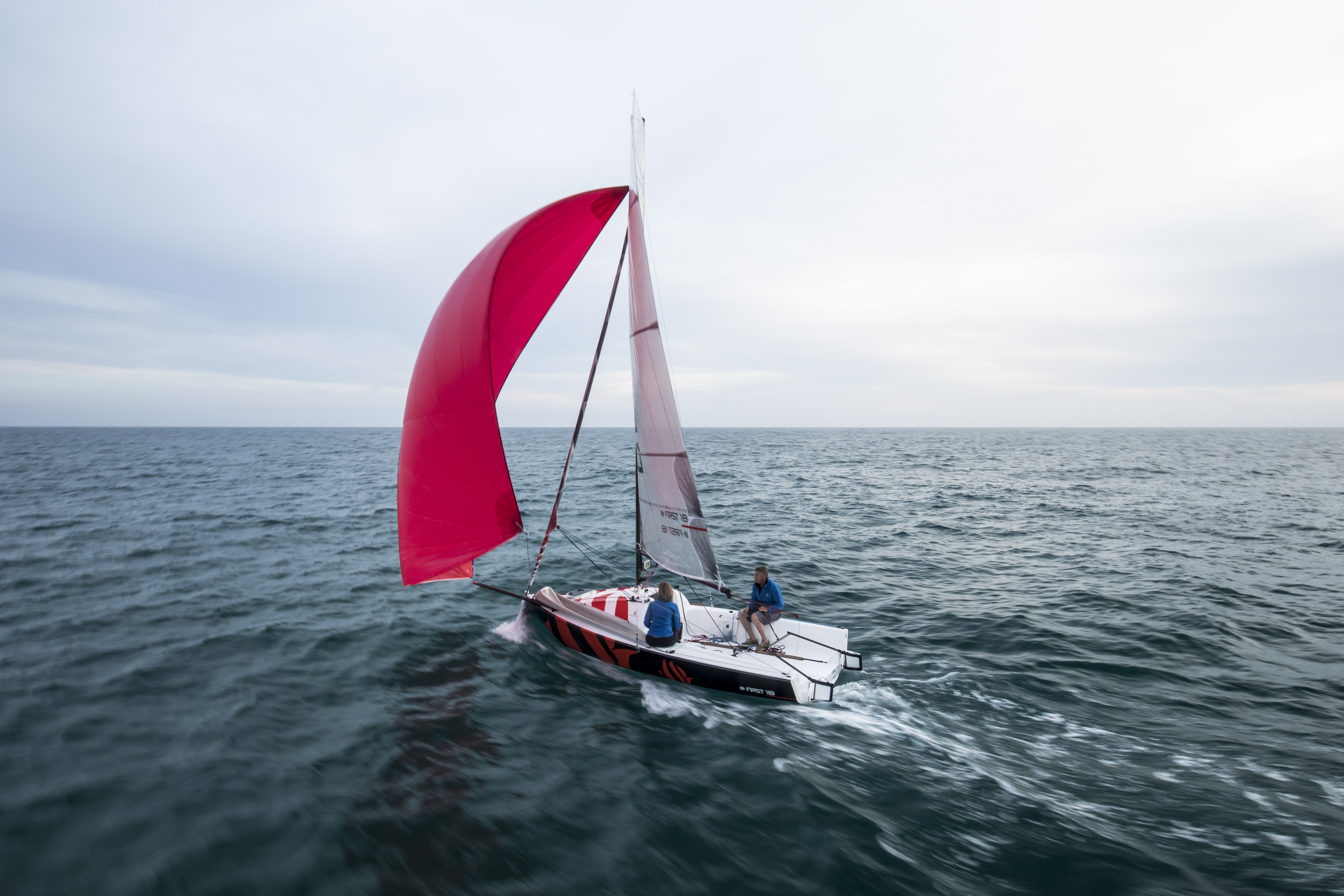 A large progressively chined hull gives you a taste of what is to come. The First 18 offers speed and sensations, whatever your programme. Stable and lightweight, with a planning hull and high-performance rigging, the First 18 makes the most of the slightest puff of wind to reach speeds that can equal it! Stiff in a breeze, she is also perfectly at ease when the wind picks up. Certified for four people aboard, the First 18 handles easily with a crew of two or solo, even under spinnaker. Thanks to her lifting keel, you can beach wherever you want.
