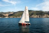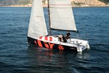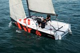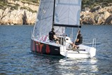 The First 27 was designed for offshore racing by naval architect Sam Manuard, taking inspiration from his own racing experience. Featuring a hard chine as far as the stem, vertical sides, a good beam on the waterline and twin rudders, she has all the makings of a robust competitive boat. Her hull shape, carbon rig, and deep draught lead keel, combine to make here remarkably stable. With her keel taking up 50% of her weight, she is an incredibly powerful yacht. The cockpit is spacious and comfortable, and has two foot chocks over the full length. With a manually operated hydraulic jack to lift the keel, the First 27 is easy to tow.