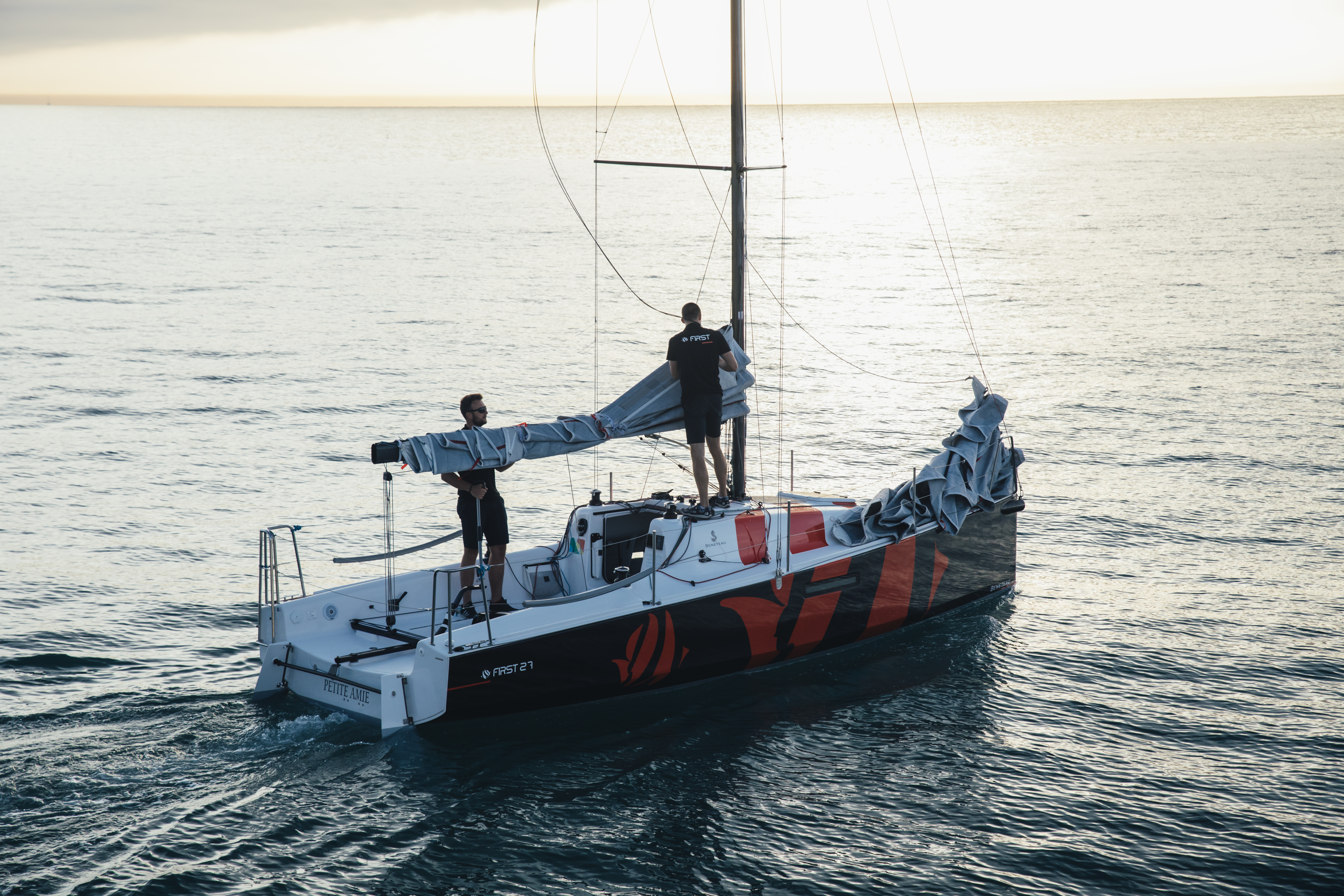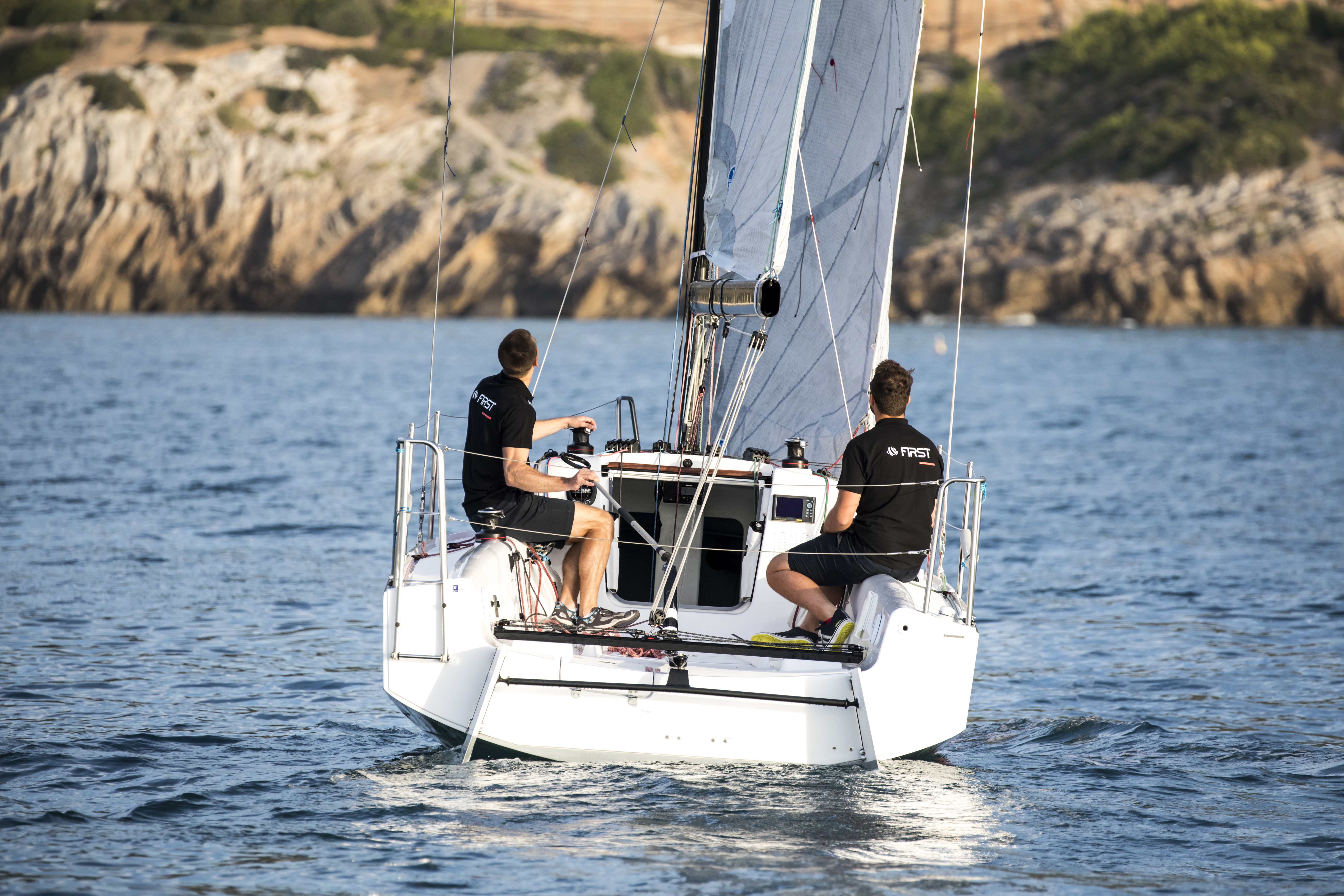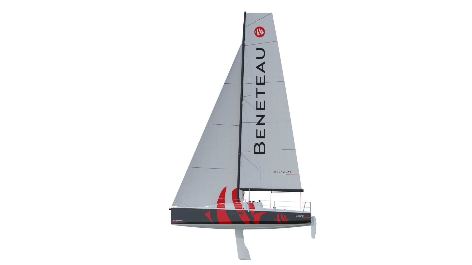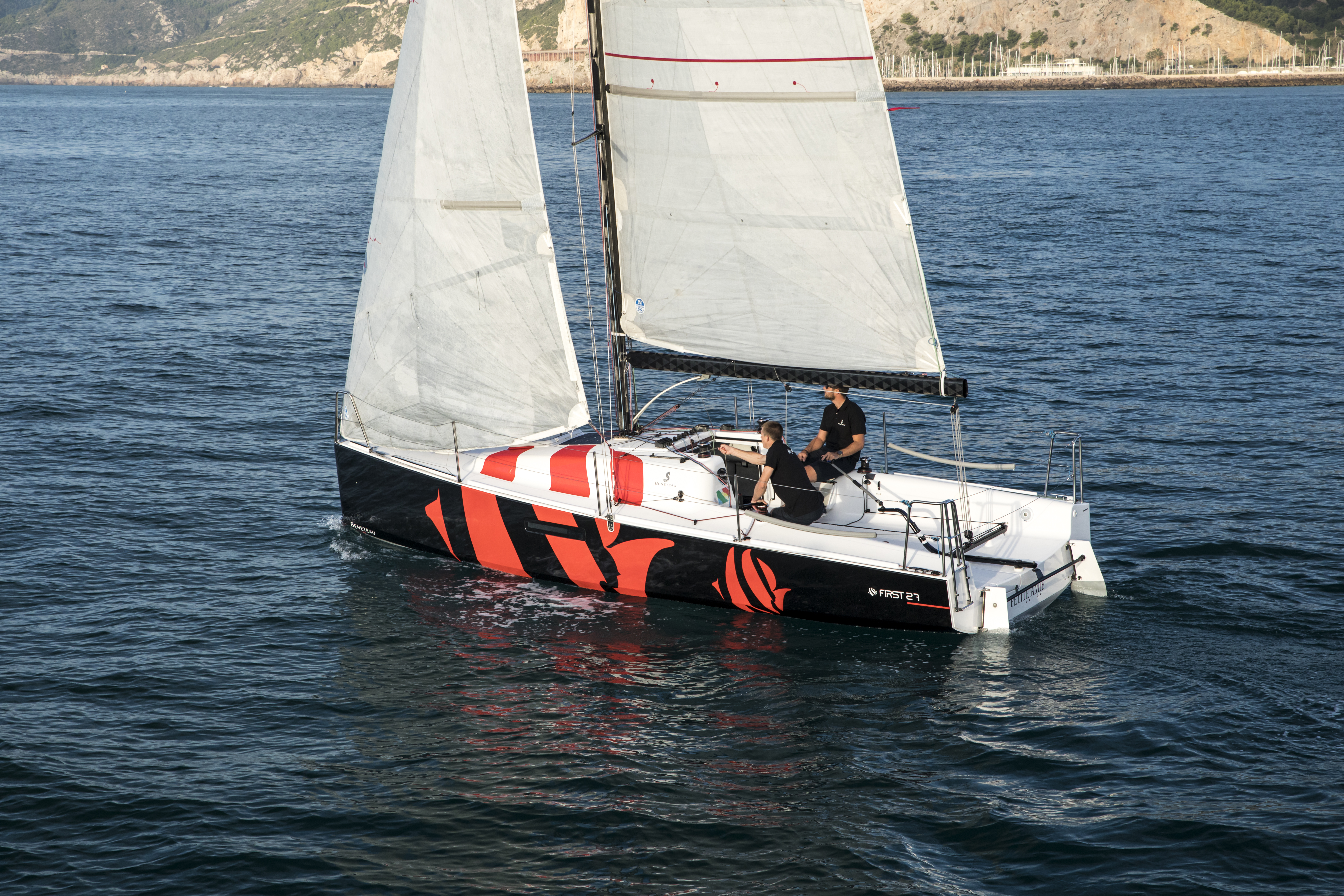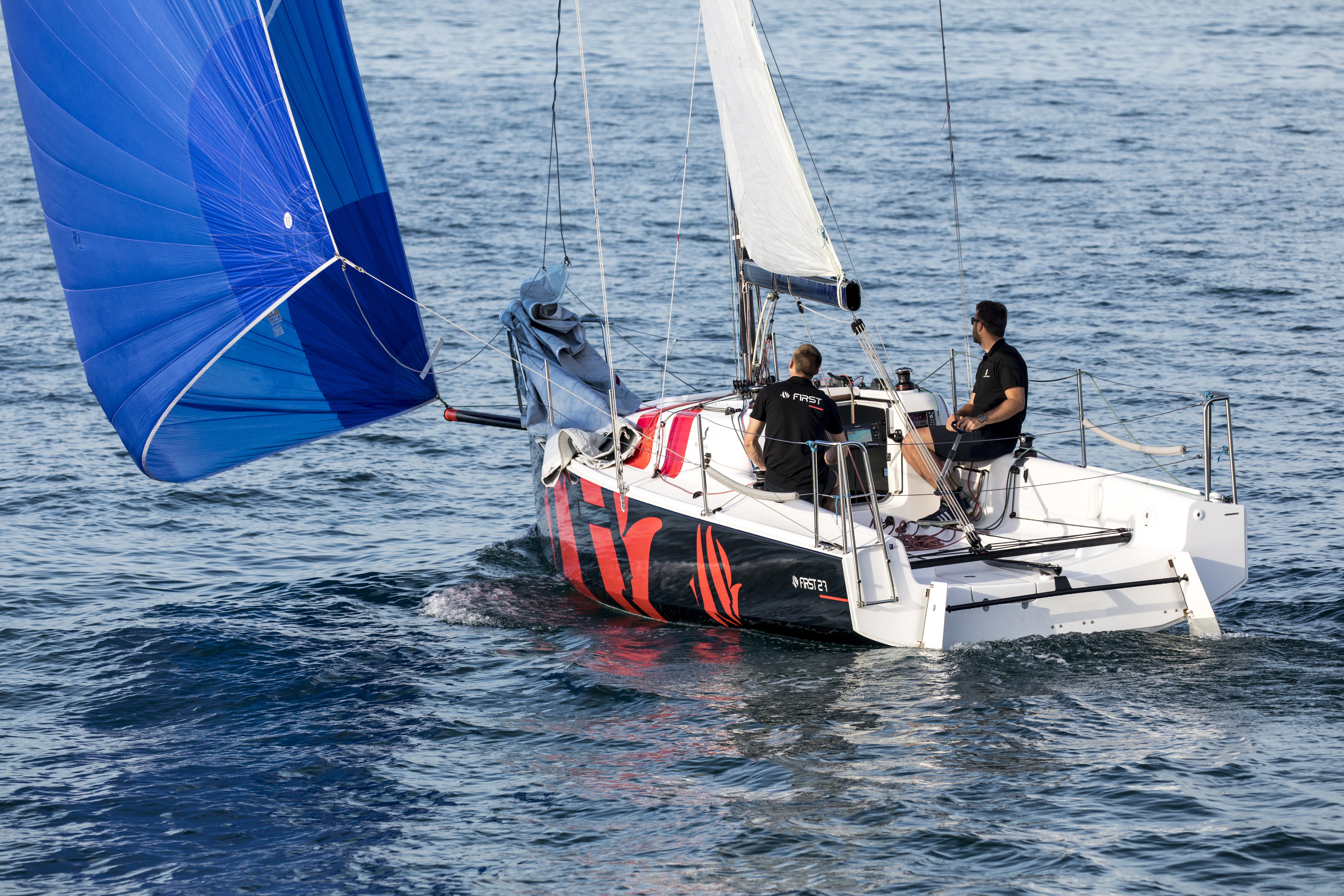 The First 27 was designed for offshore racing by naval architect Sam Manuard, taking inspiration from his own racing experience. Featuring a hard chine as far as the stem, vertical sides, a good beam on the waterline and twin rudders, she has all the makings of a robust competitive boat. Her hull shape, carbon rig, and deep draught lead keel, combine to make here remarkably stable. With her keel taking up 50% of her weight, she is an incredibly powerful yacht. The cockpit is spacious and comfortable, and has two foot chocks over the full length. With a manually operated hydraulic jack to lift the keel, the First 27 is easy to tow.