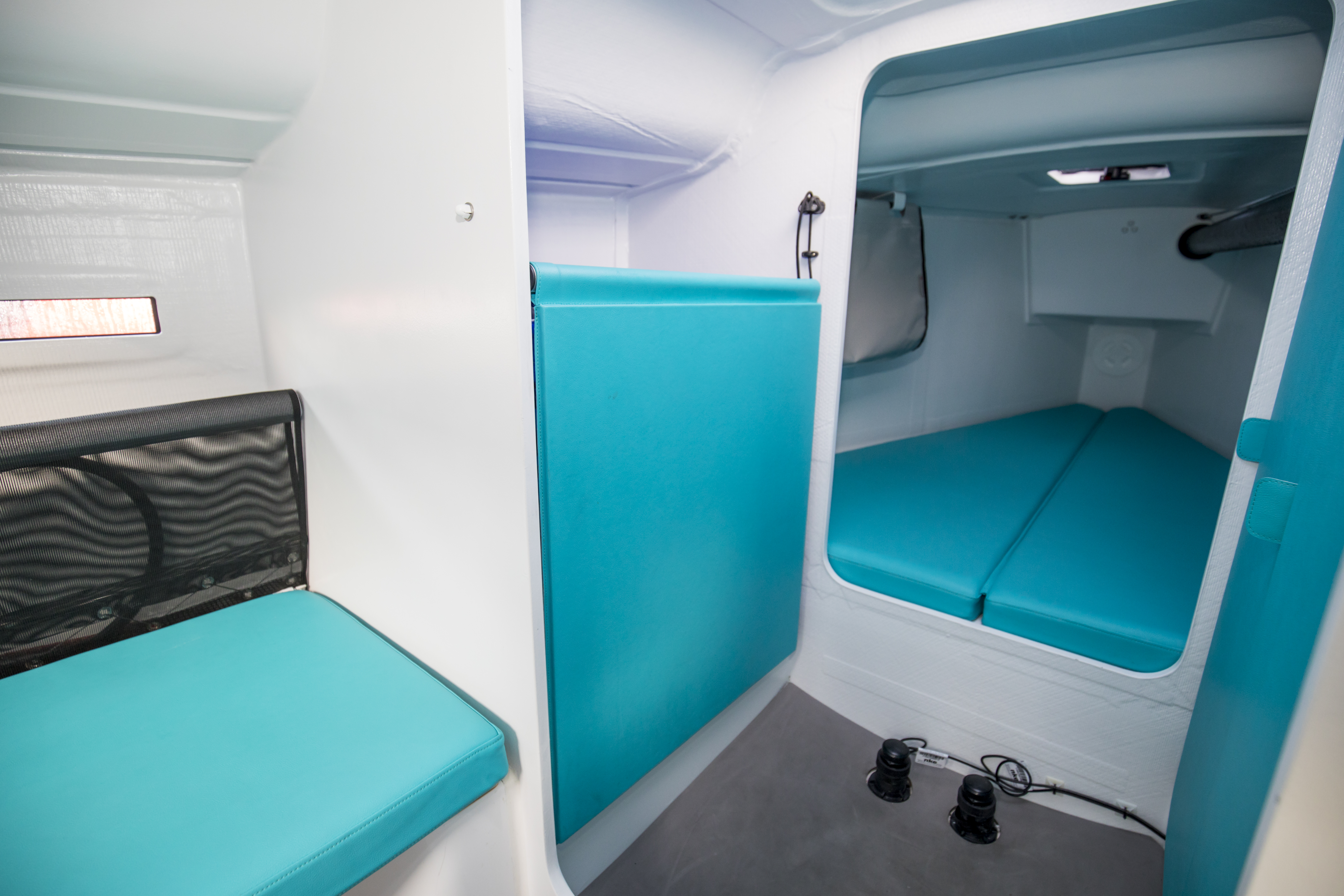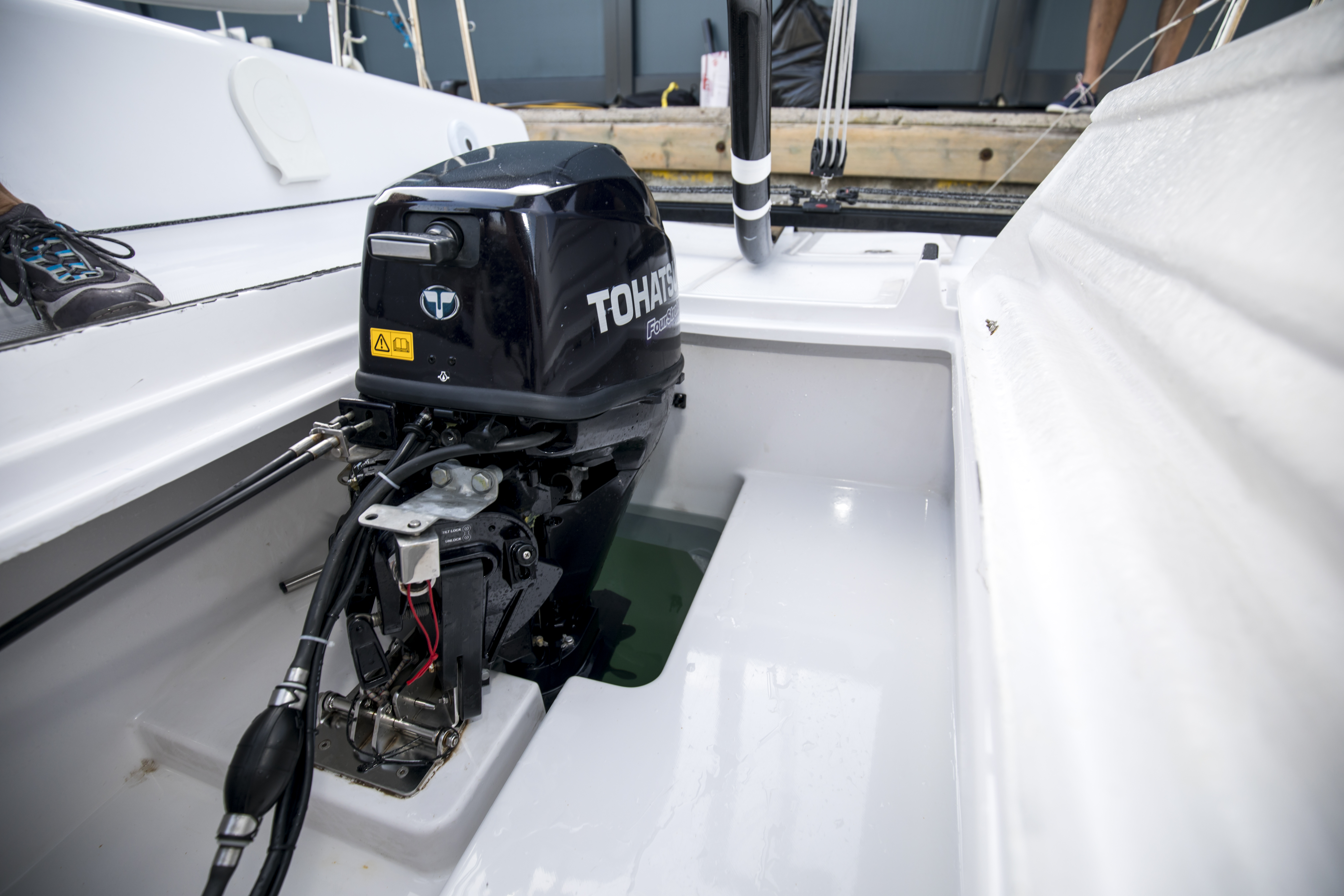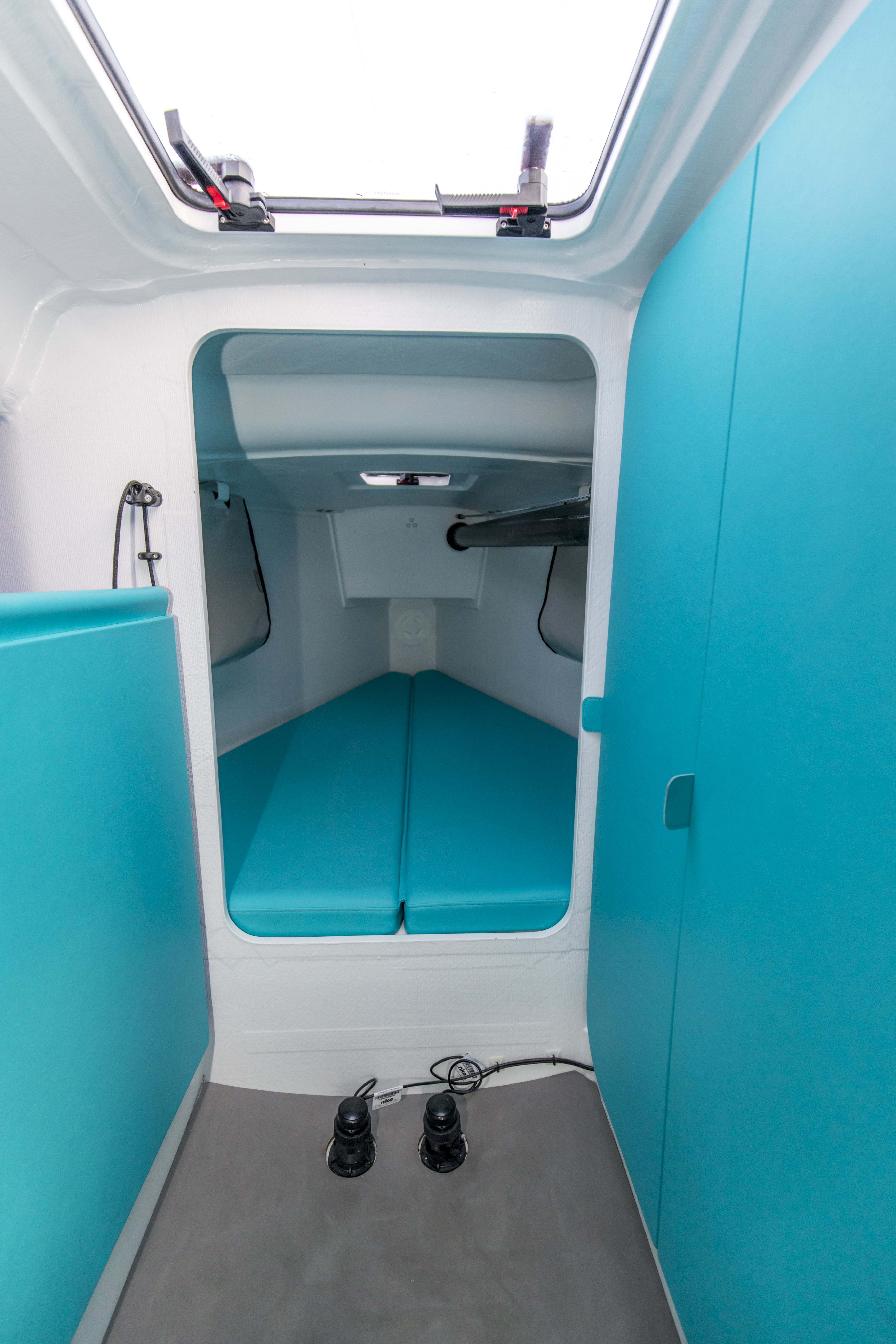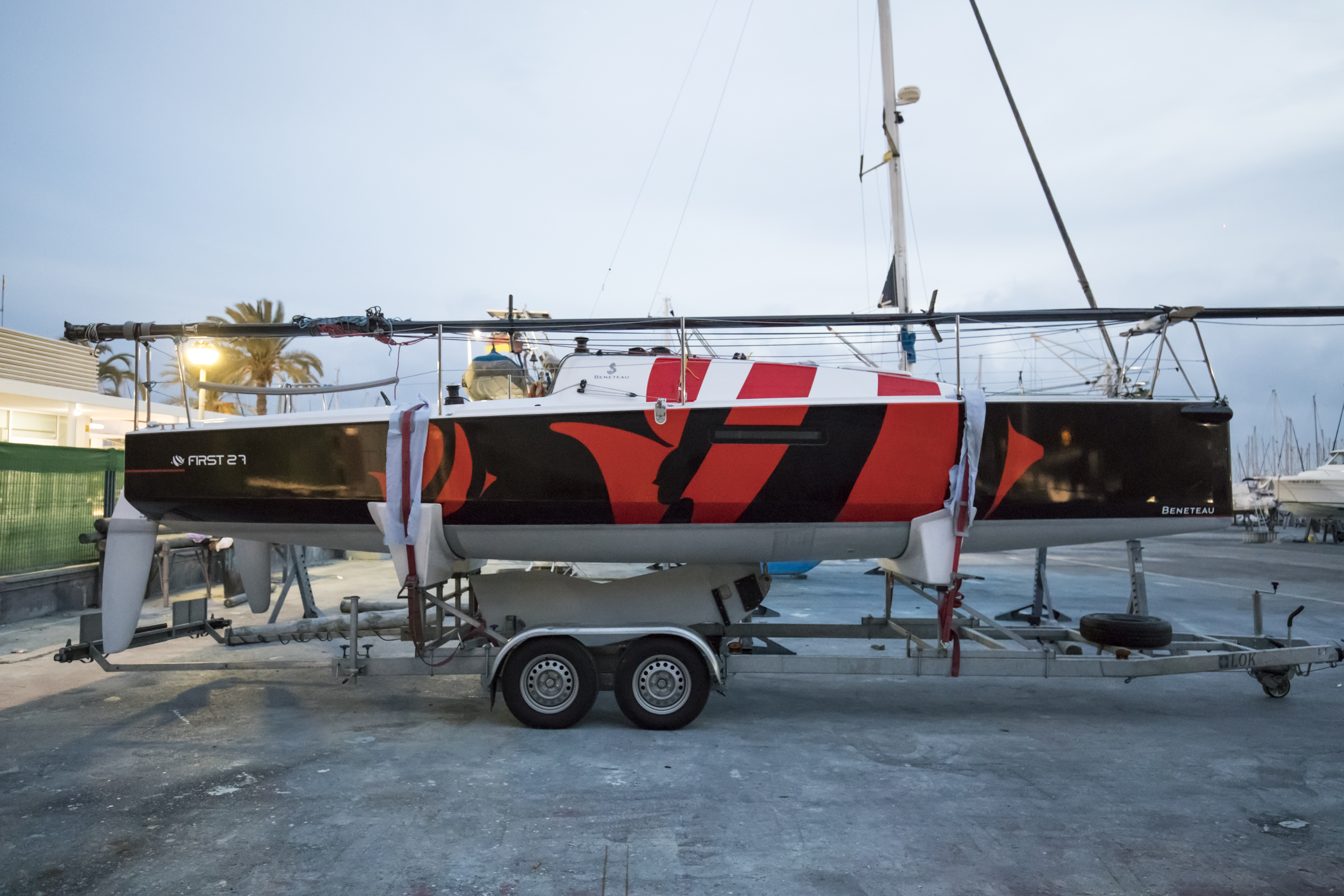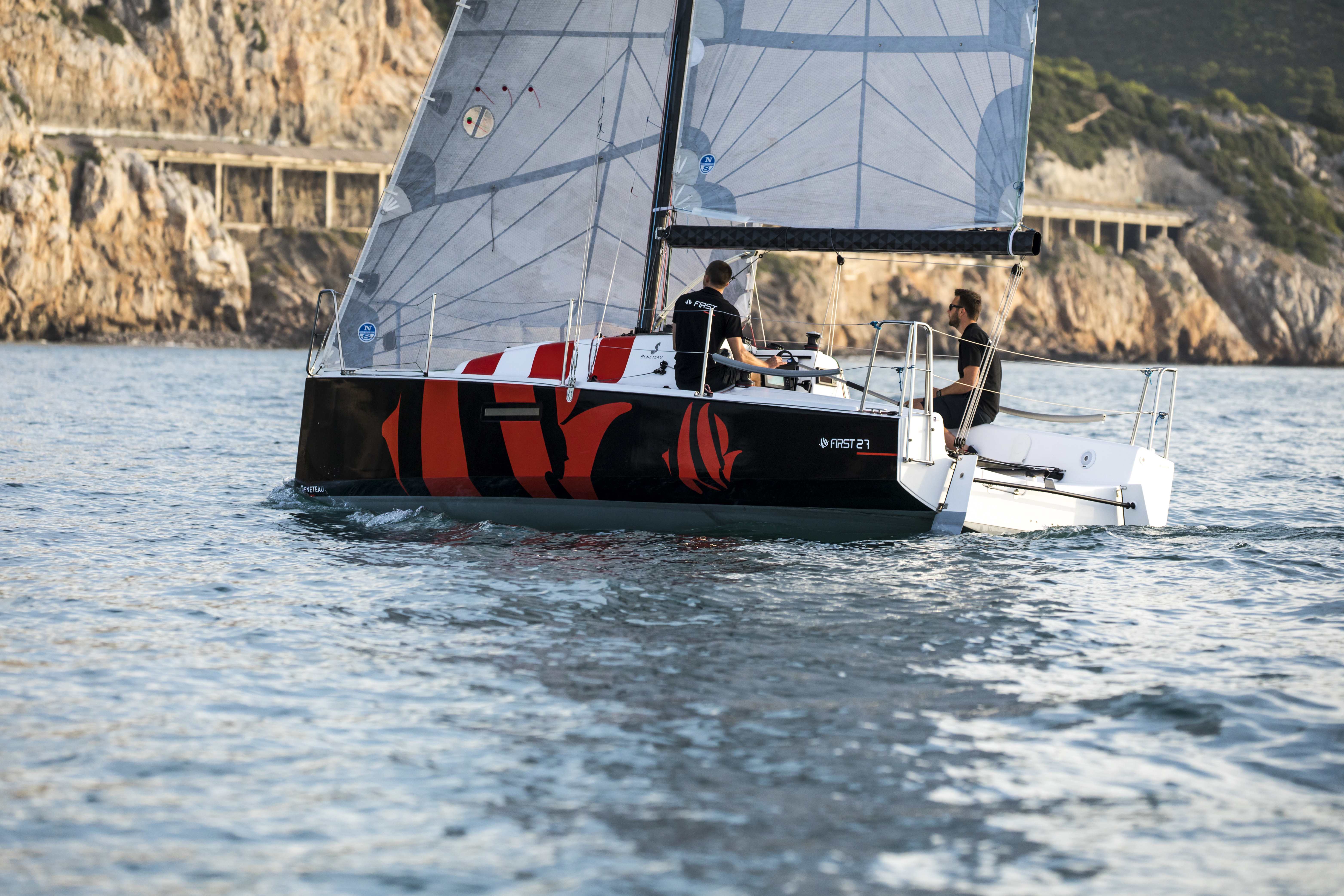 The First 27 was designed for offshore racing by naval architect Sam Manuard, taking inspiration from his own racing experience. Featuring a hard chine as far as the stem, vertical sides, a good beam on the waterline and twin rudders, she has all the makings of a robust competitive boat. Her hull shape, carbon rig, and deep draught lead keel, combine to make here remarkably stable. With her keel taking up 50% of her weight, she is an incredibly powerful yacht. The cockpit is spacious and comfortable, and has two foot chocks over the full length. With a manually operated hydraulic jack to lift the keel, the First 27 is easy to tow.