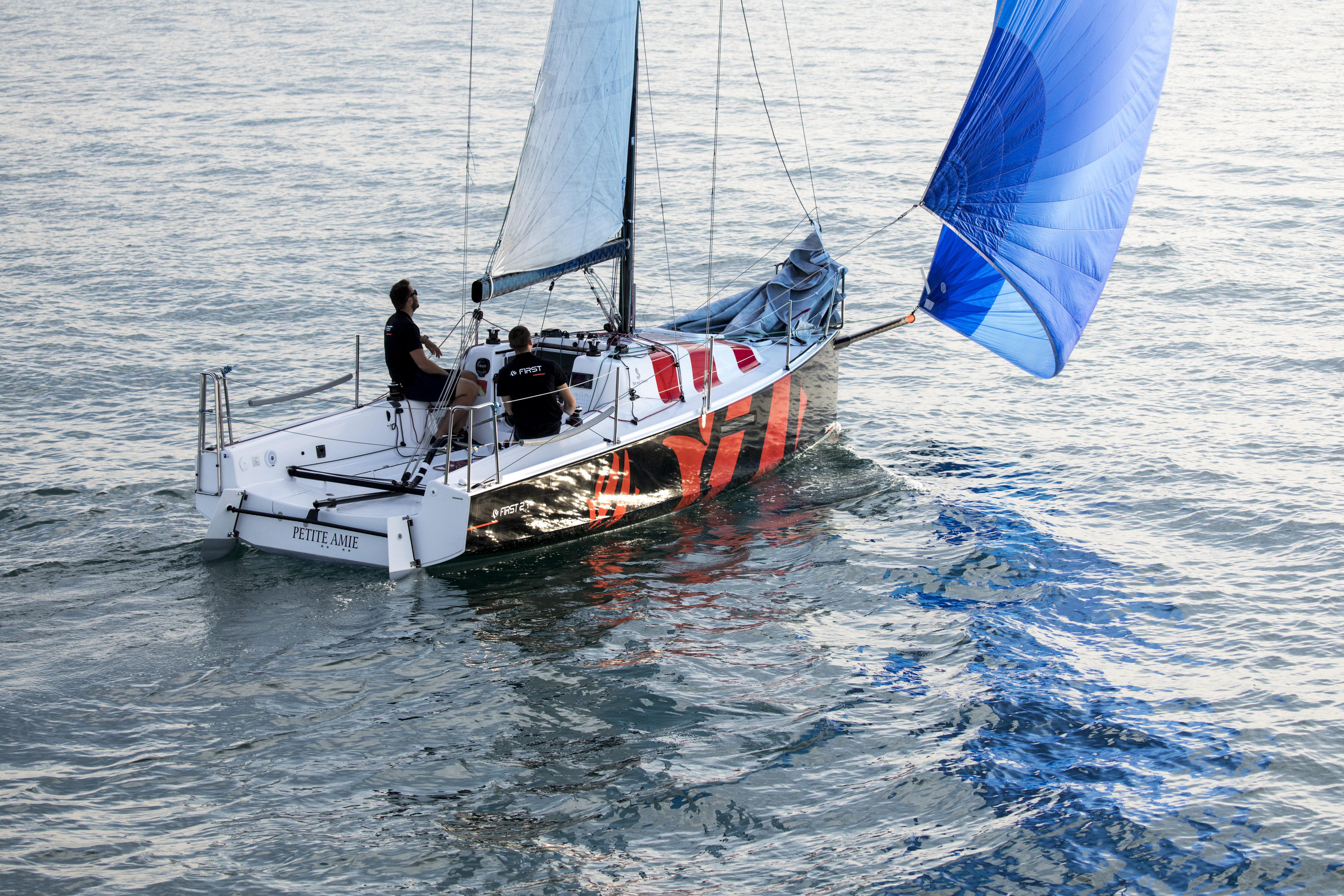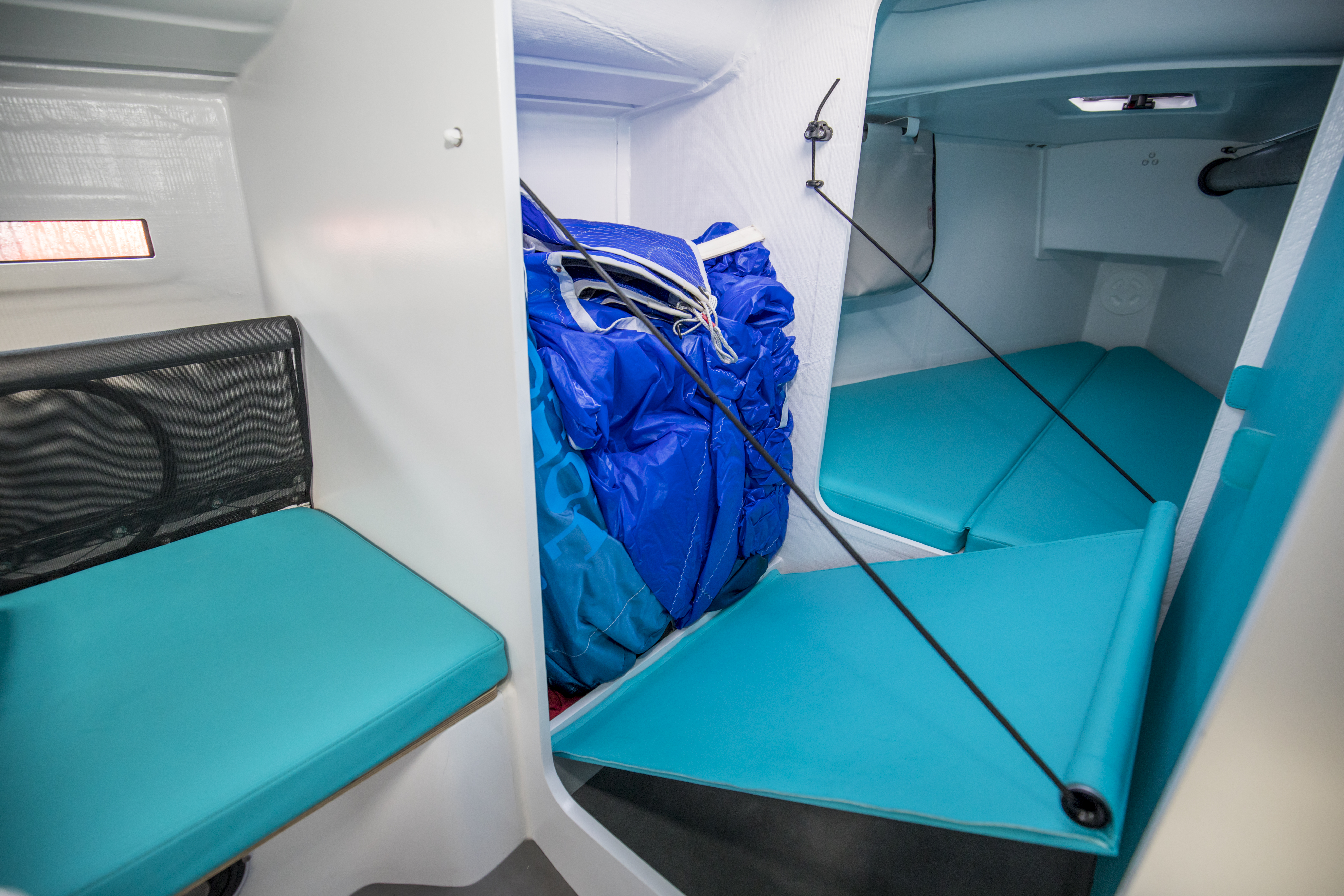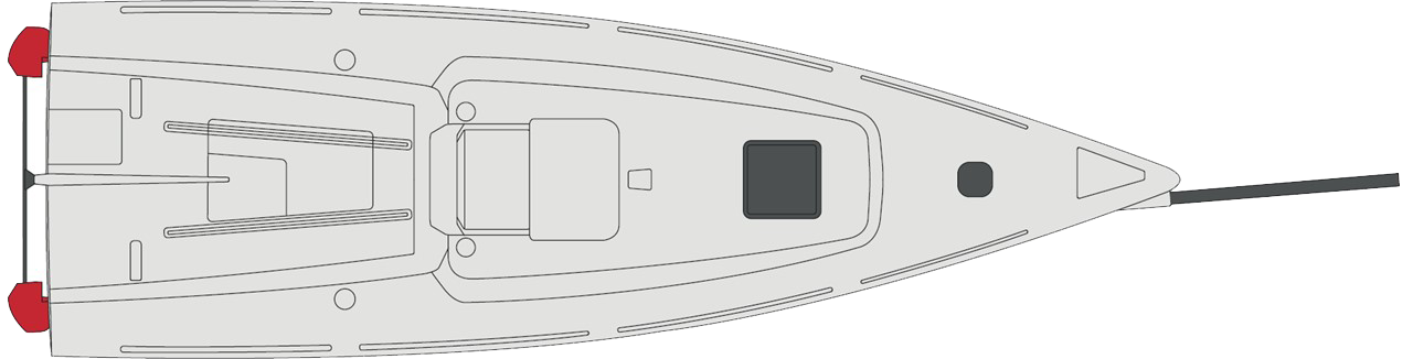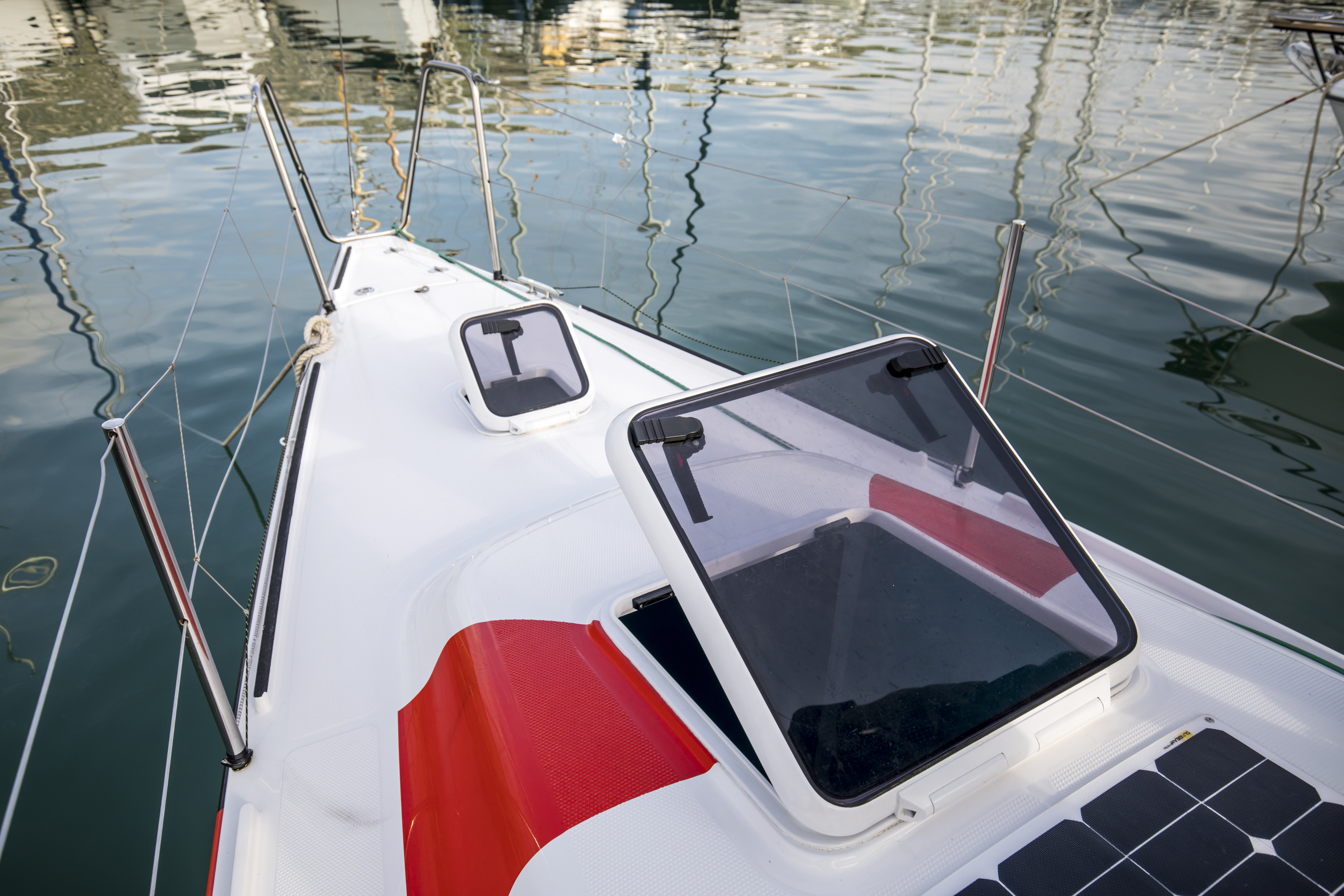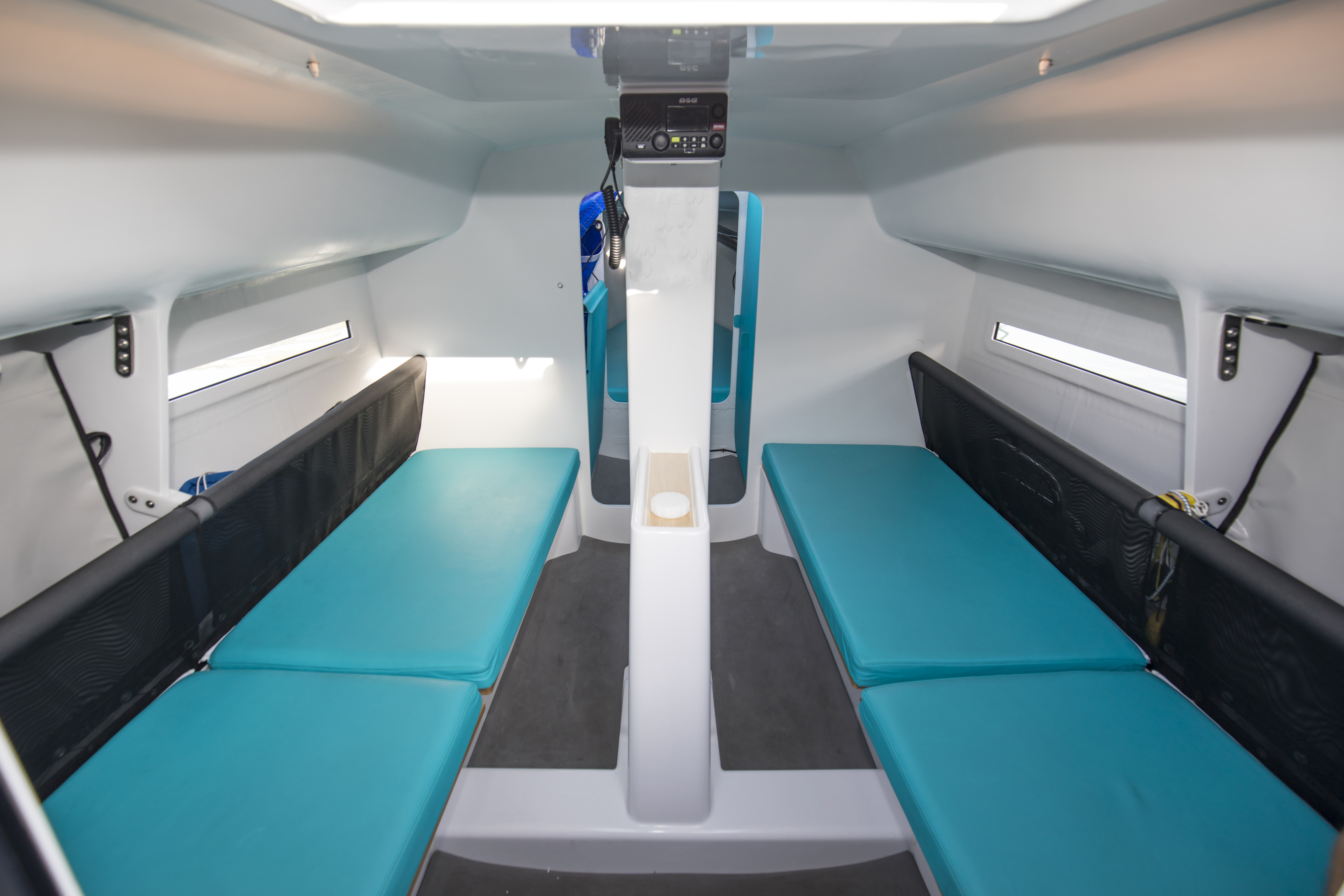 The First 27 was designed for offshore racing by naval architect Sam Manuard, taking inspiration from his own racing experience. Featuring a hard chine as far as the stem, vertical sides, a good beam on the waterline and twin rudders, she has all the makings of a robust competitive boat. Her hull shape, carbon rig, and deep draught lead keel, combine to make here remarkably stable. With her keel taking up 50% of her weight, she is an incredibly powerful yacht. The cockpit is spacious and comfortable, and has two foot chocks over the full length. With a manually operated hydraulic jack to lift the keel, the First 27 is easy to tow.