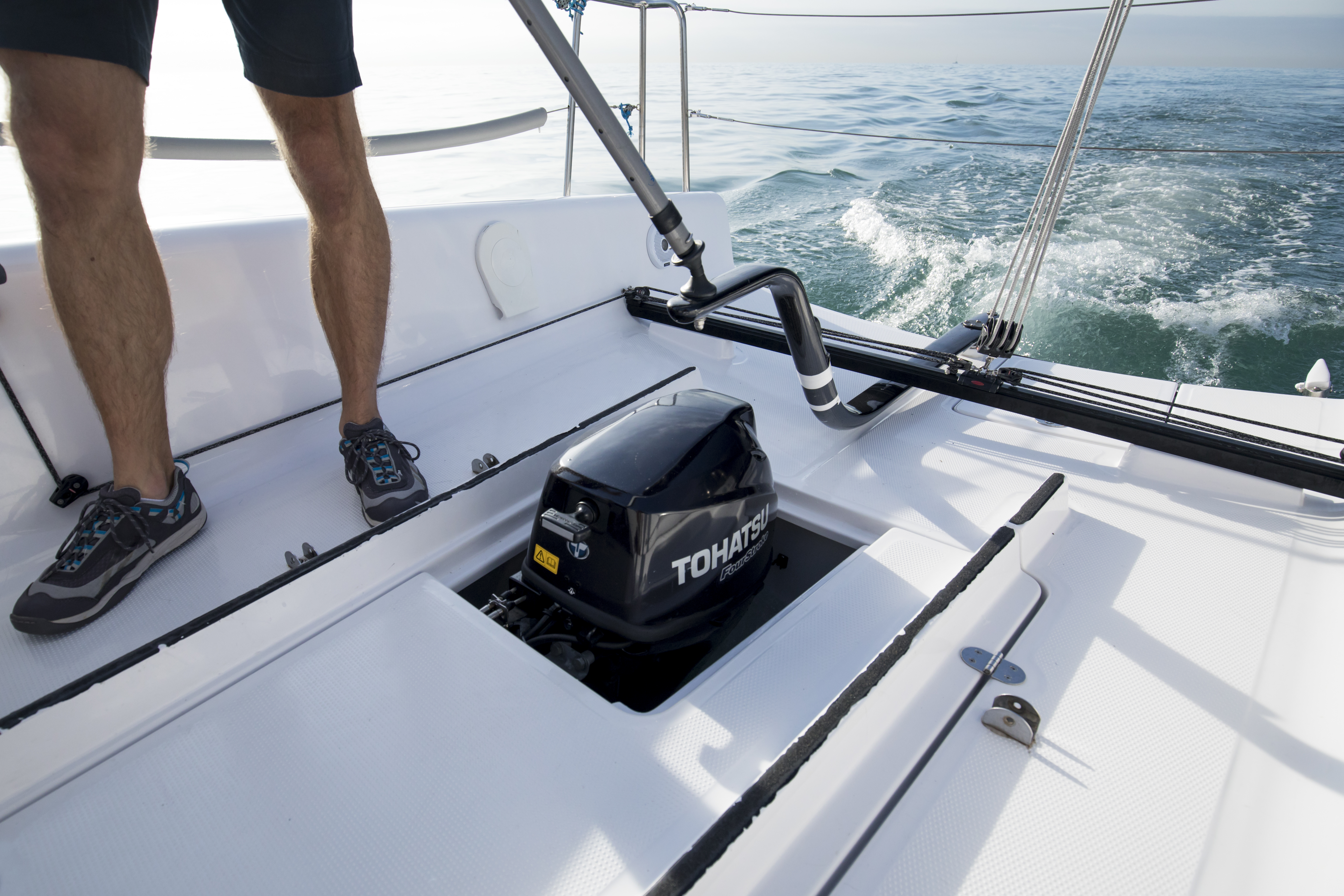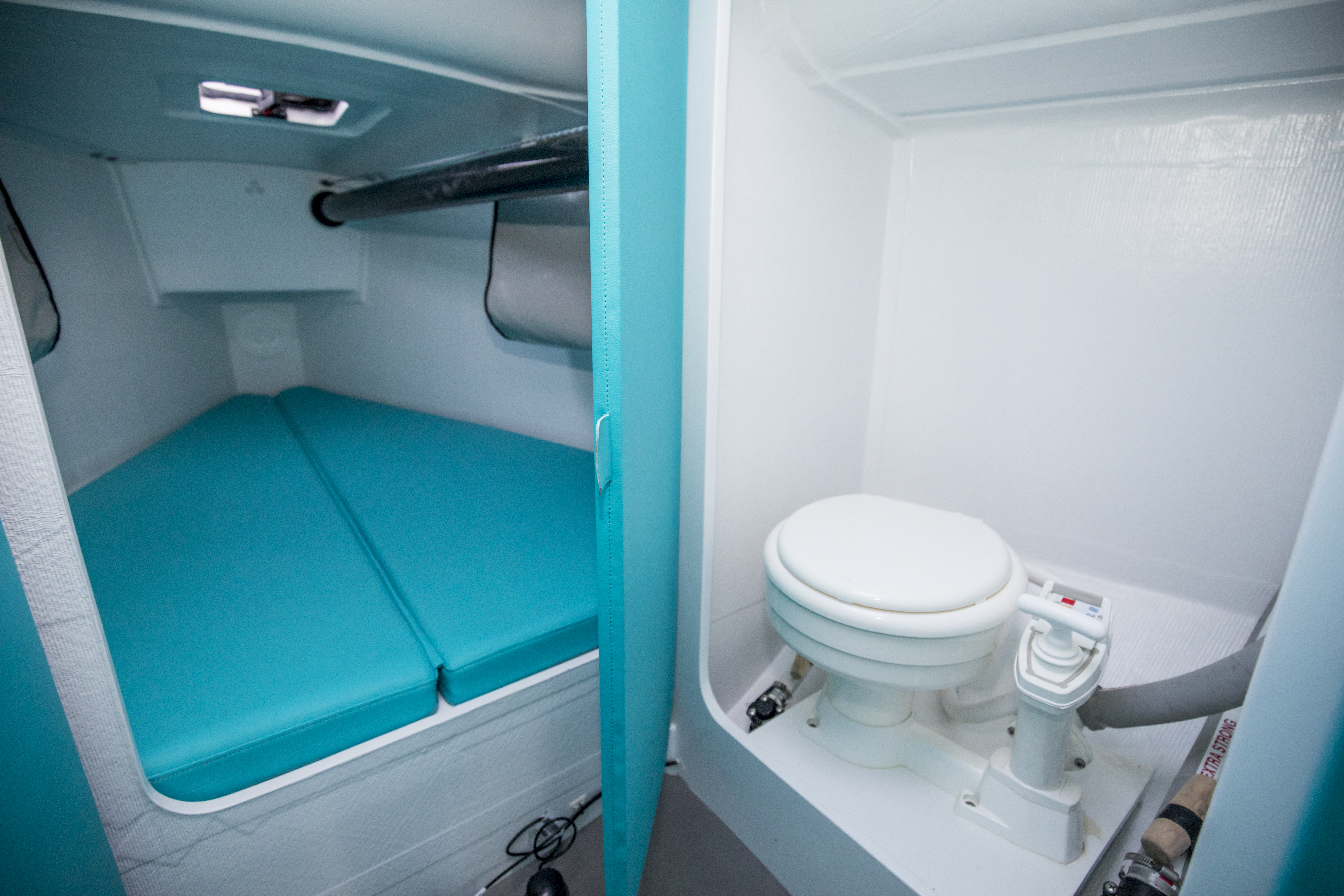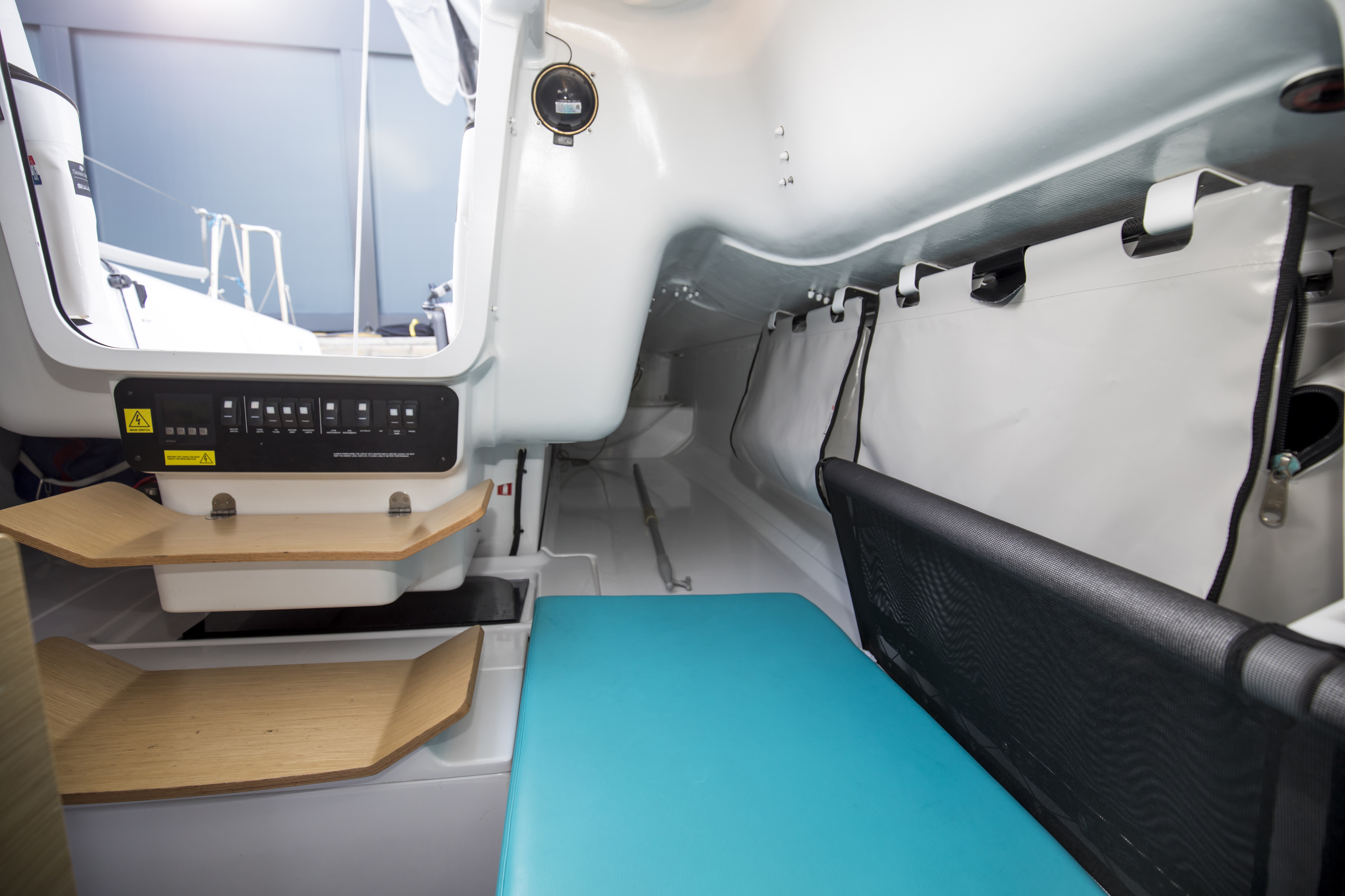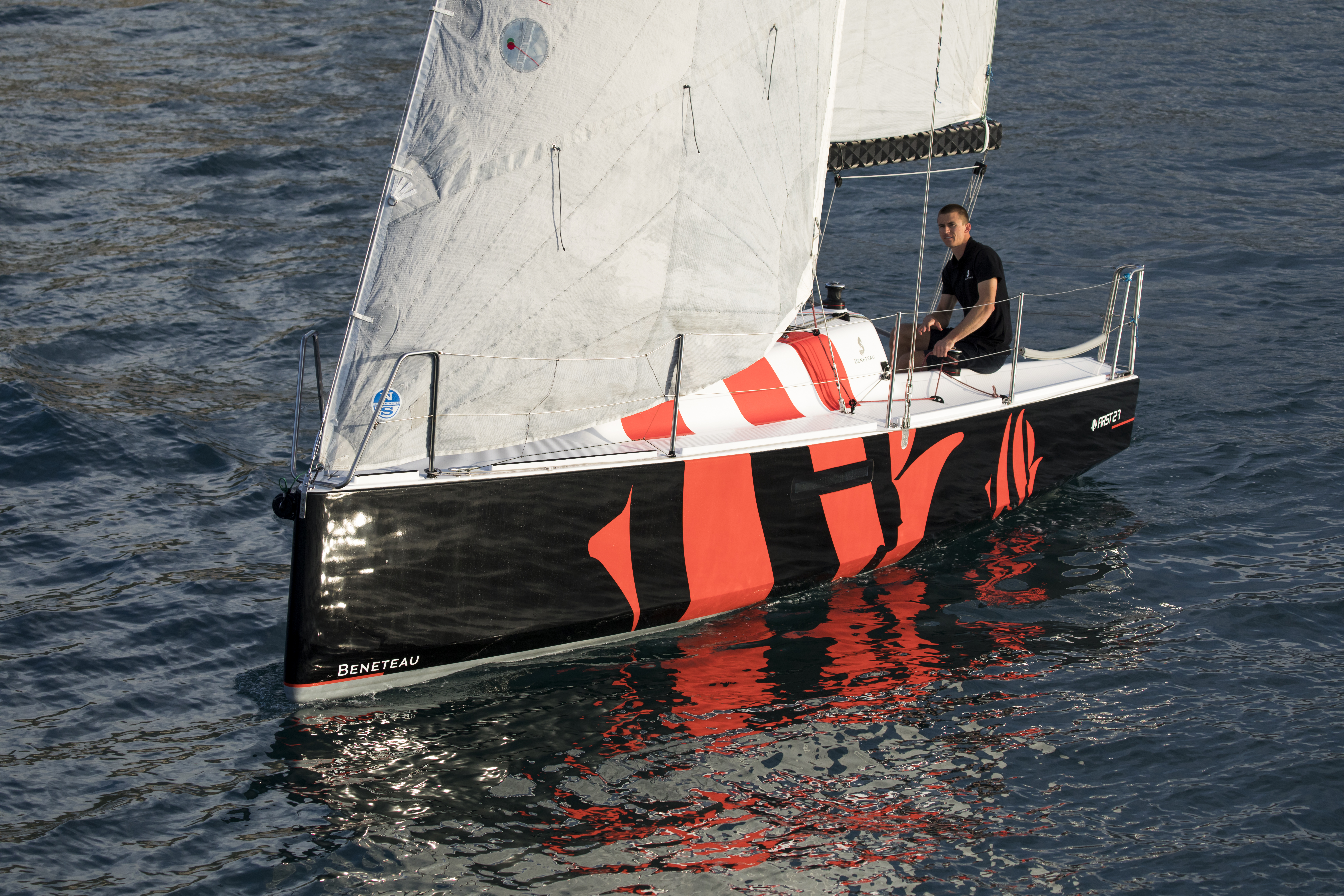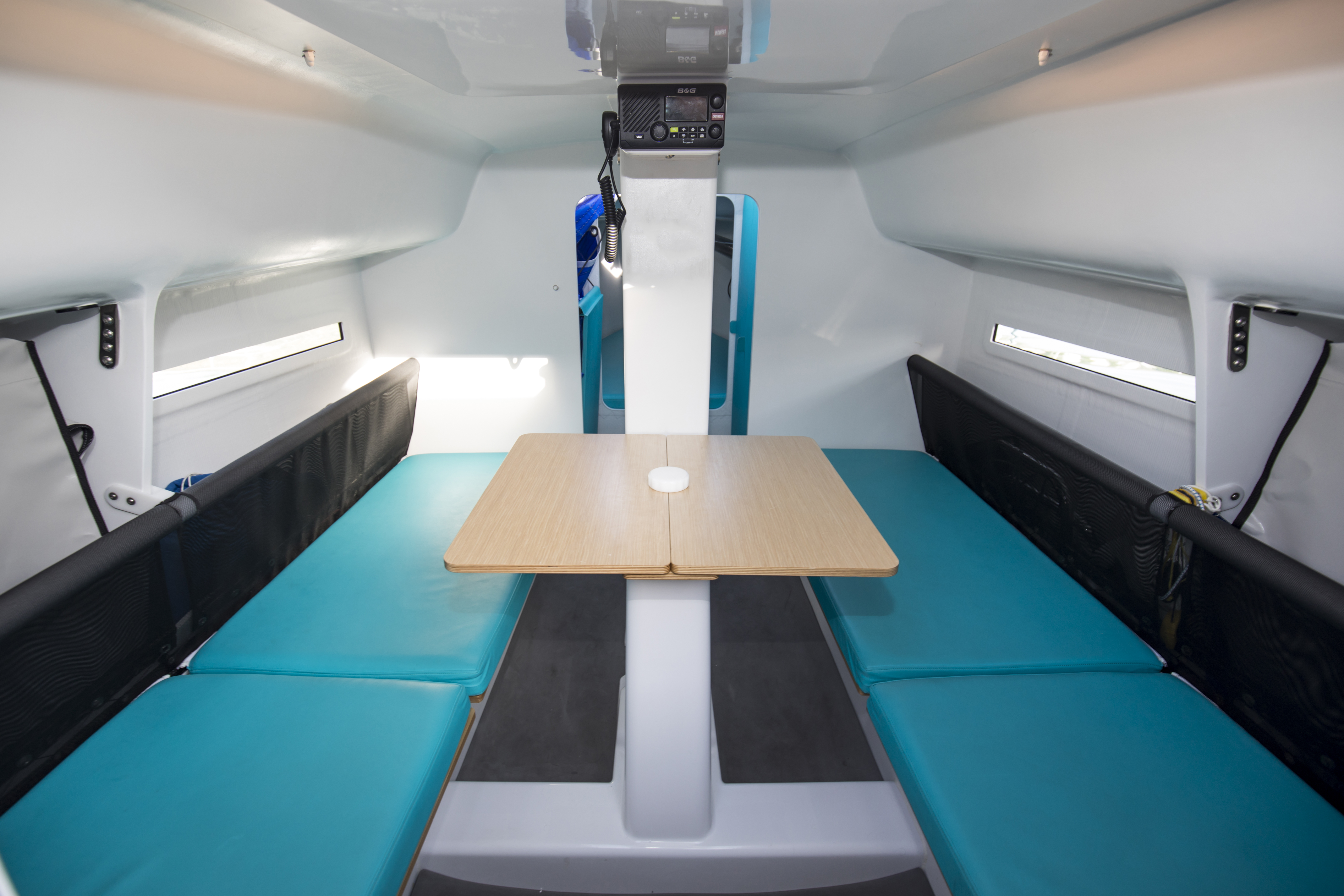 The First 27 was designed for offshore racing by naval architect Sam Manuard, taking inspiration from his own racing experience. Featuring a hard chine as far as the stem, vertical sides, a good beam on the waterline and twin rudders, she has all the makings of a robust competitive boat. Her hull shape, carbon rig, and deep draught lead keel, combine to make here remarkably stable. With her keel taking up 50% of her weight, she is an incredibly powerful yacht. The cockpit is spacious and comfortable, and has two foot chocks over the full length. With a manually operated hydraulic jack to lift the keel, the First 27 is easy to tow.