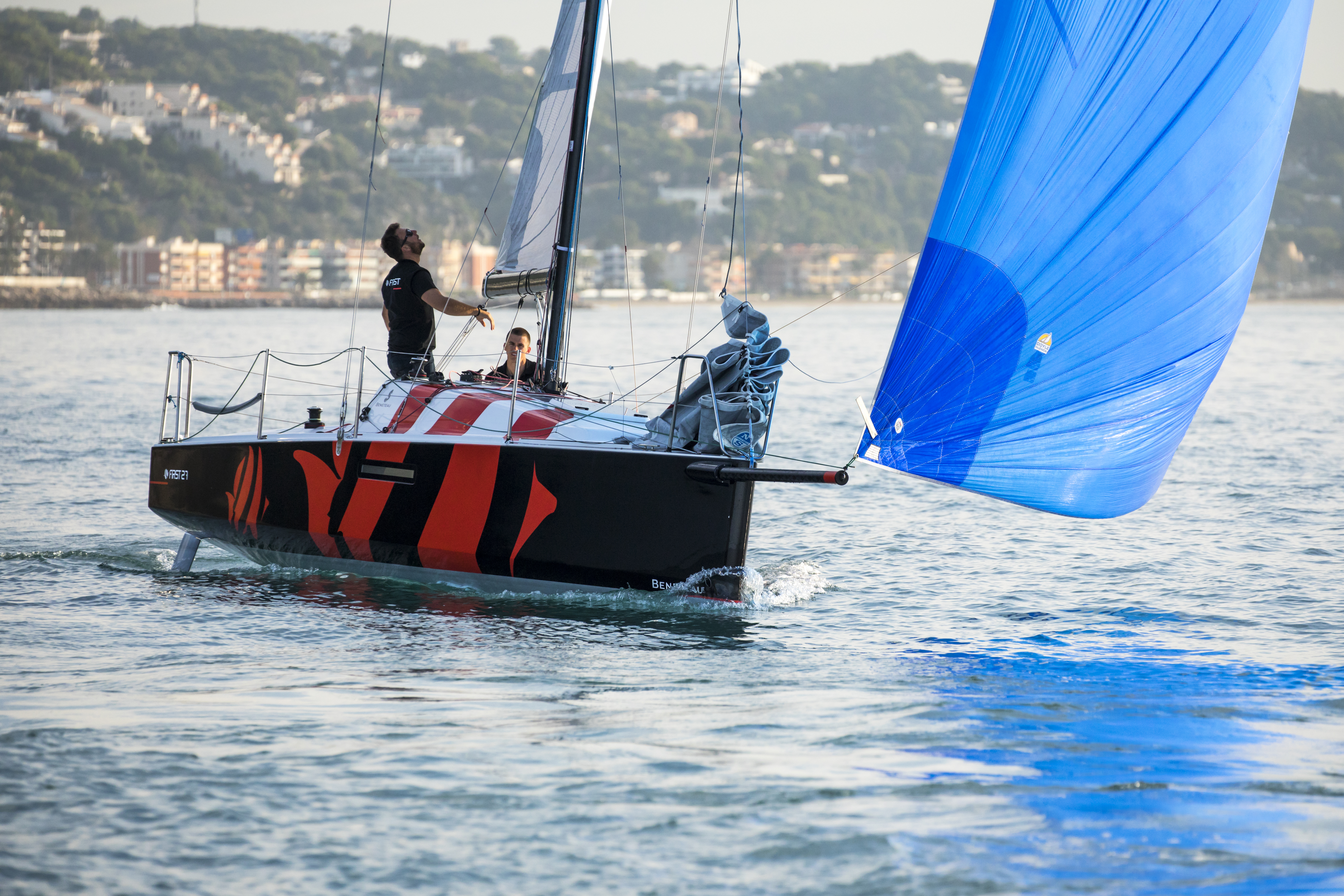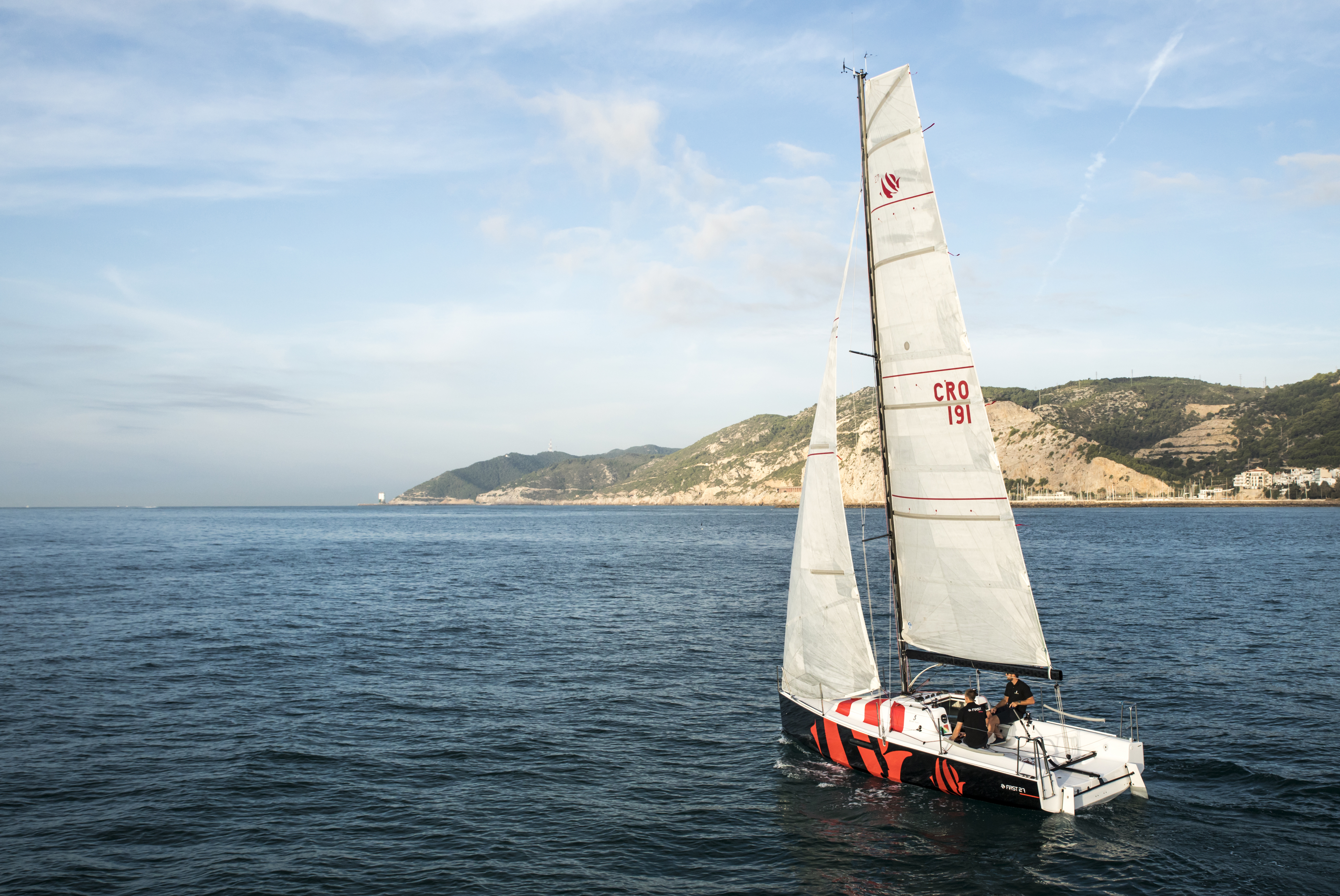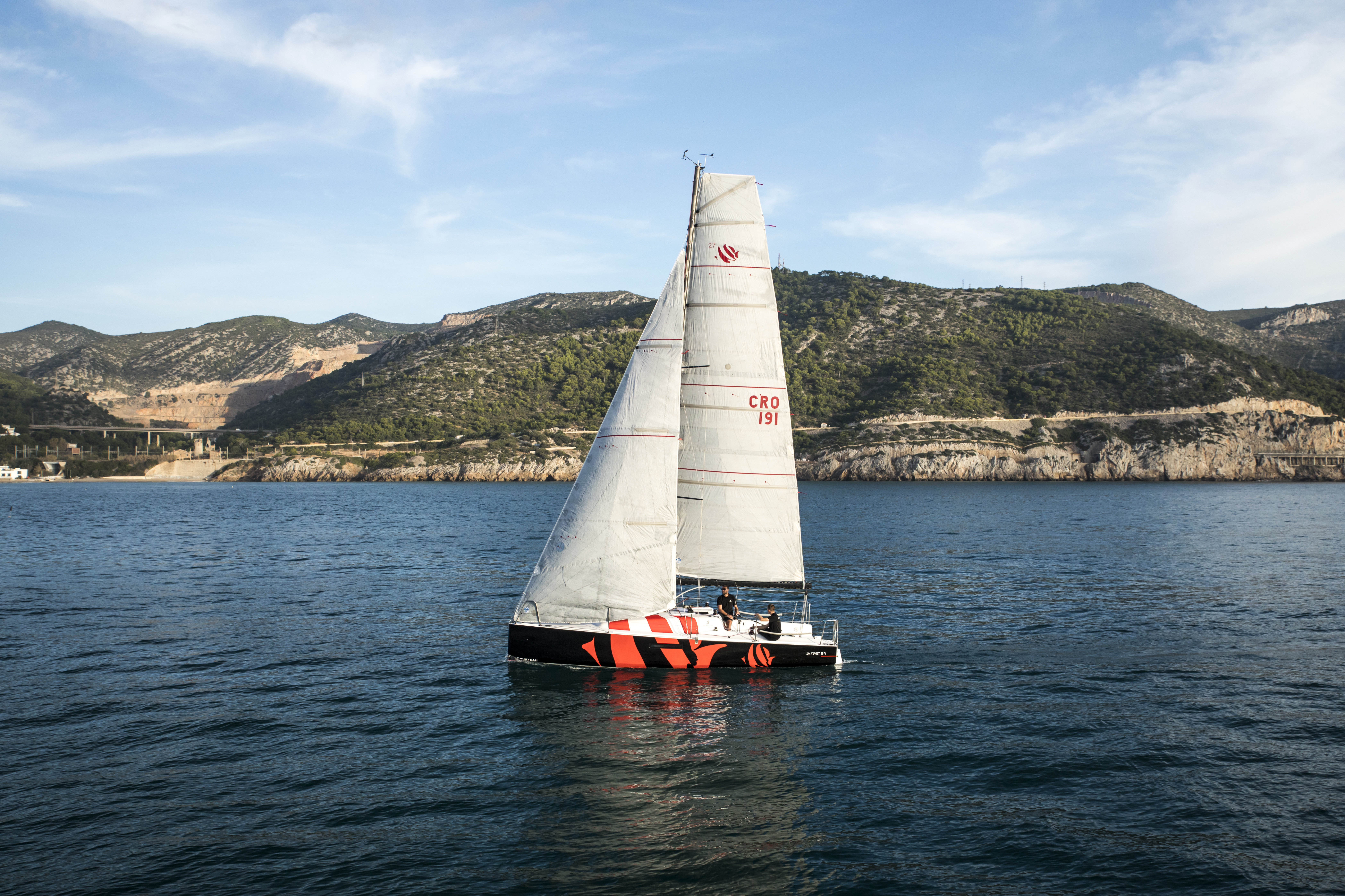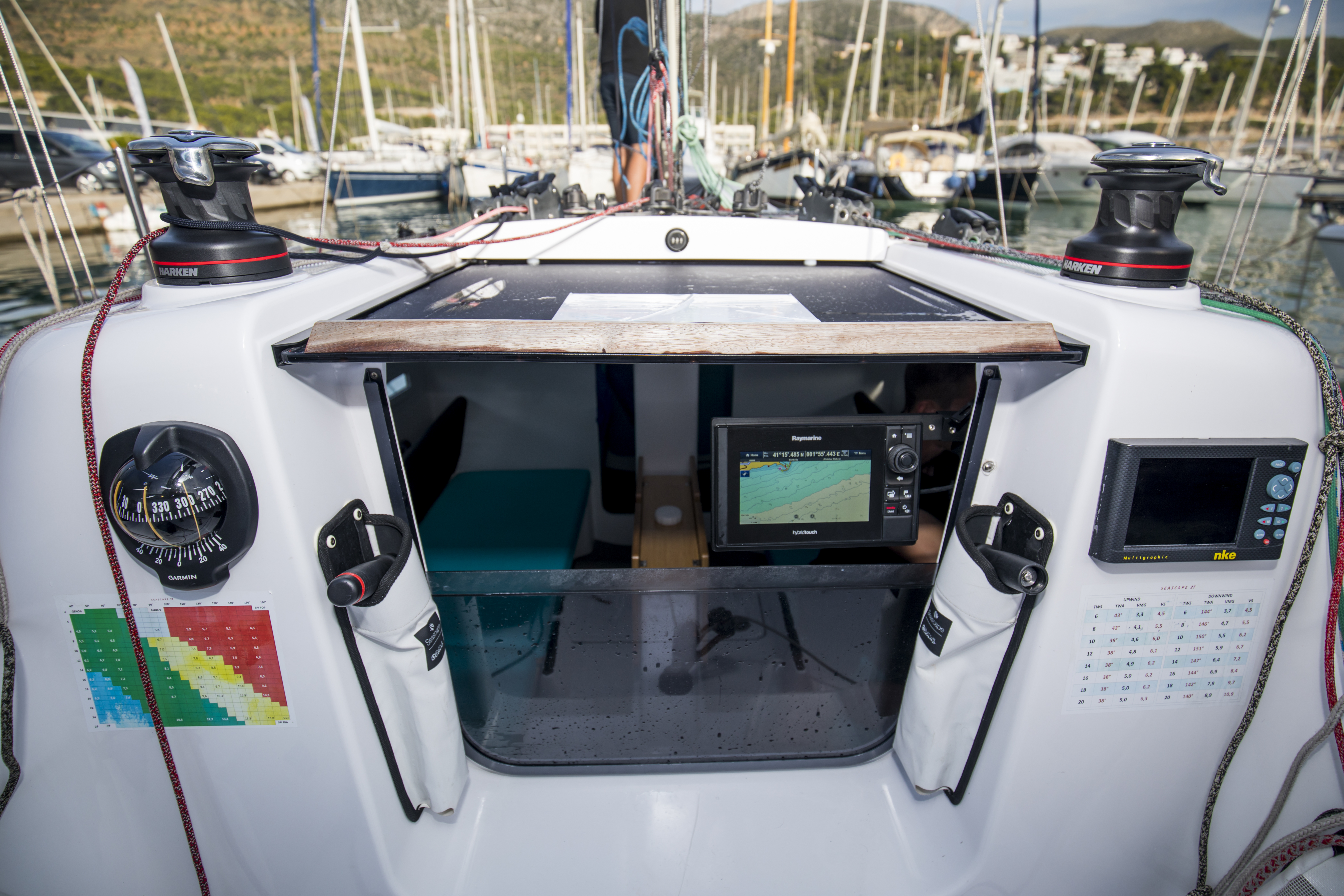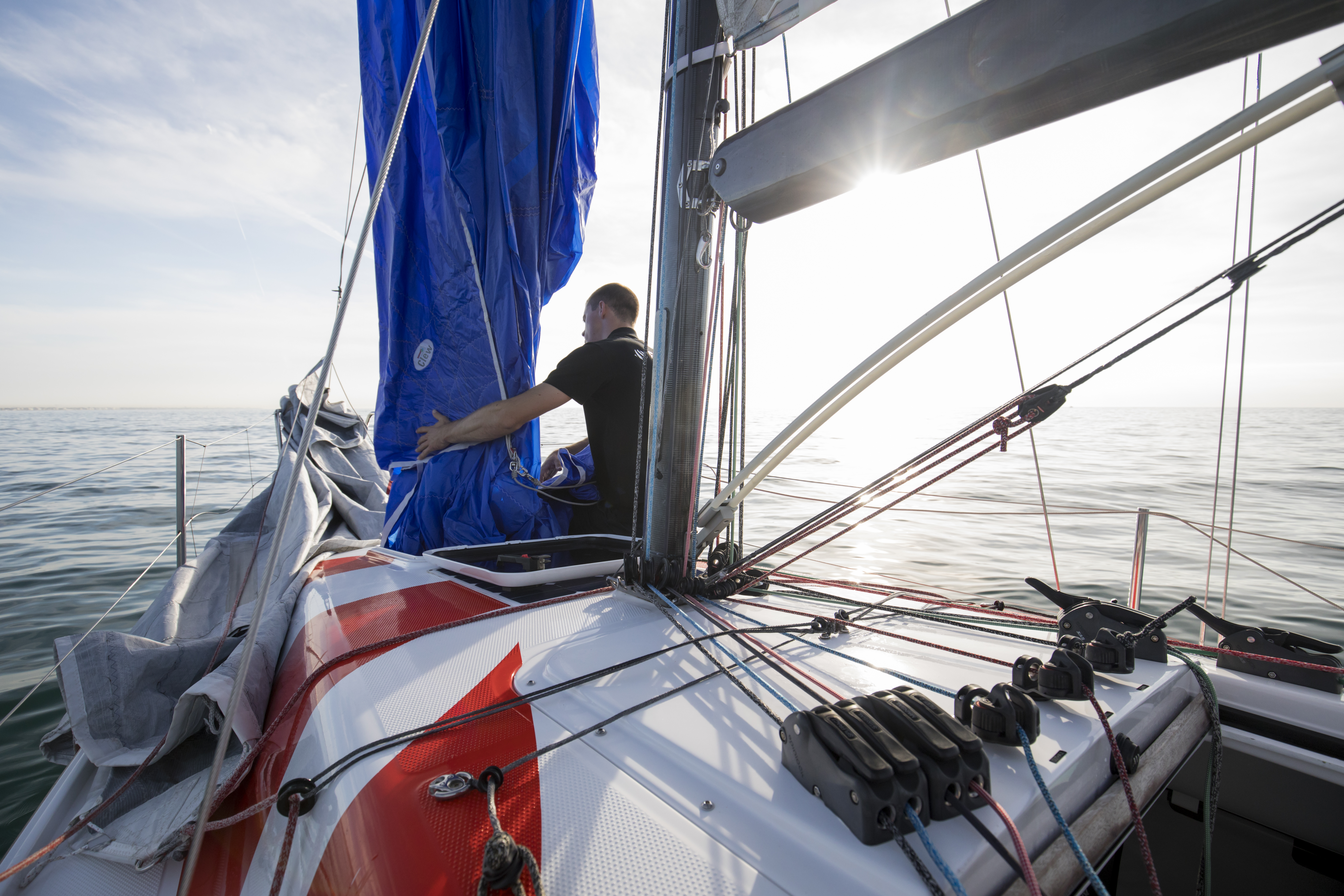 The First 27 was designed for offshore racing by naval architect Sam Manuard, taking inspiration from his own racing experience. Featuring a hard chine as far as the stem, vertical sides, a good beam on the waterline and twin rudders, she has all the makings of a robust competitive boat. Her hull shape, carbon rig, and deep draught lead keel, combine to make here remarkably stable. With her keel taking up 50% of her weight, she is an incredibly powerful yacht. The cockpit is spacious and comfortable, and has two foot chocks over the full length. With a manually operated hydraulic jack to lift the keel, the First 27 is easy to tow.