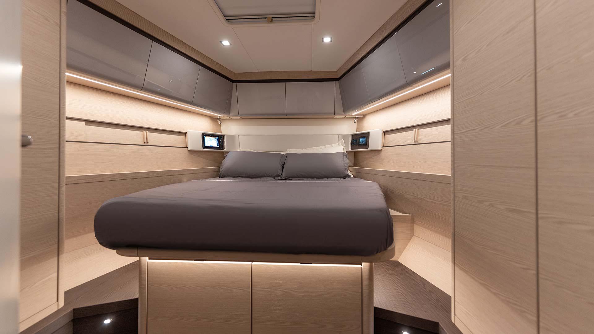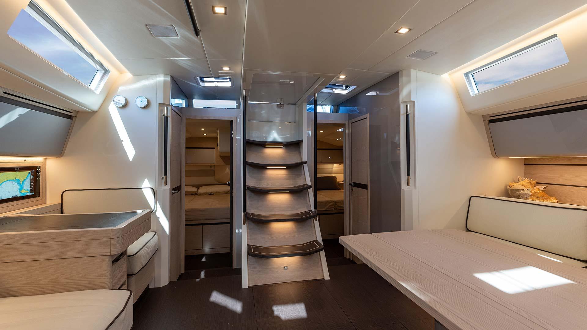 L’ ICE 62 Targa, è un vero fast cruiser di altissima qualità con uno sfruttamento incredibile dello spazio, con una linea intrigante che riprende gli stilemi tipici del cantiere inserendo dettagli funzionali come il distintivo rollbar con T top in carbonio che si distingue dai tradizionali bimini e permette una coperta sgombra, sicura e pulita senza rinunciare.