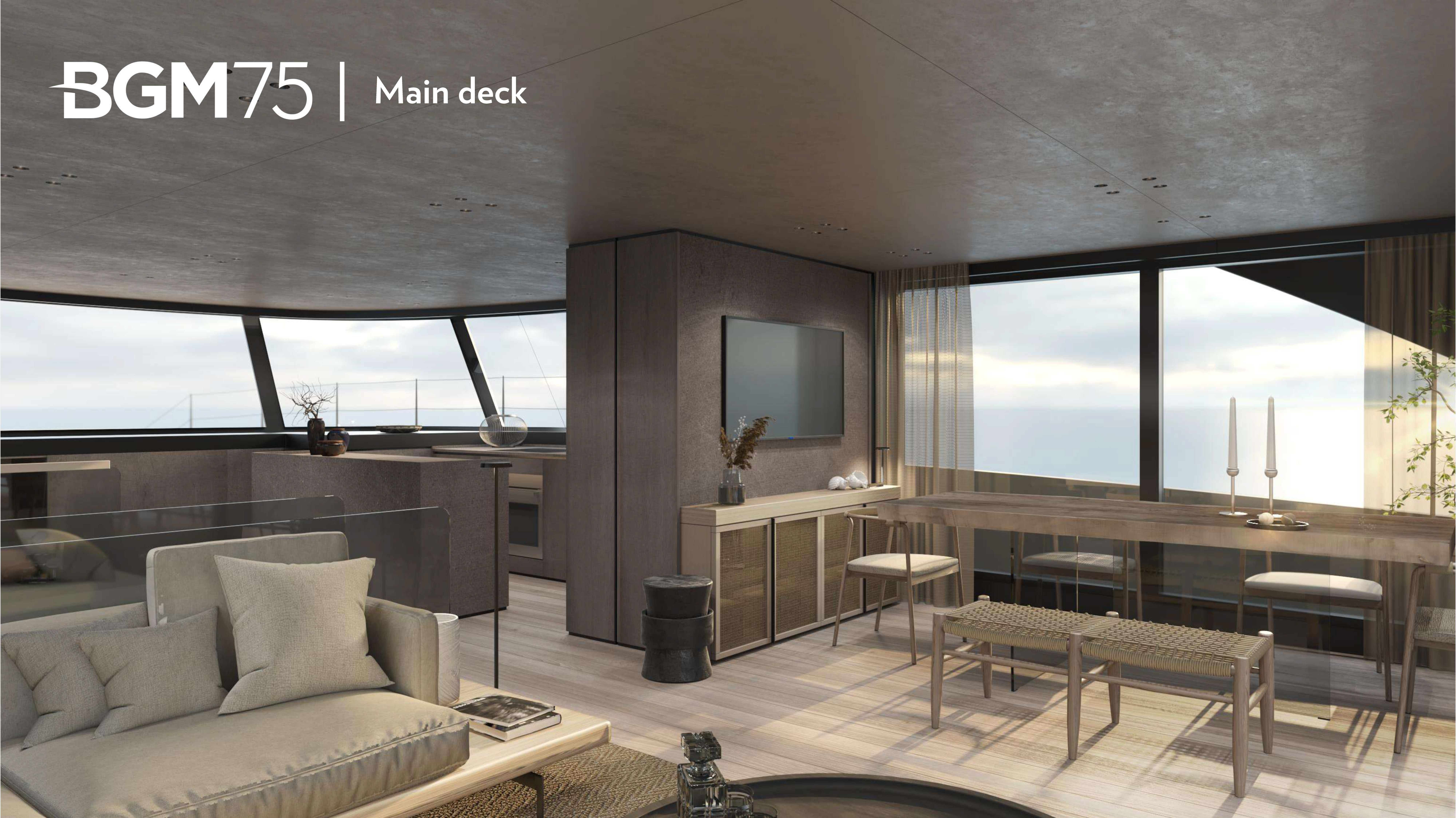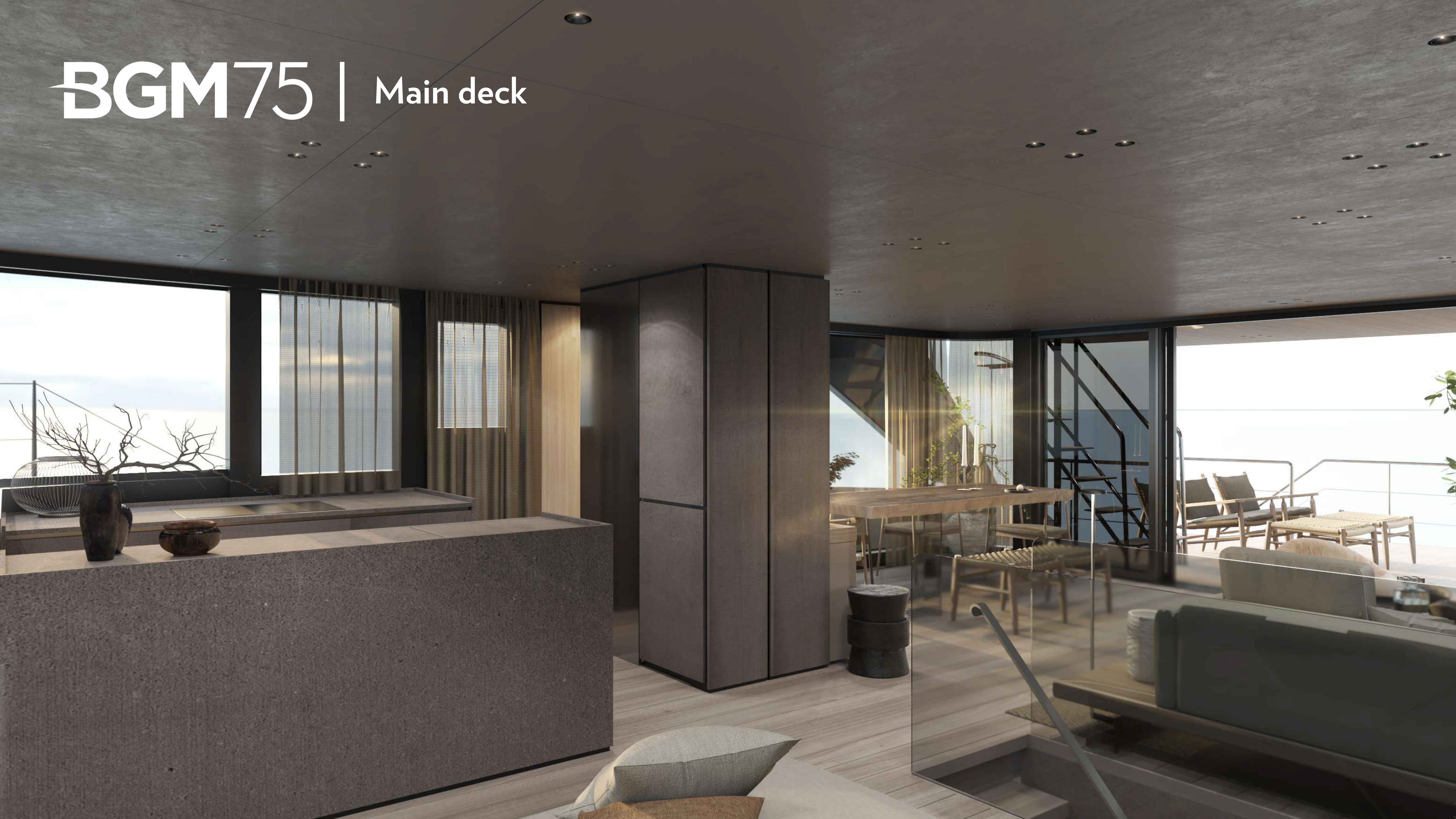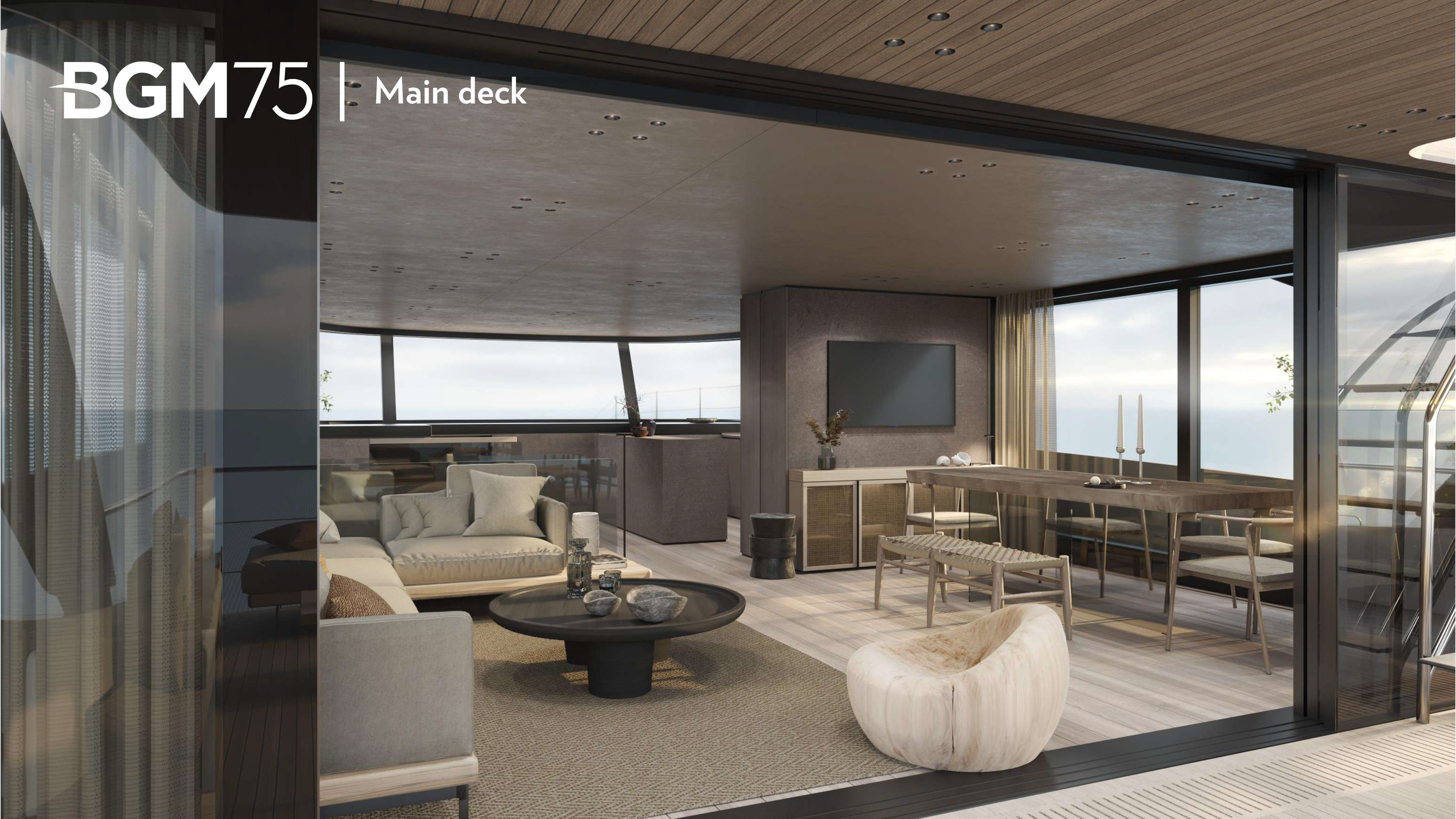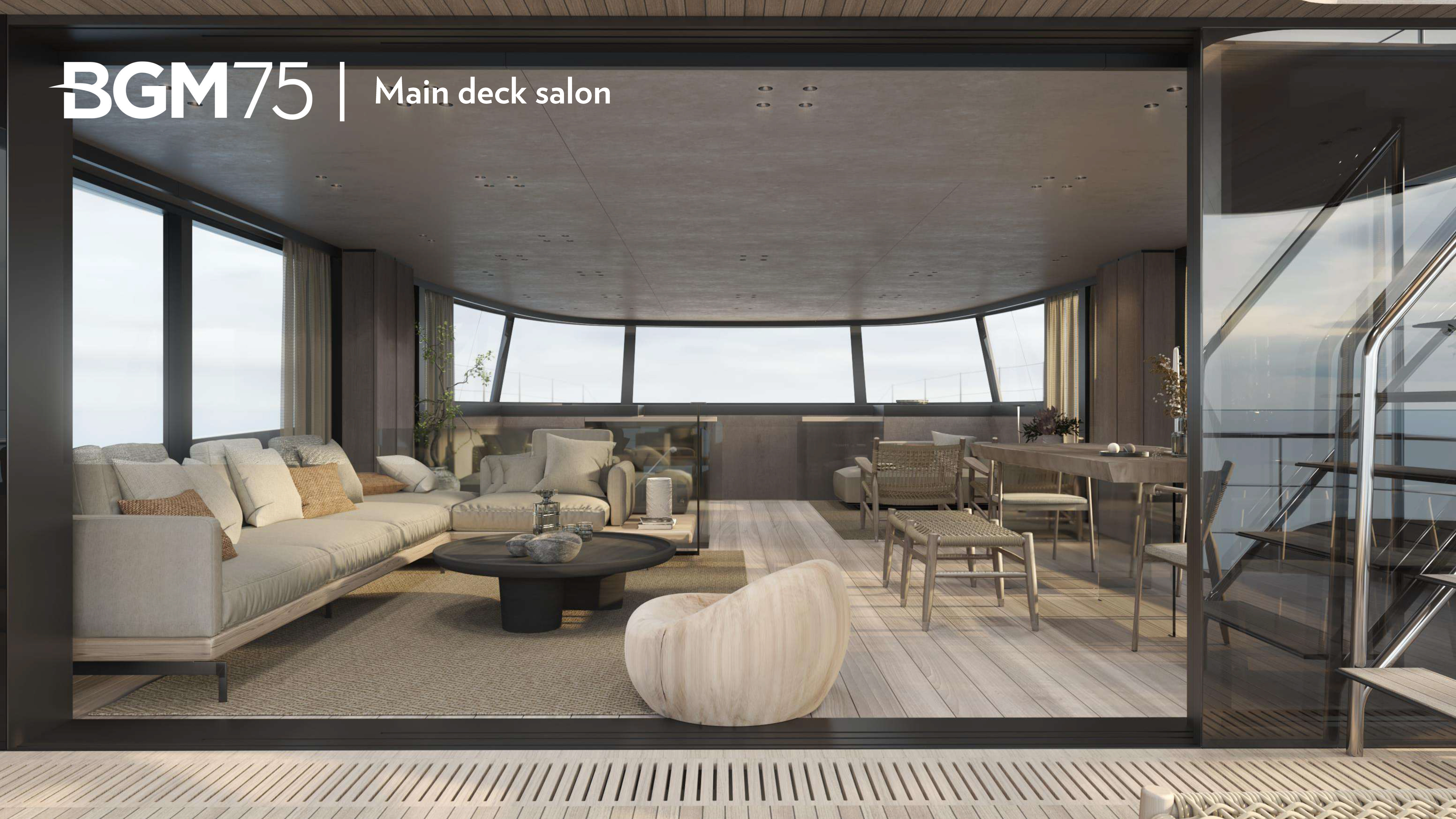 The BGM75 hull design delivers excellent seaworthy credentials, and protective sidewalls result from extra sturdy construction. A spacious beach area and generously sized saloon create exceptional comfort onboard. And movement around the yacht is made effortless with connected cockpits, optimised helm station position, and wide visibility. Inside, the sumptuous interior design boasts meticulous attention to detail and exudes understated elegance.