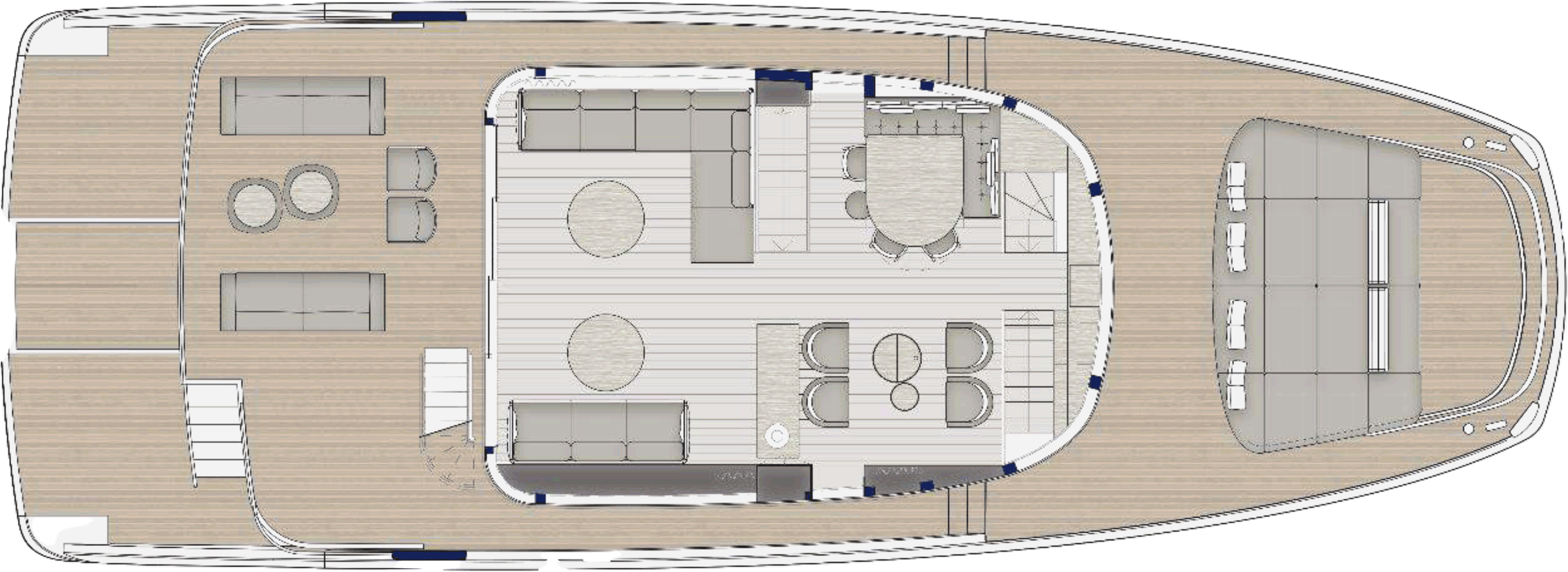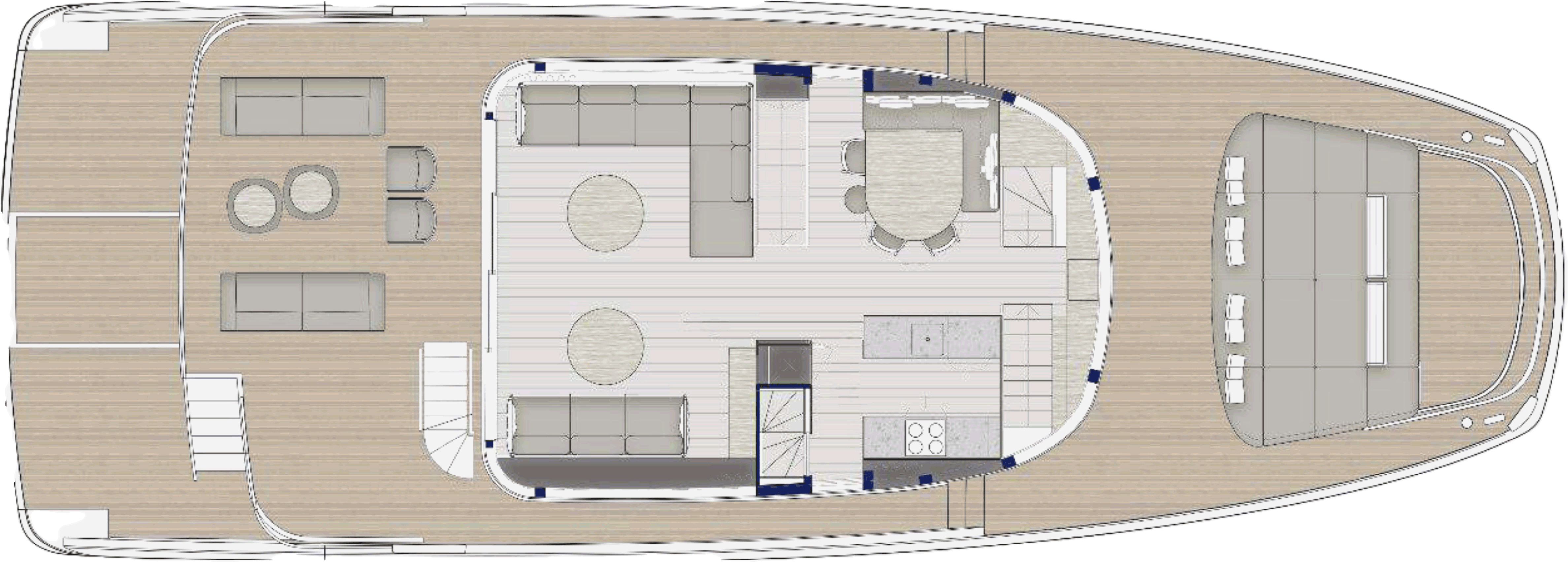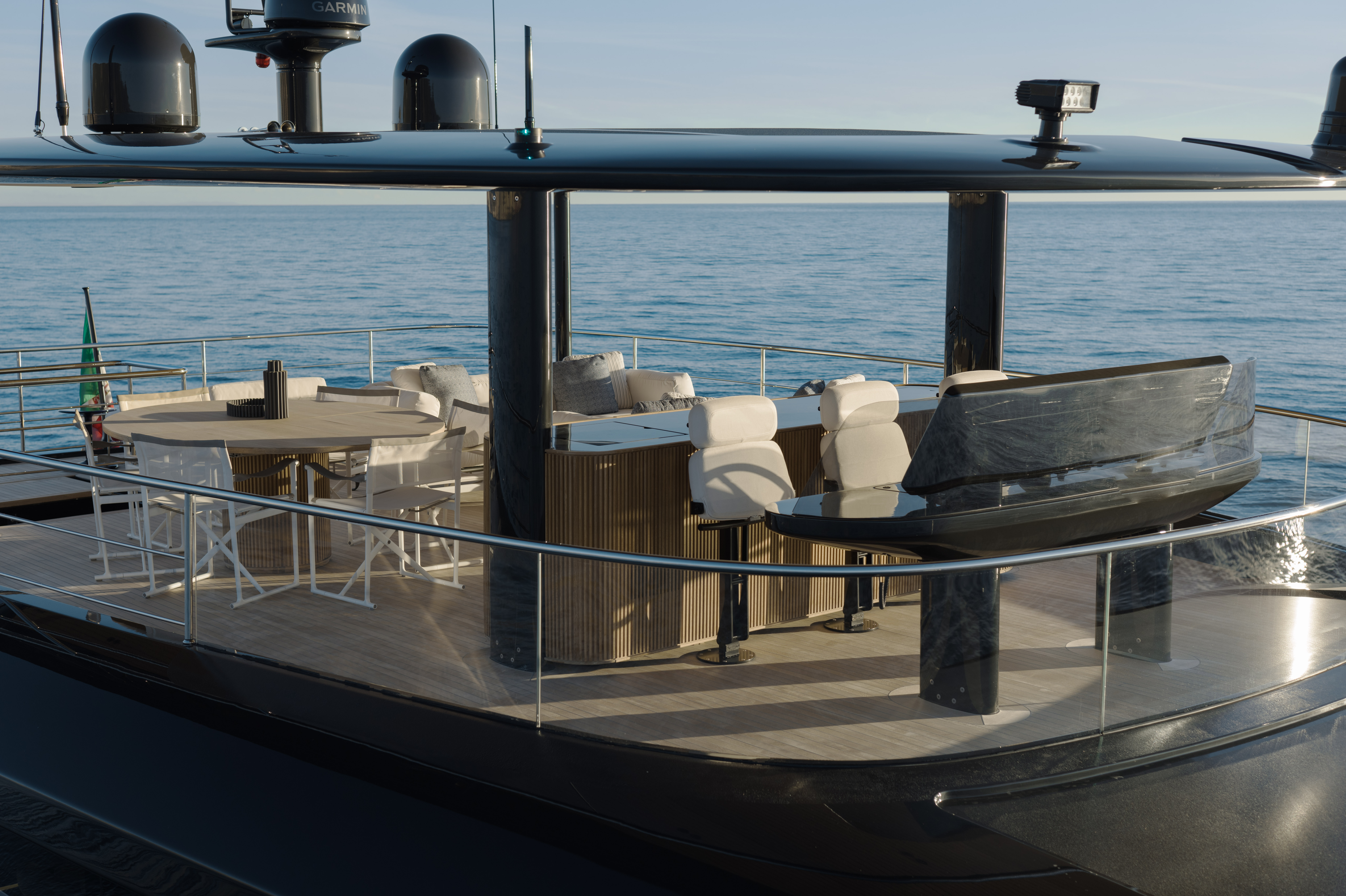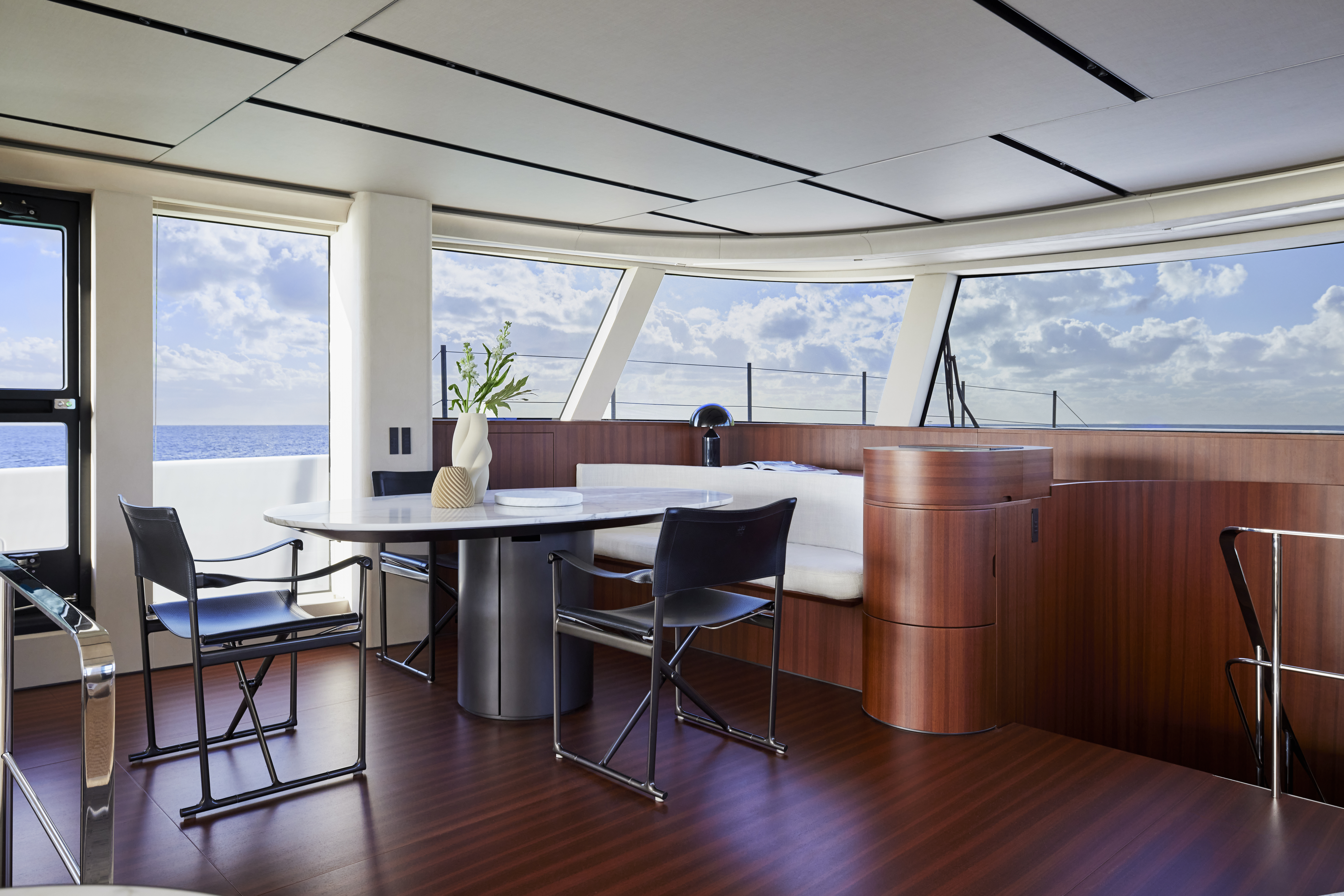 The BGM75 hull design delivers excellent seaworthy credentials, and protective sidewalls result from extra sturdy construction. A spacious beach area and generously sized saloon create exceptional comfort onboard. And movement around the yacht is made effortless with connected cockpits, optimised helm station position, and wide visibility. Inside, the sumptuous interior design boasts meticulous attention to detail and exudes understated elegance.