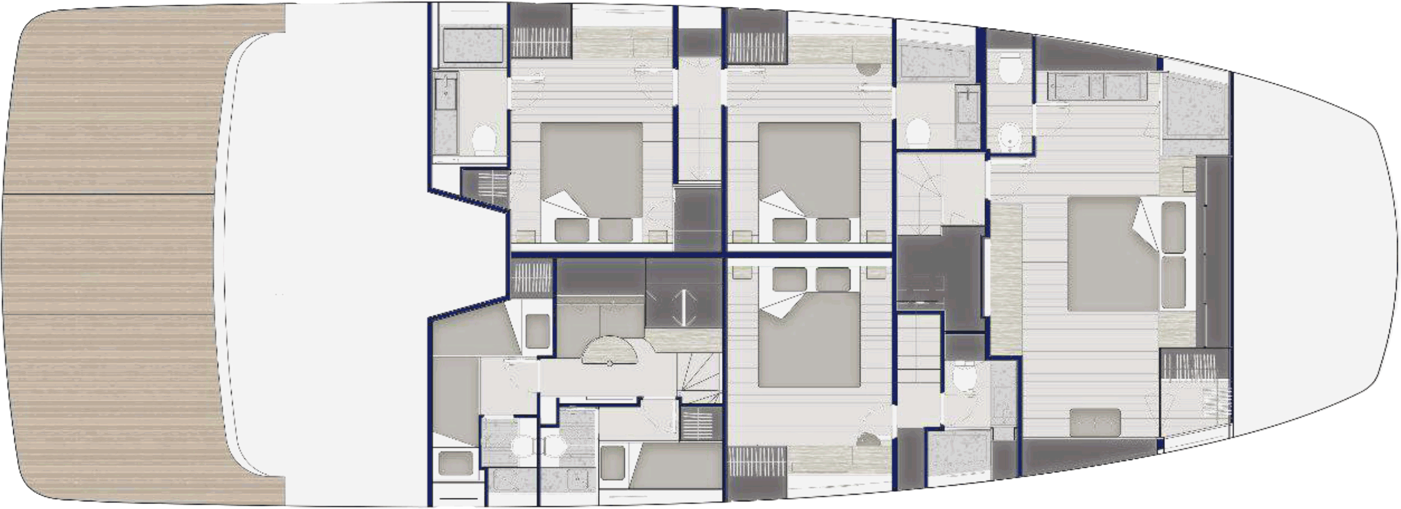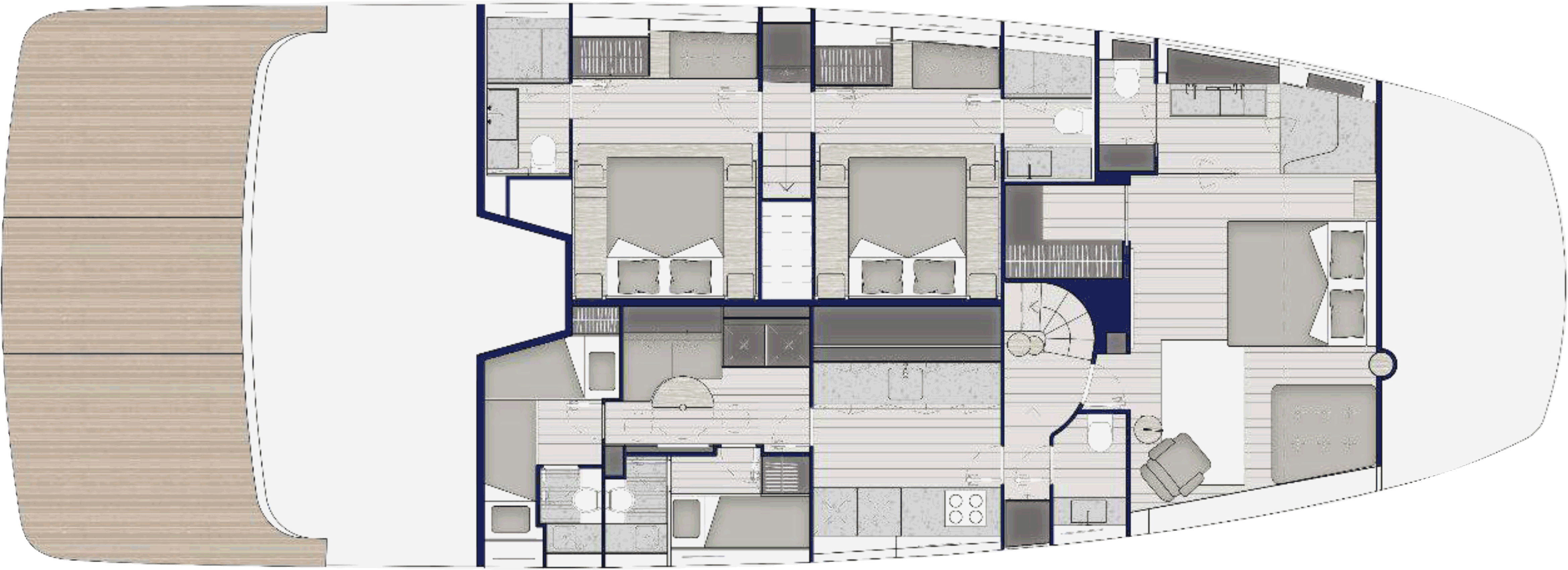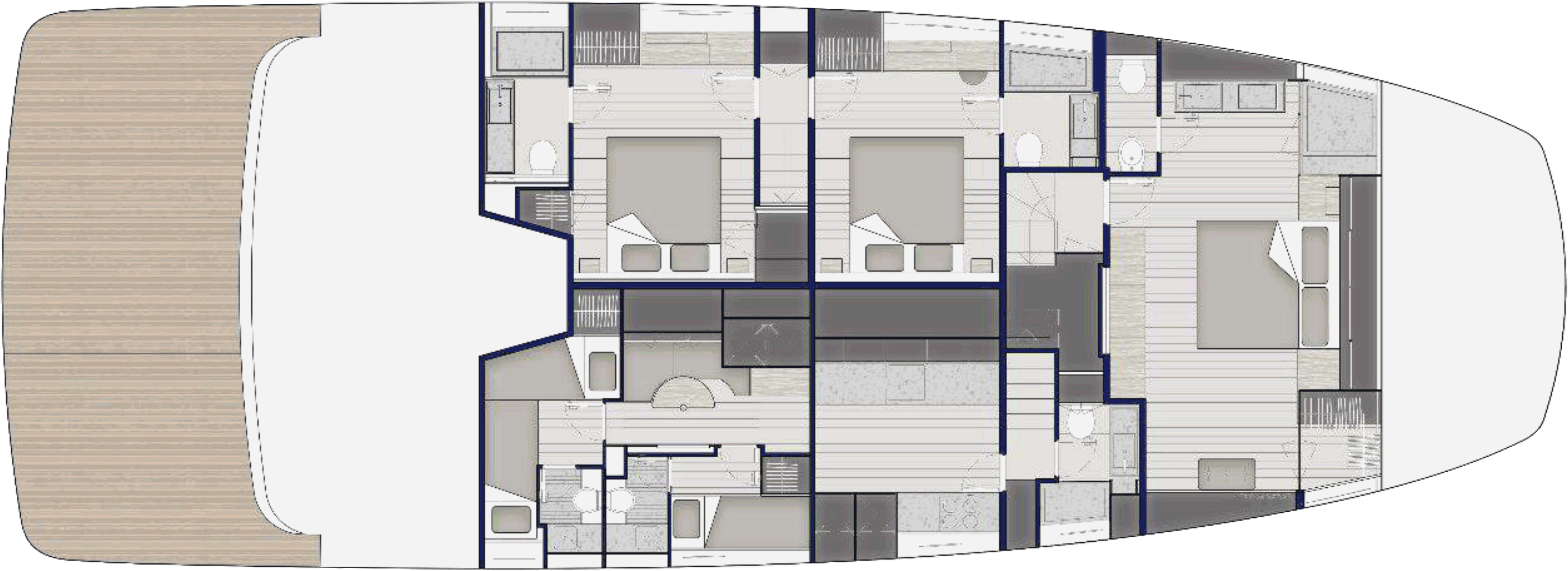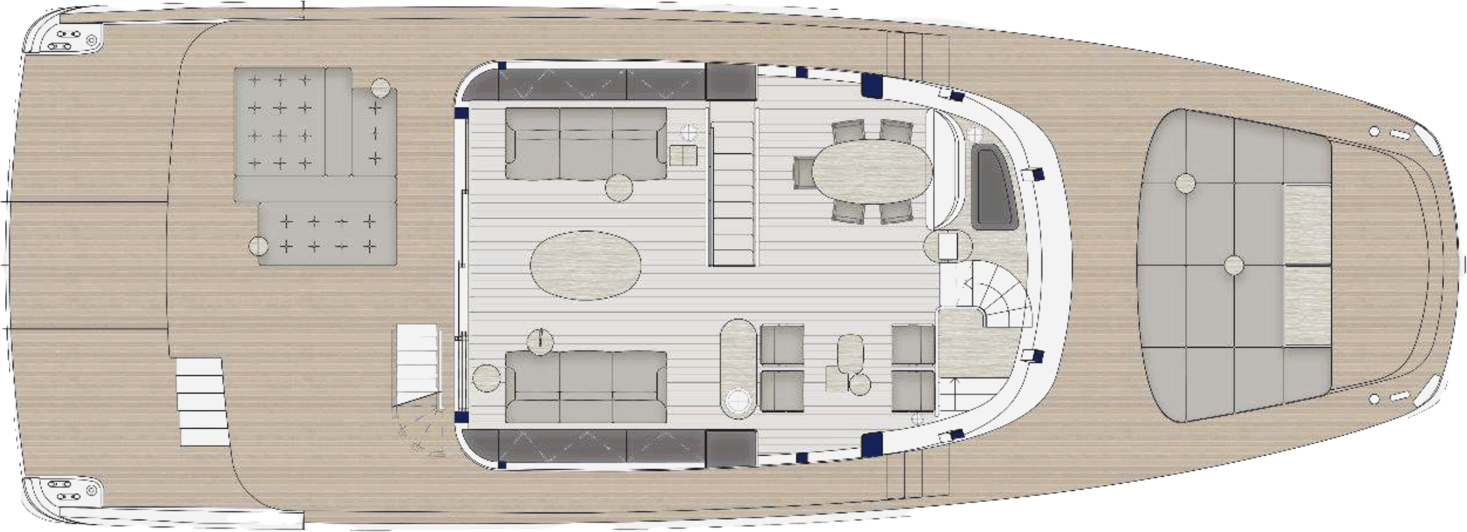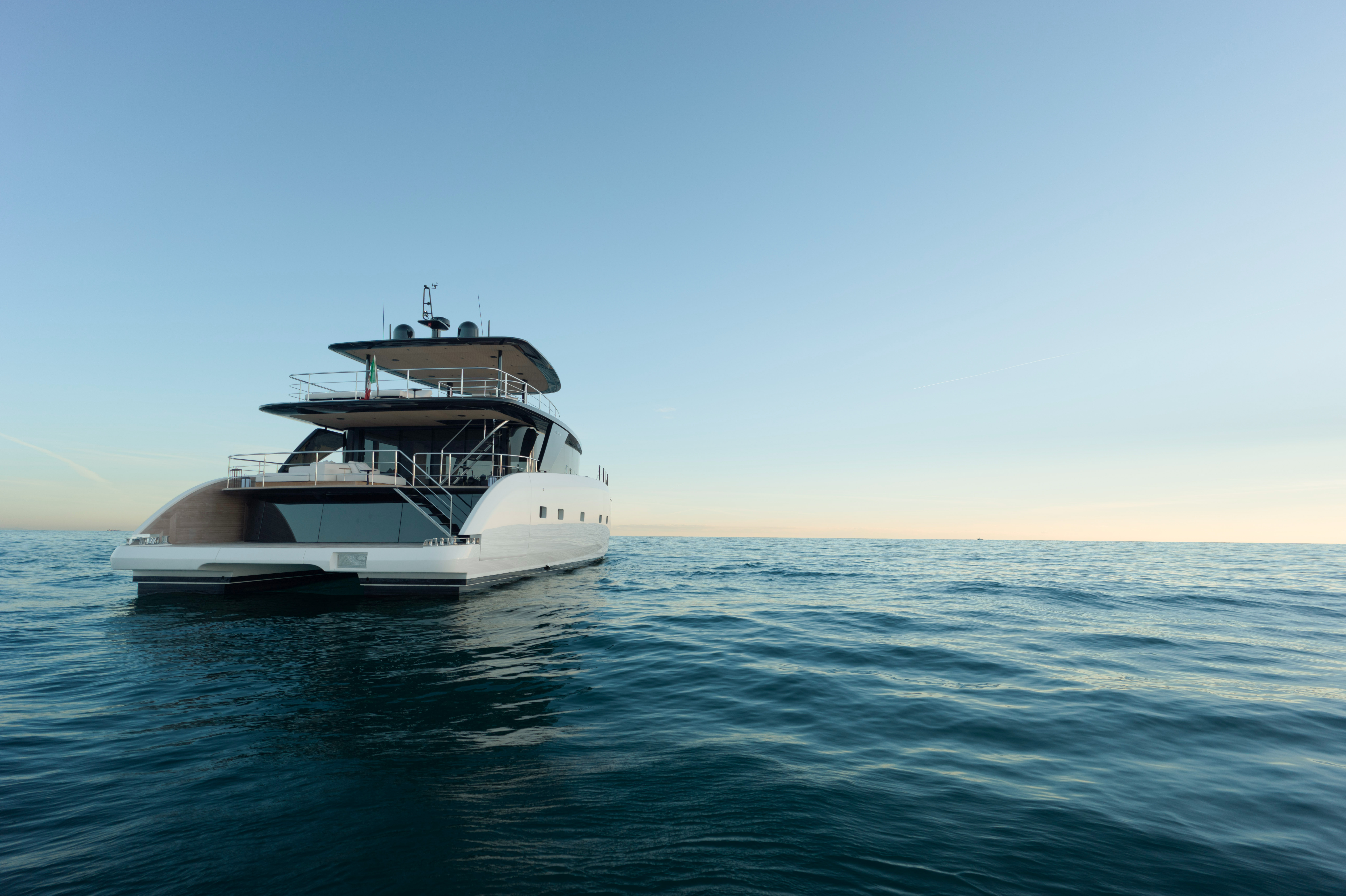 The BGM75 hull design delivers excellent seaworthy credentials, and protective sidewalls result from extra sturdy construction. A spacious beach area and generously sized saloon create exceptional comfort onboard. And movement around the yacht is made effortless with connected cockpits, optimised helm station position, and wide visibility. Inside, the sumptuous interior design boasts meticulous attention to detail and exudes understated elegance.