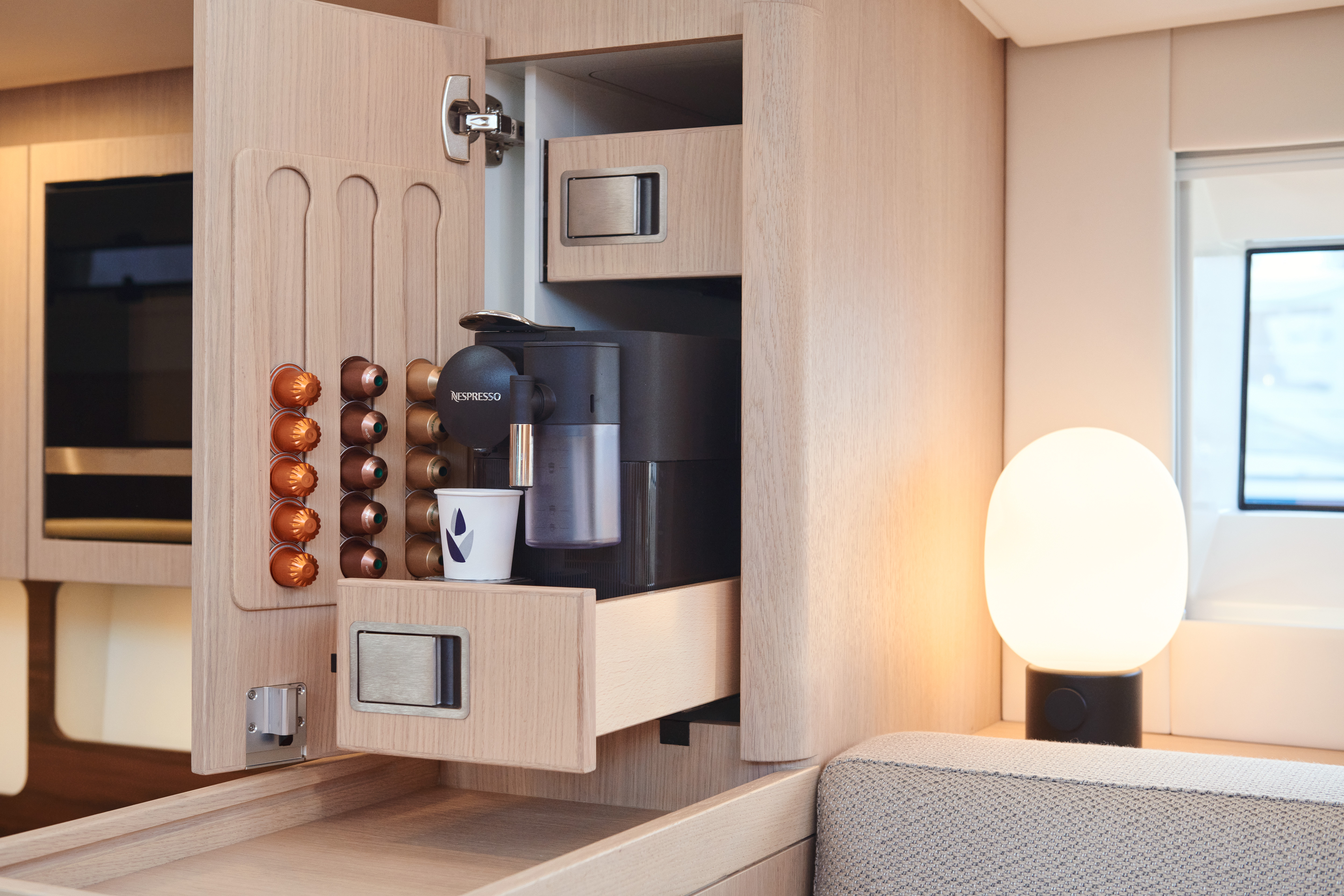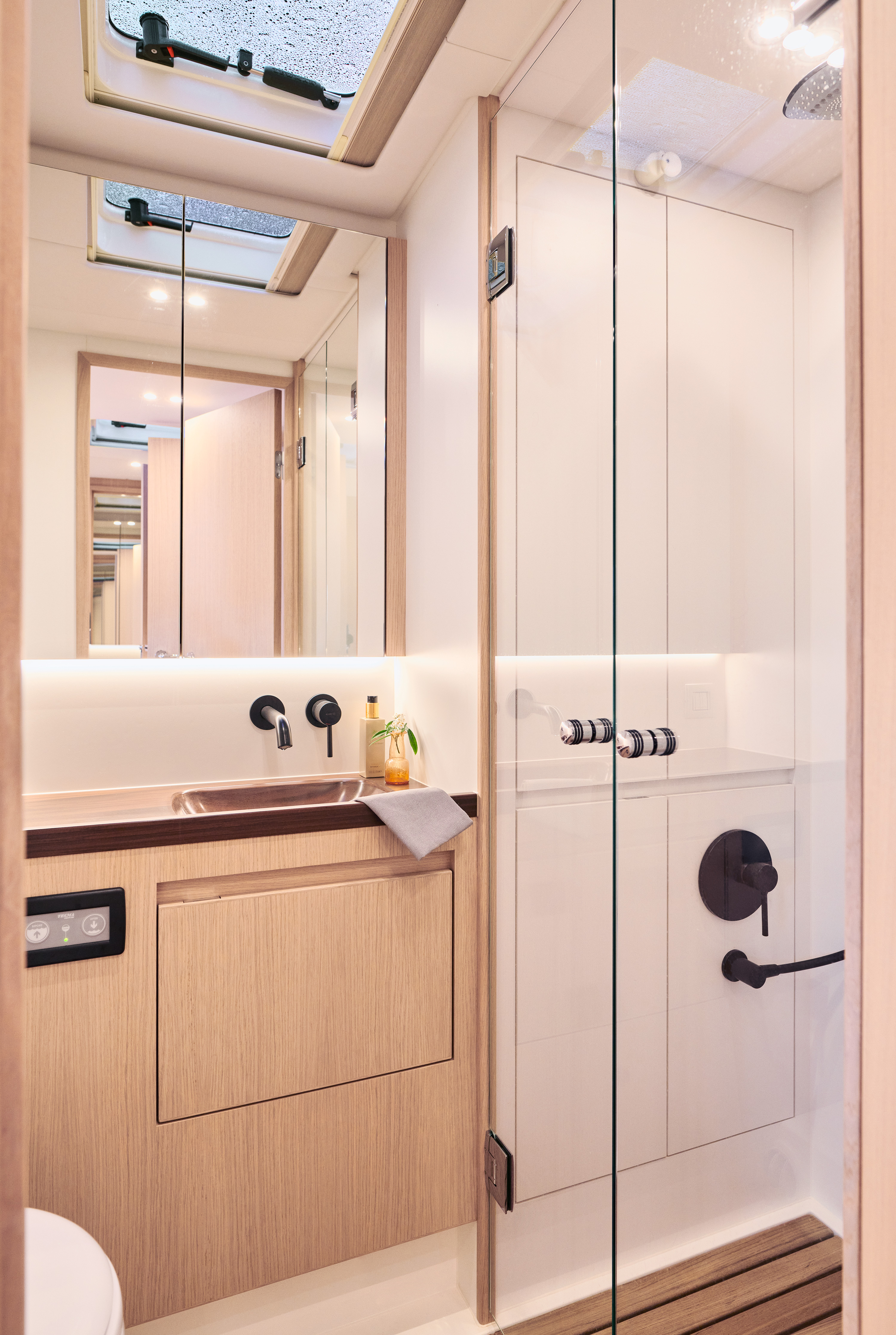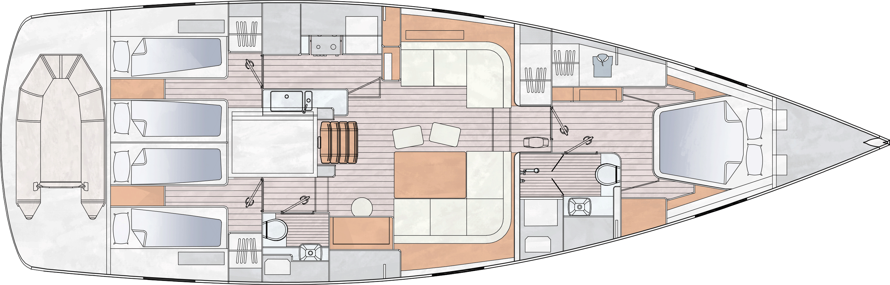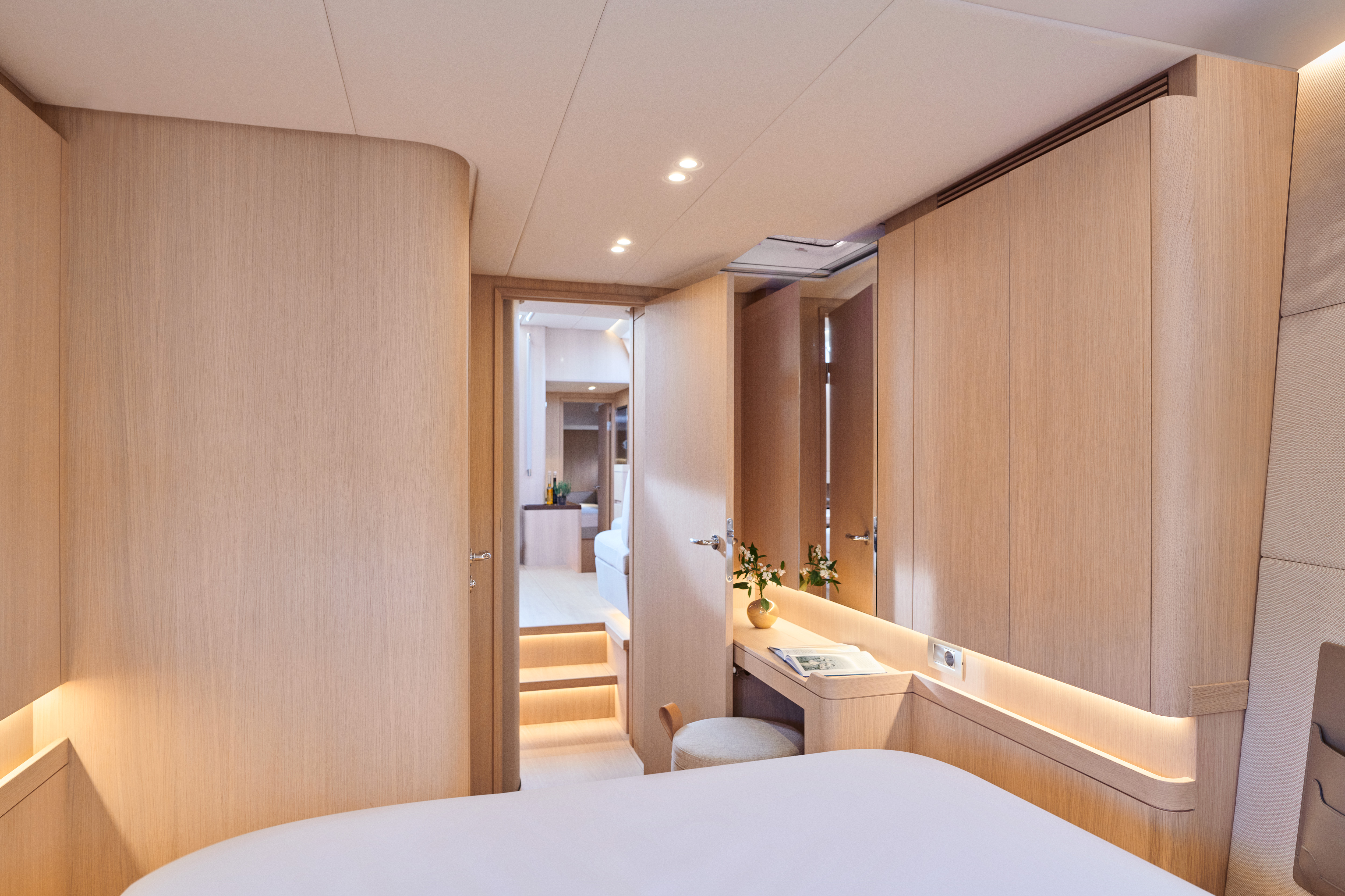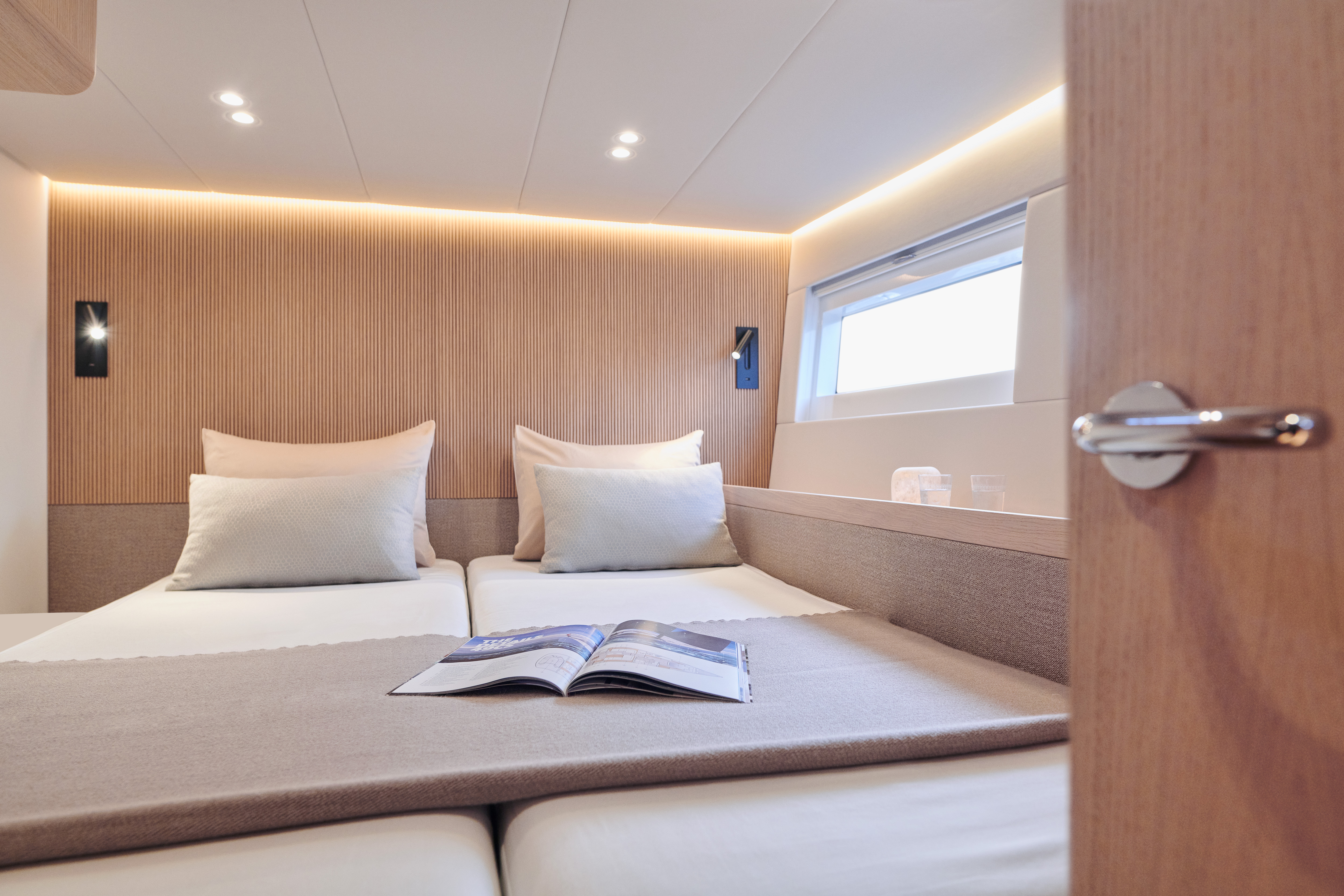 Displaying incredible onboard space, both above and below deck, the Contest 49CS creates a secure environment for all onboard. The three-cabin arrangement is ideal for safe, performance family sailing, while also providing space for a tender garage, as well as a submersible bathing platform.