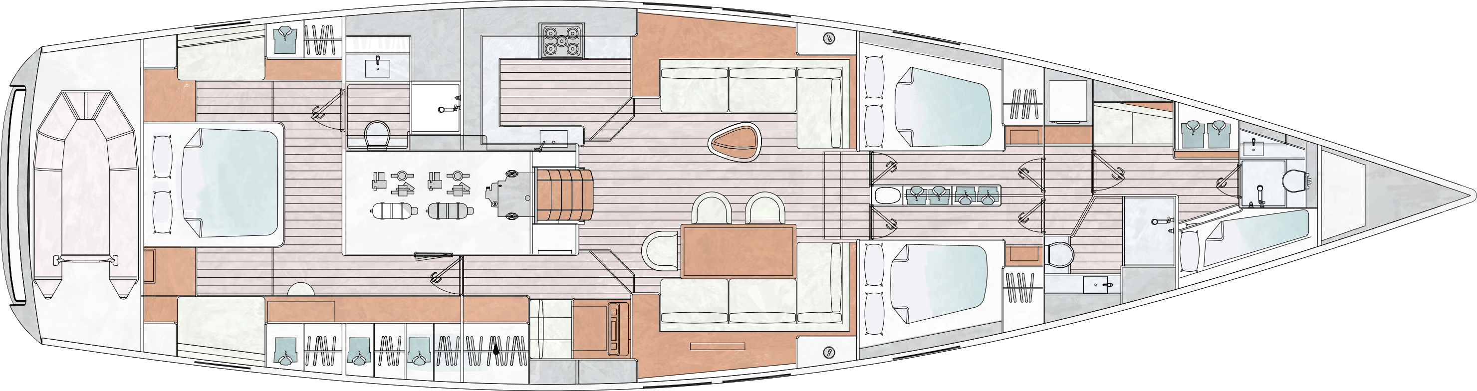 Deliveries to date span yachts with a full carbon rig with Park Lane boom and 3Di moulded sails, to alloy spars and a vertically battened Vectra with in-mast furling. With one racing focused and one cruising, one more private with a forward galley, and one inclusive with an aft U-shaped galley, choice and specification is entirely personal for the discerning owner.