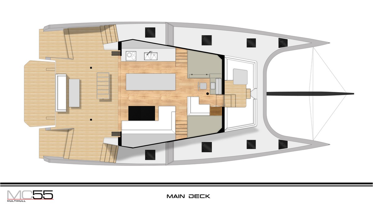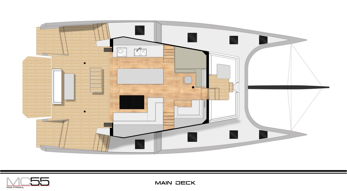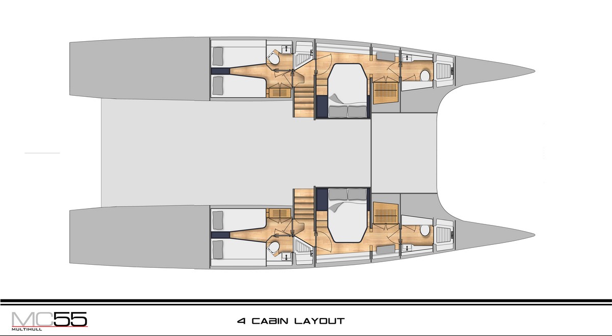 The MC55 not only benefits from McConaghy’s vast experience building performance boats, but also from the carefully considered use of carbon, that sees her precise hull forms achieve an optimum strength to weight ratio. As with all McConaghy Multihulls, the MC55 has dual helm positions on the flybridge, allowing for the greatest sight lines forward, as well as an elevated position that aids in-port manoeuvres – making her an ideal choice for those new to multihull cruising.