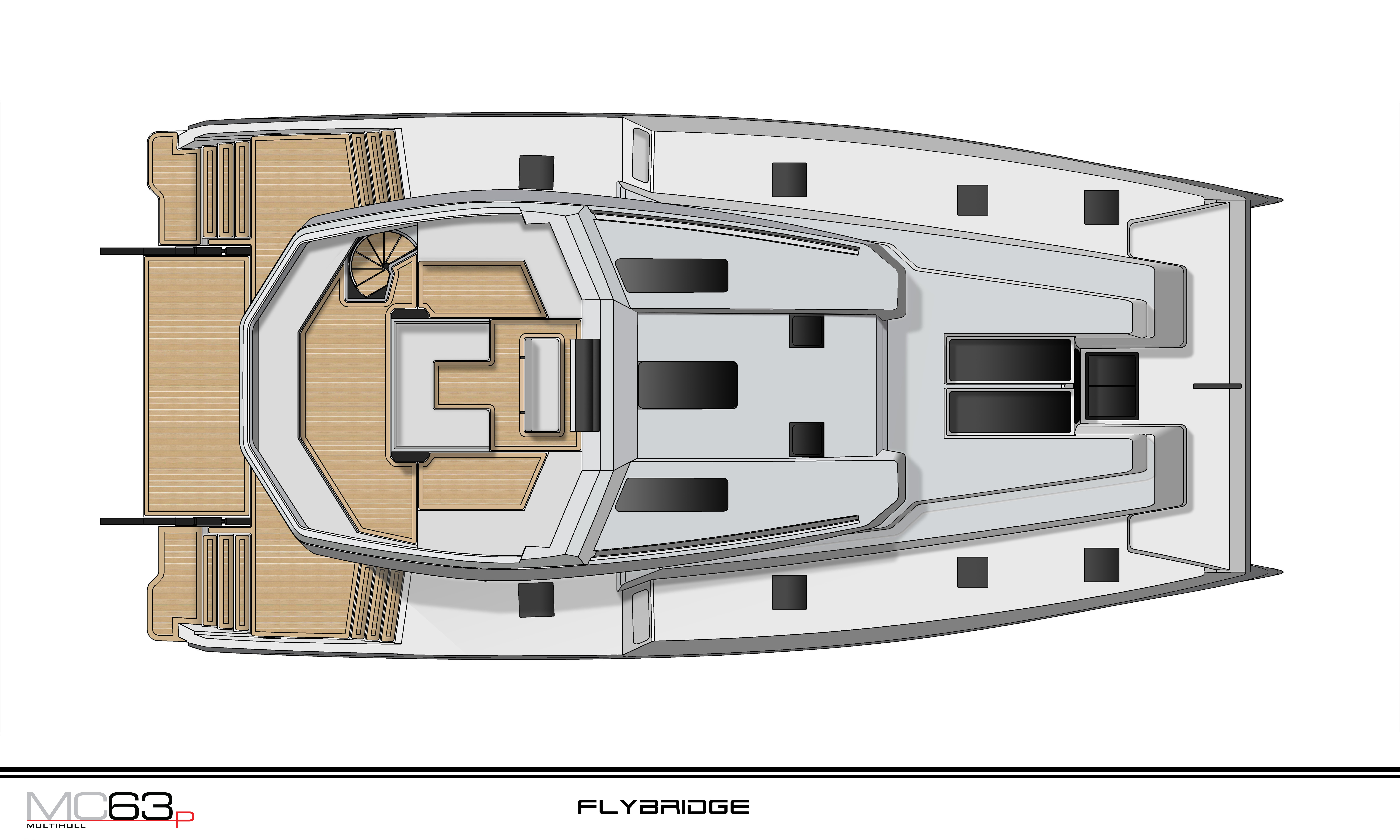 The MC63p offers two flybridge layouts to choose from, catering to a number of different usage modes. The aft flybridge option allows for a bank of seating behind the helm and a sun pad recessed into the coach roof, whilst the extended flybridge option creates a larger social space, with the addition of a bridge atop the coach roof.