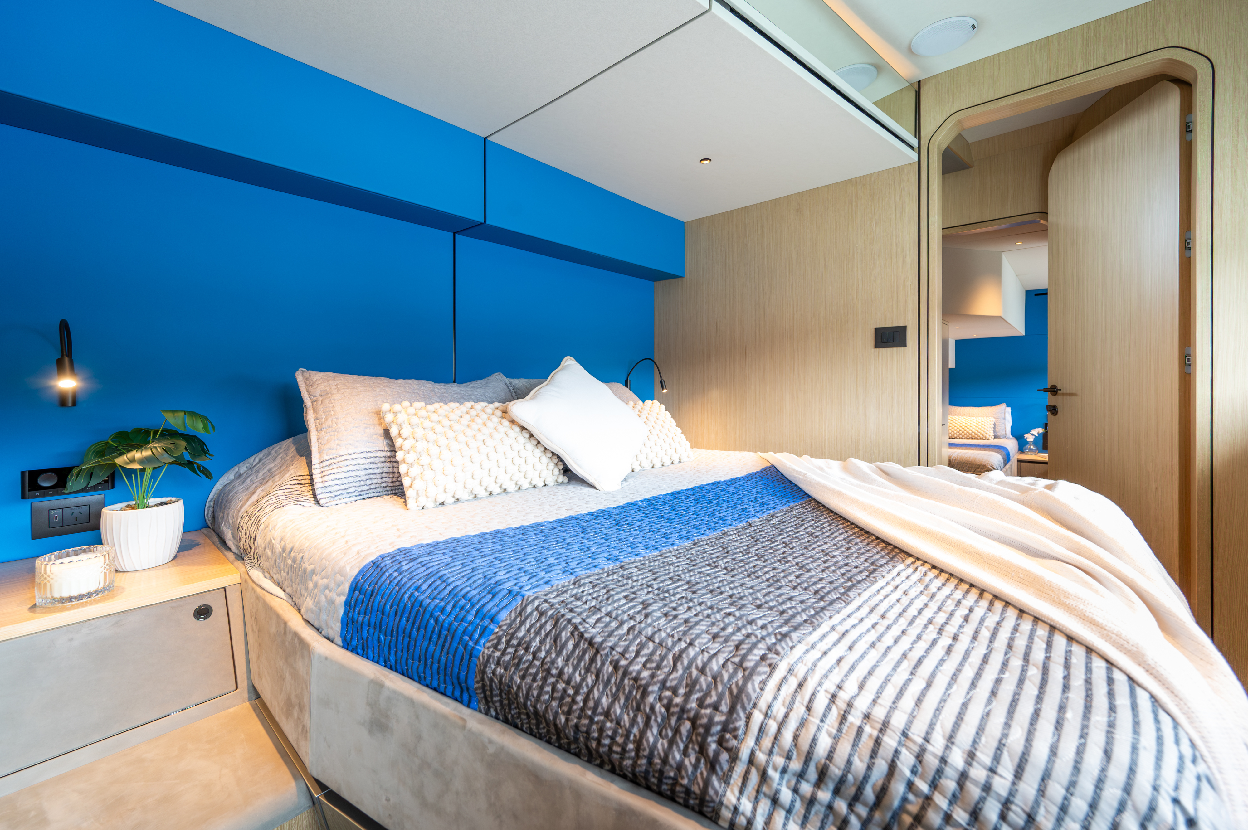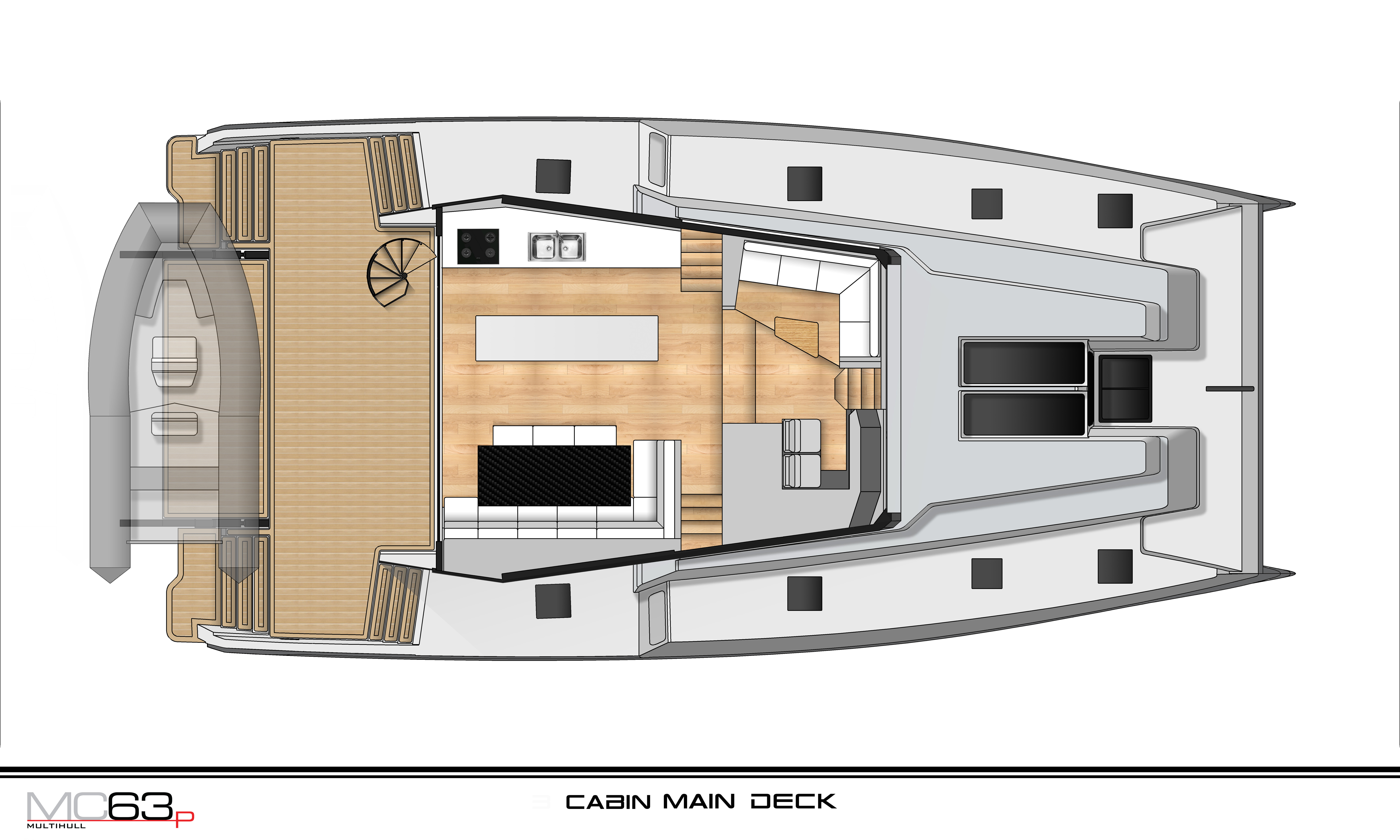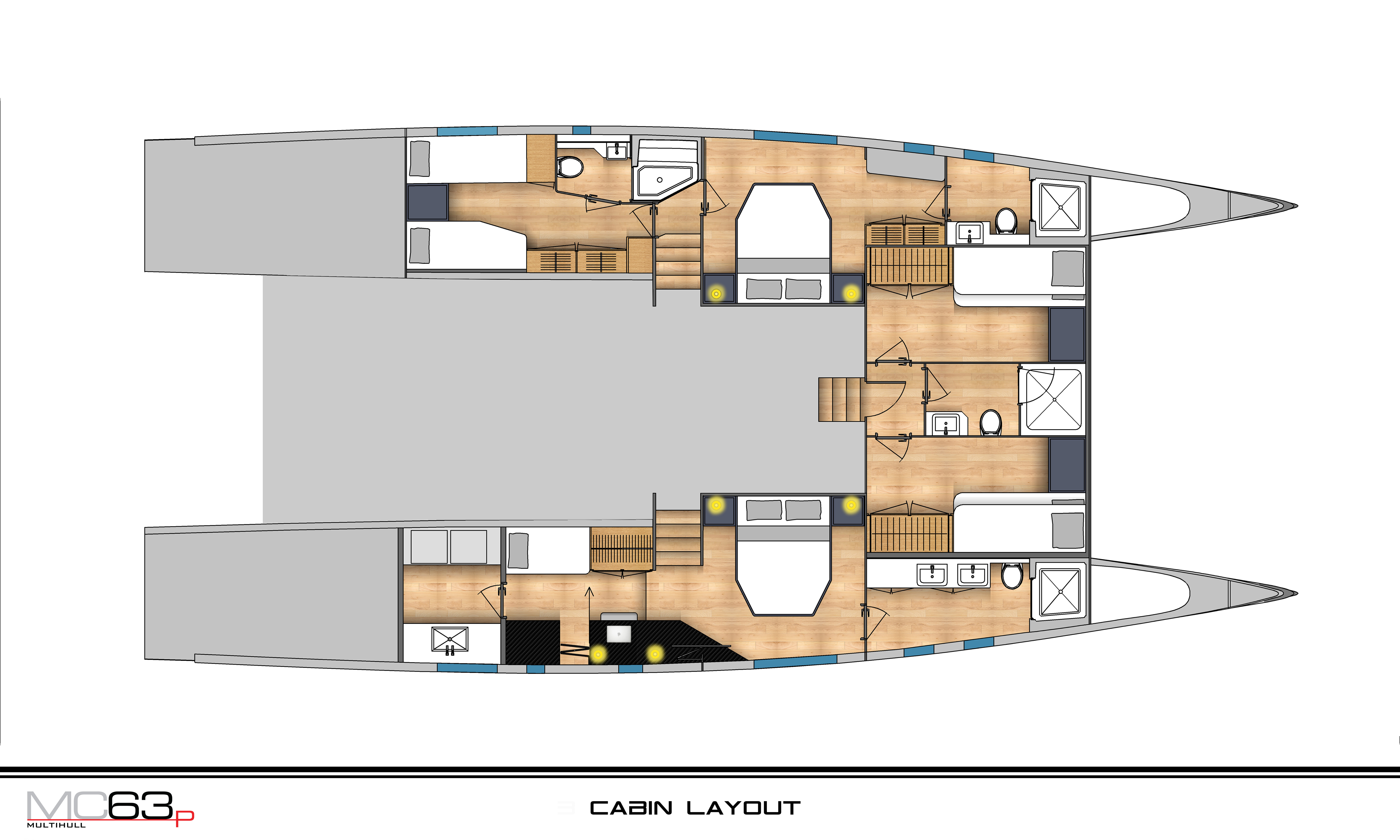 There are three versatile interior arrangements available, allowing for a three or four cabin layout or an arrangement that positions the master suite on the main deck.