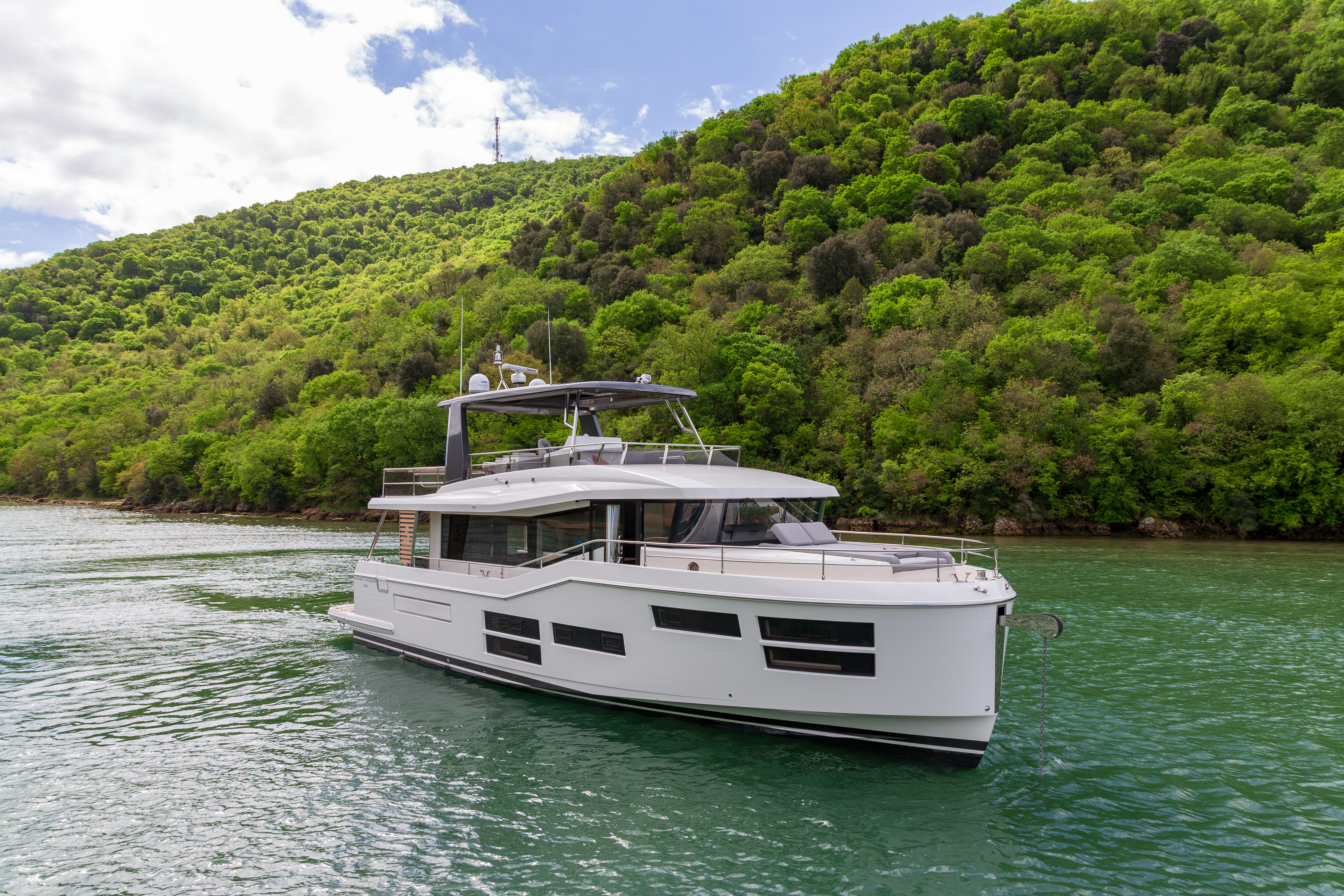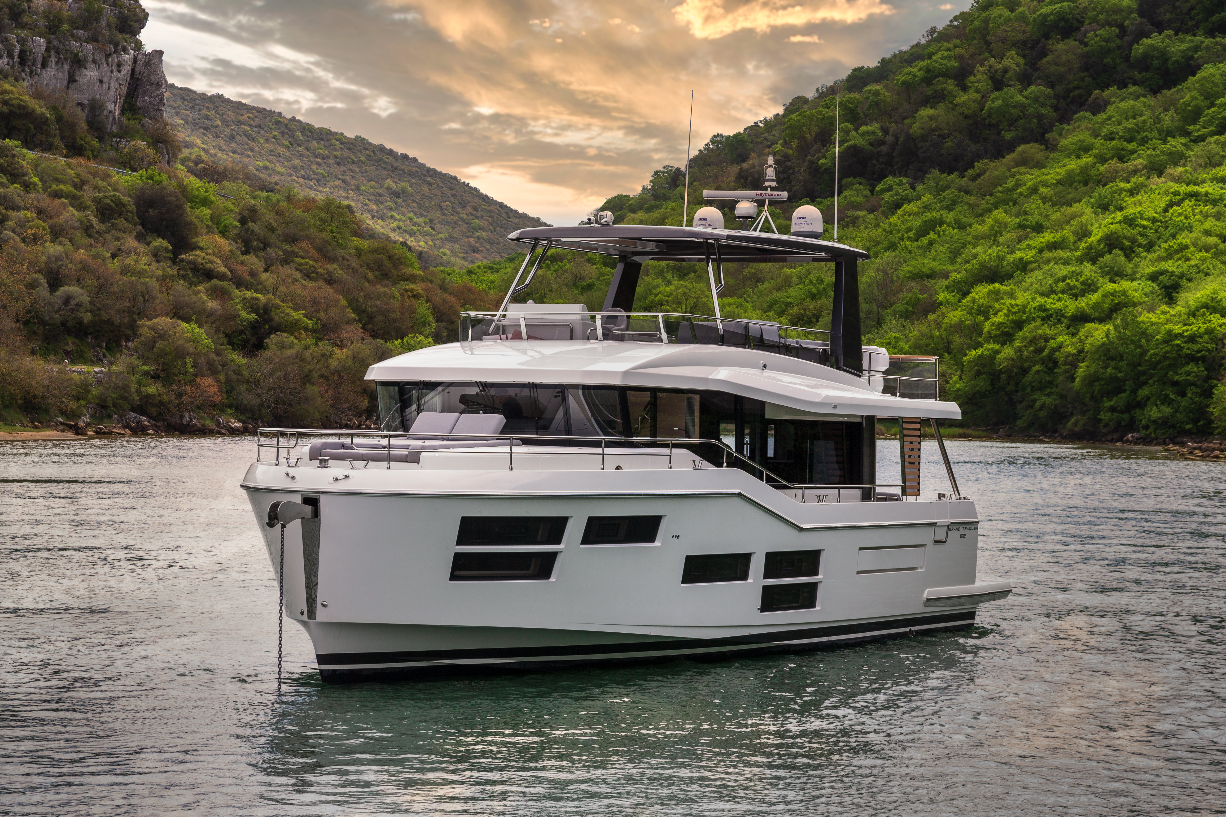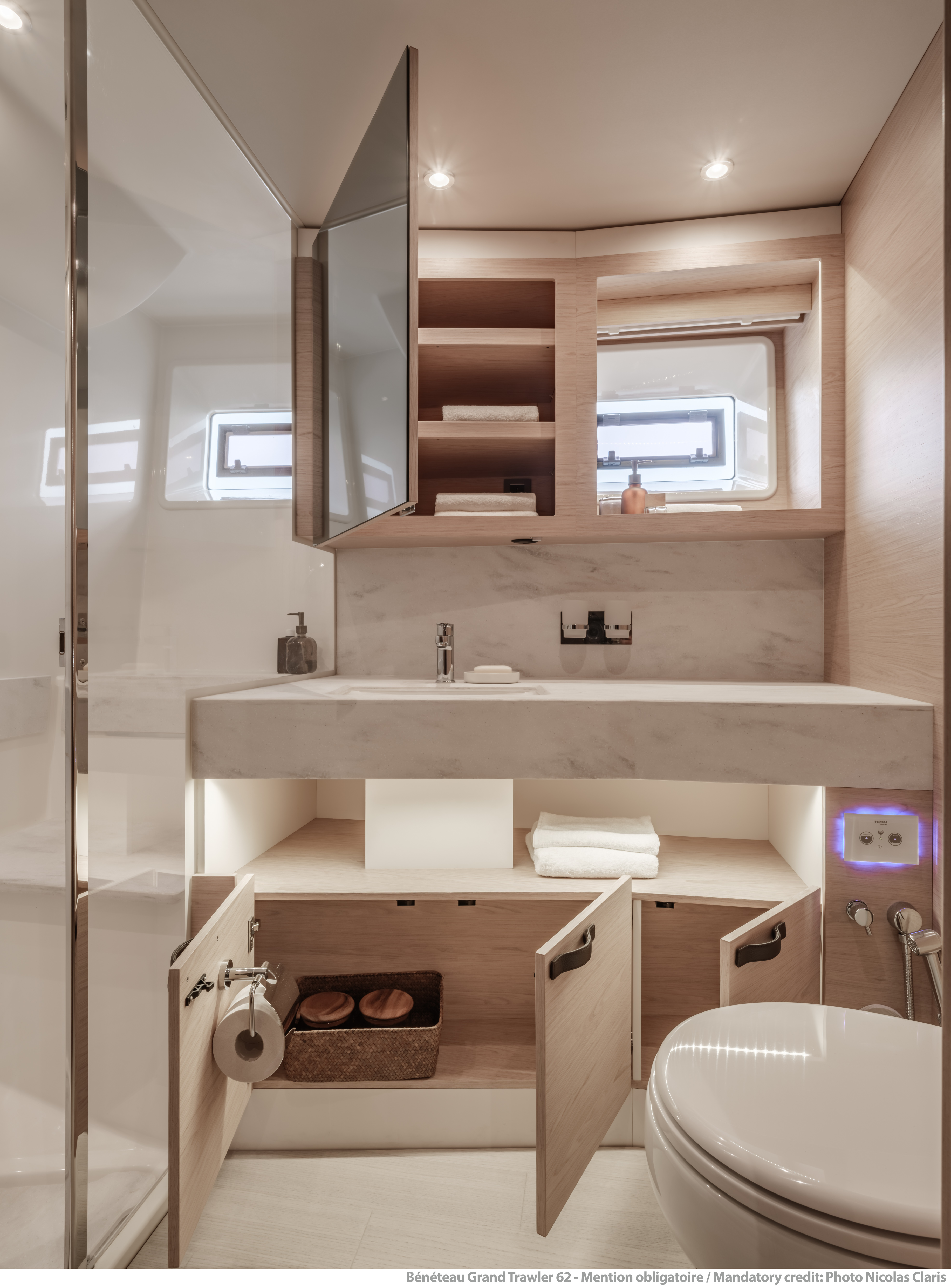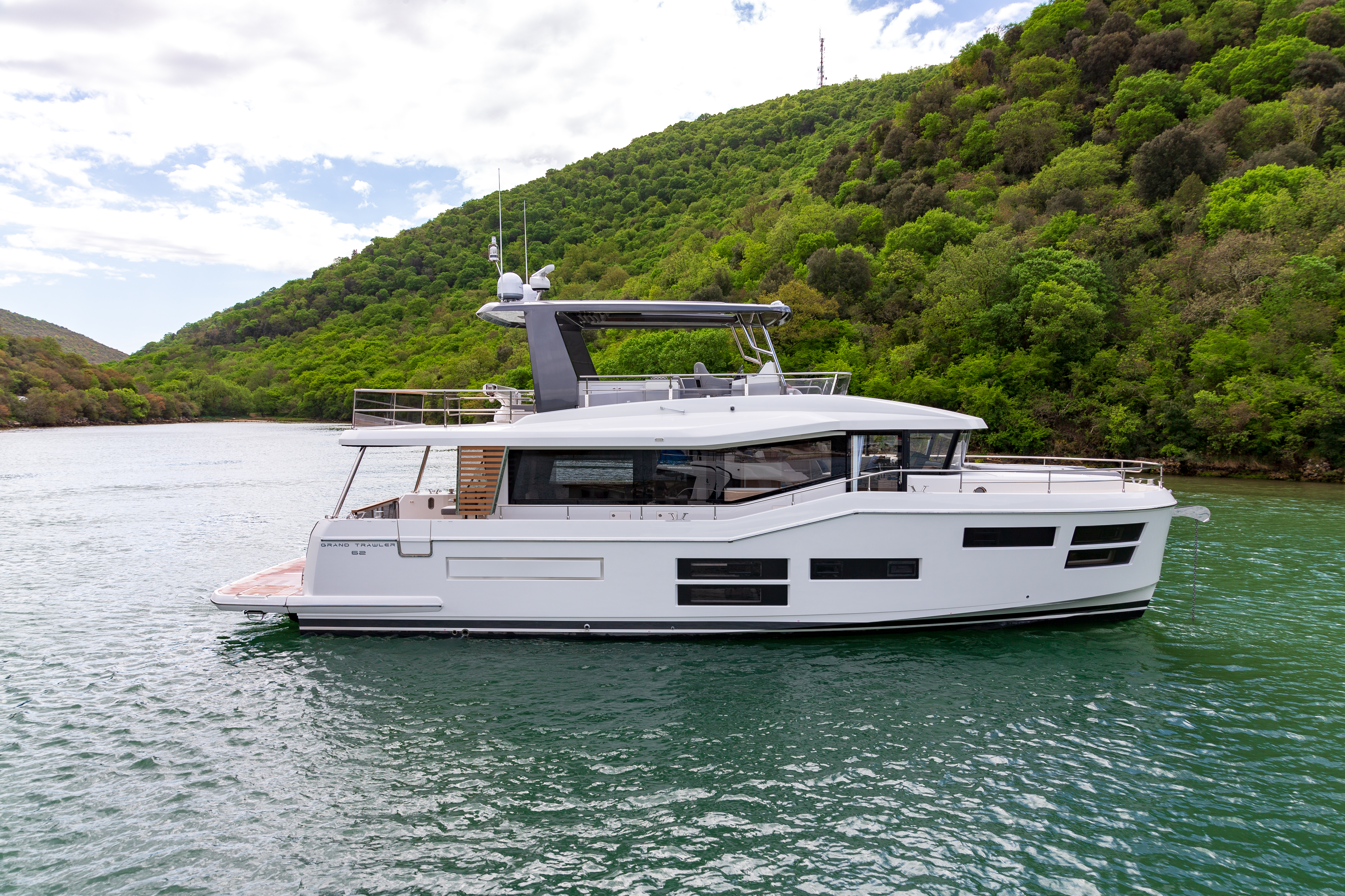 The shipyard’s flagship 62, however, is not just a bigger Swift Trawler. With a voluminous, full-body displacement hull that carries its beam well forward, the new Grand Trawler 62 has dockside presence and purposeful styling.