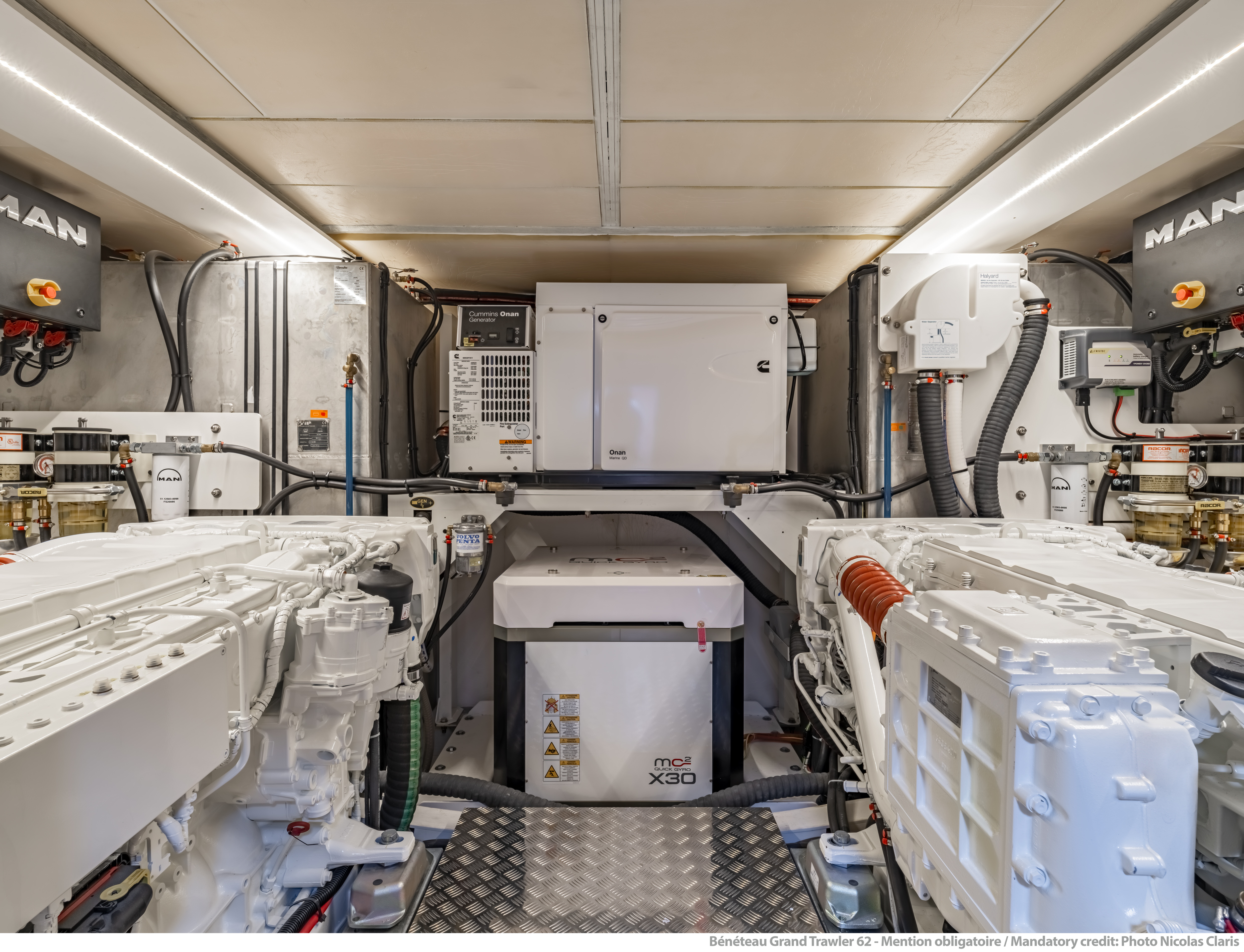 The Grand Trawler 62 is powered by twin MAN i6-730hp diesel engines on shaft drives with joystick control.