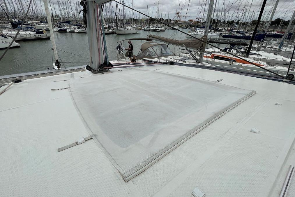 Voiles & accastillage : grand-voile à corne full batten, gennaker avec tangon, winchs électriques, lazy jack et lazy bag. Confort extérieur : coussins de cockpit & lounge deck, bimini fixe avec protections, réfrigérateur de cockpit, sellerie anthracite, annexe Hypalon 3,80 m avec moteur 25 CV. Vie à bord : 5 cabines avec sommiers à lattes, 5 WC électriques, lave-linge/sèche-linge, plancha intégrée, dessalinisateur 100L/h. Énergie & électronique : panneaux solaires 2000 W, convertisseur 3000 W, Pack Garmin Smart Cruising (pilote auto, GPS, AIS, radar), système audio Fusion + enceintes Bose, TV/HIFI. Sécurité : radeau de survie MP10, armement complet, antifouling et primaire époxy appliqués.Prêt à naviguer