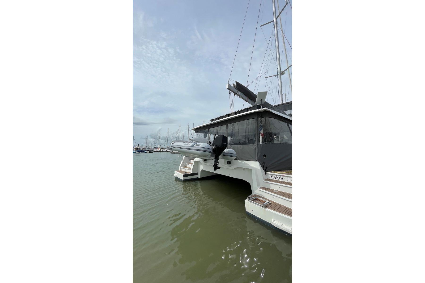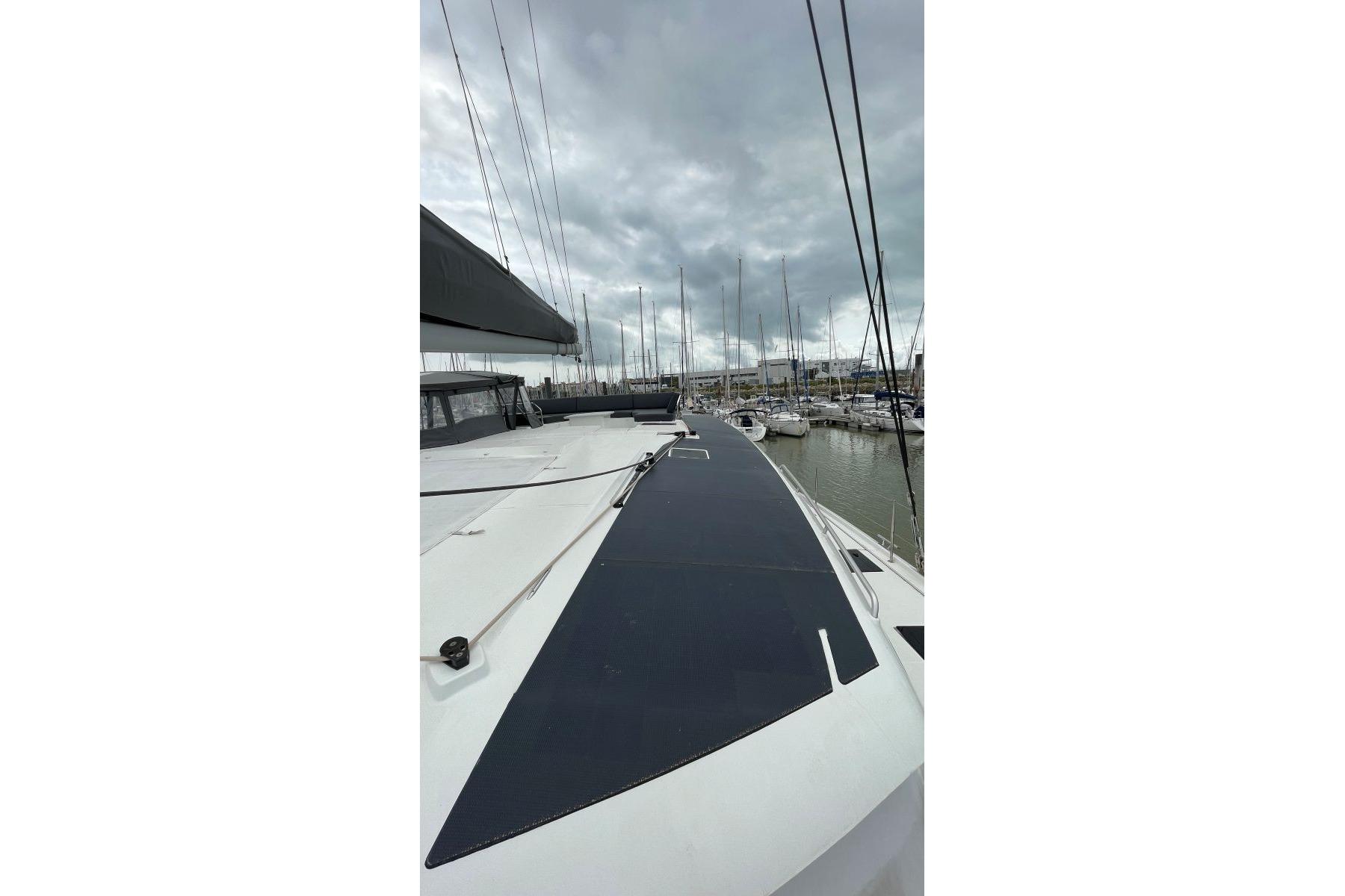 Sails & Rigging: full-batten square-top mainsail, gennaker with bowsprit, electric winches, lazy jack and lazy bag. Outdoor Comfort: cockpit & lounge deck cushions, fixed bimini with side protection, cockpit refrigerator, anthracite upholstery, Hypalon tender (3.80 m) with 25 HP engine. Onboard Living: 5 cabins with slatted bed bases, 5 electric toilets, washer-dryer, built-in plancha, 100 L/h watermaker. Energy & Electronics: 2000 W solar panels, 3000 W inverter, Garmin Smart Cruising Pack (autopilot, GPS, AIS, radar), Fusion audio system + Bose speakers, TV/Hi-Fi. Safety: MP10 liferaft, complete safety equipment, antifouling and epoxy primer applied.Ready to sail