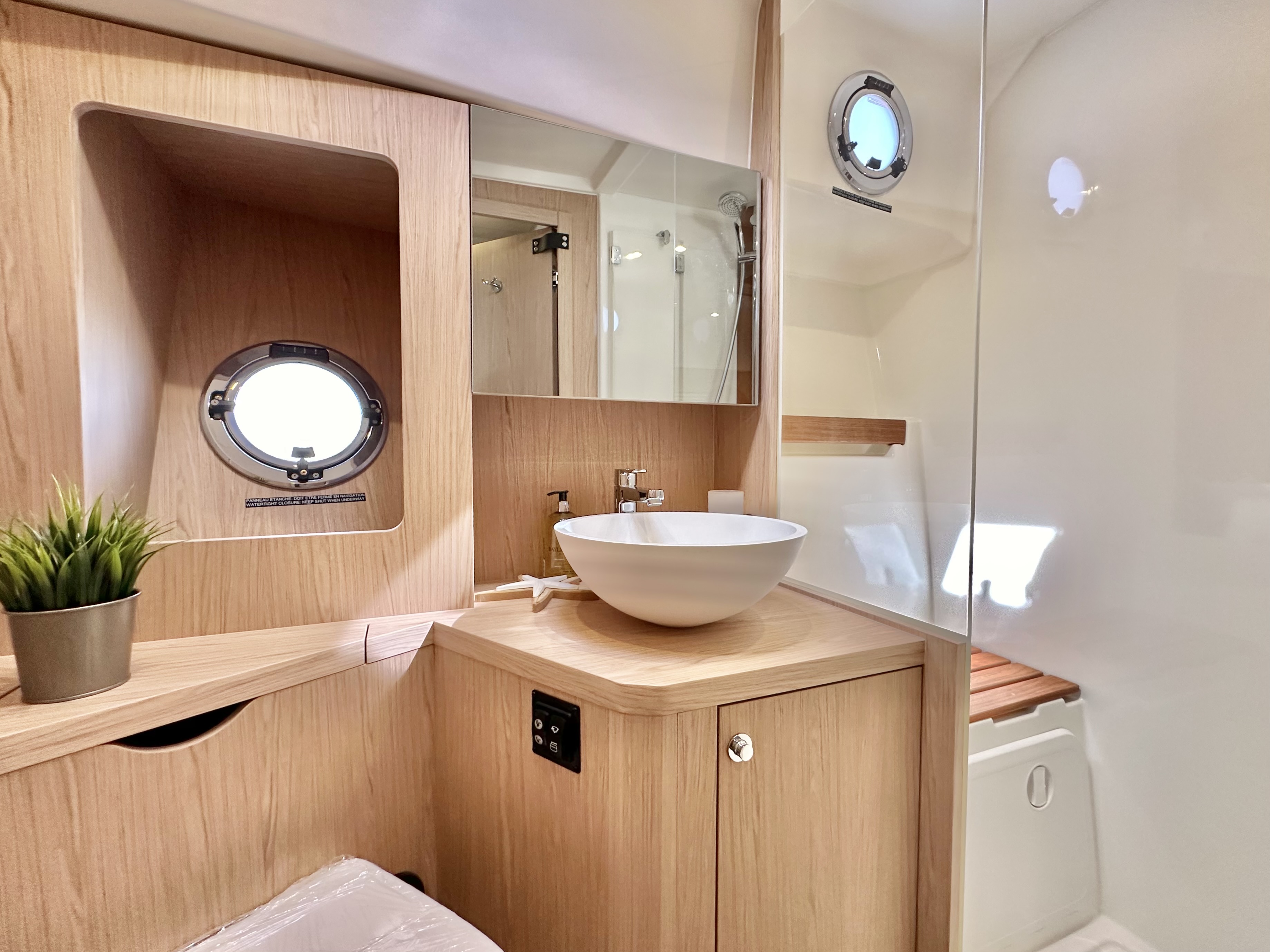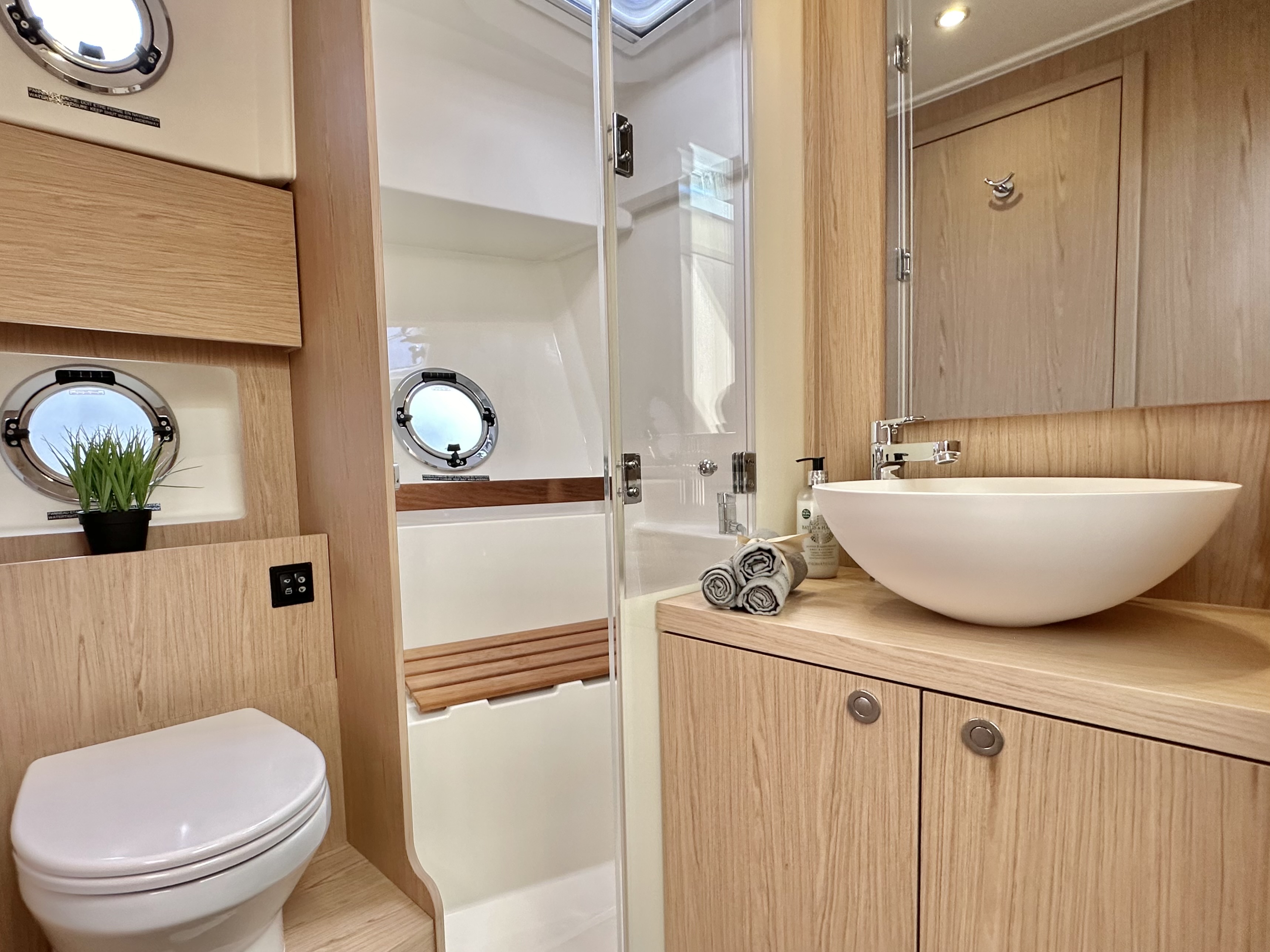 Separate shower compartment with seat and hull porthole