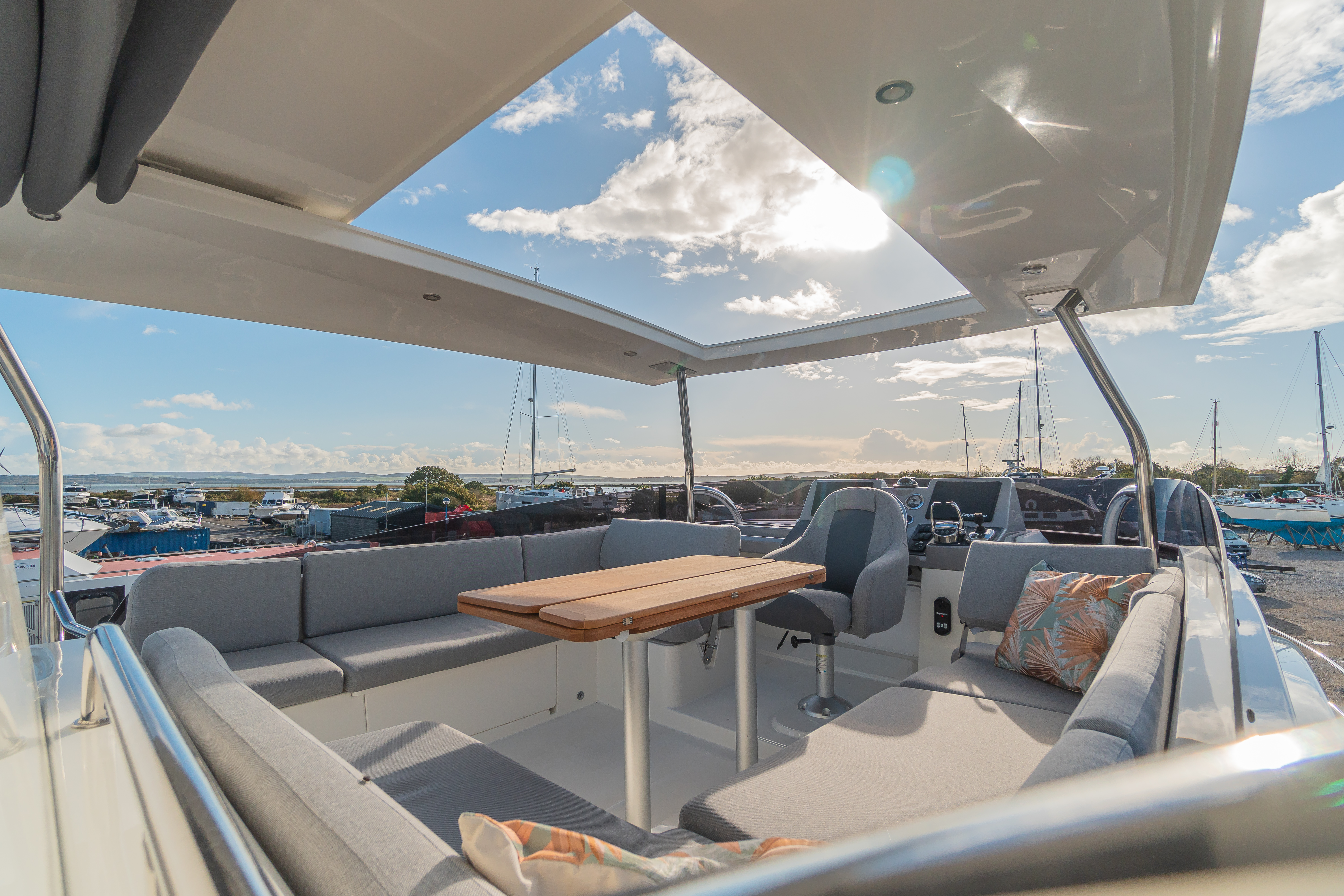 Flybridge lounge - bench seats in L shape port & starboard with built-in storage and an extendable teak table