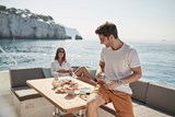 Varnished table on stainless steel base (conversion to coffee table or berth with electric pedestal)