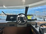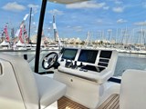 Helm console with engine throttles and Volvo Penta joystick, compass, 12 V plug, cup holders and storage compartment