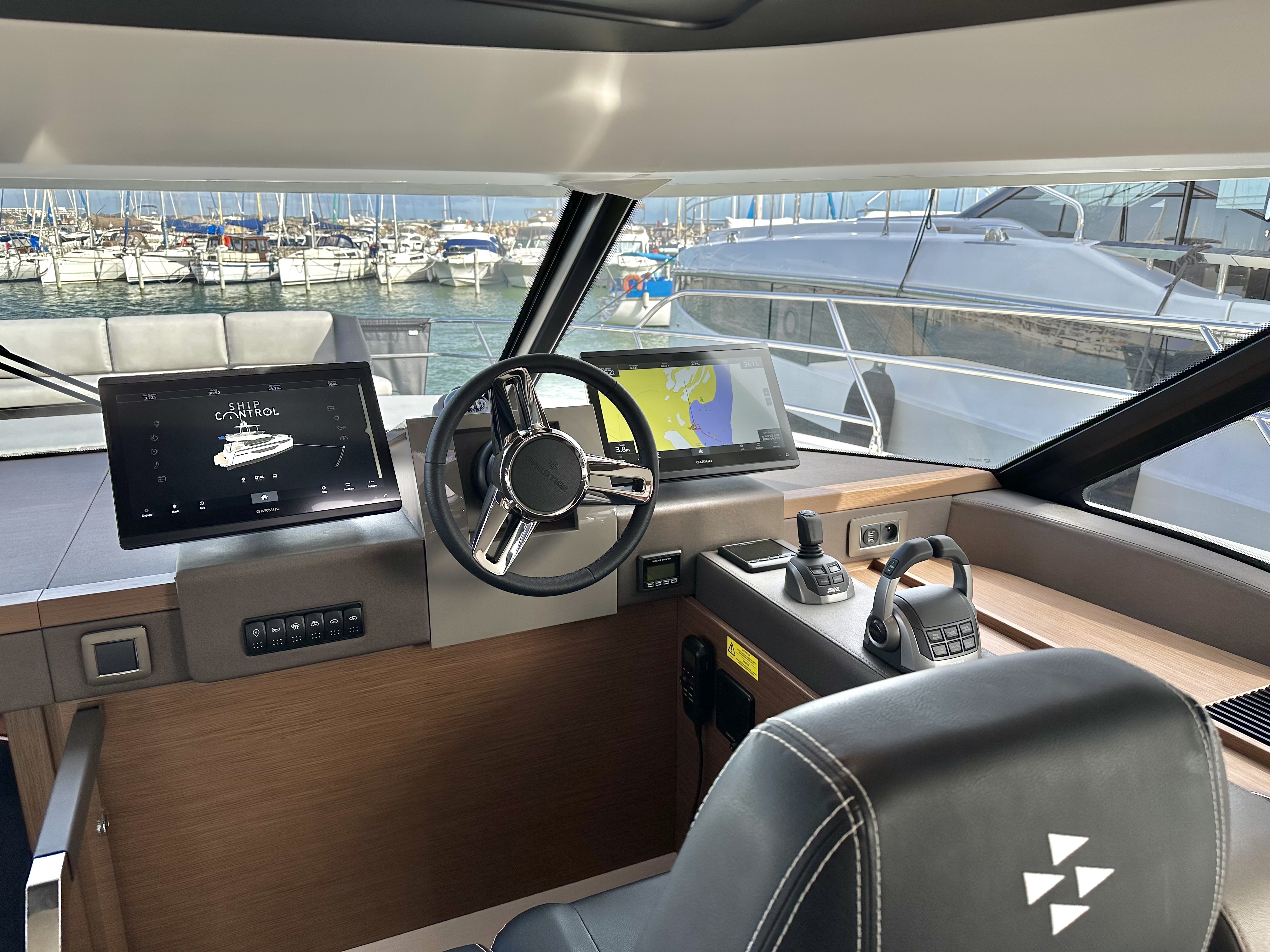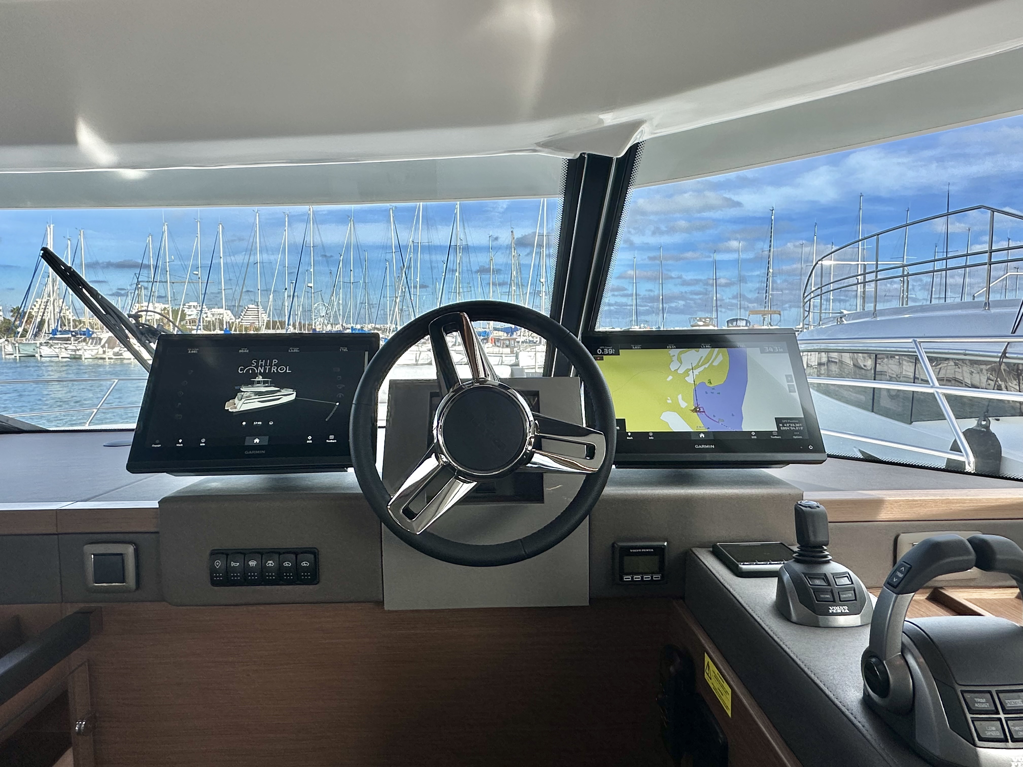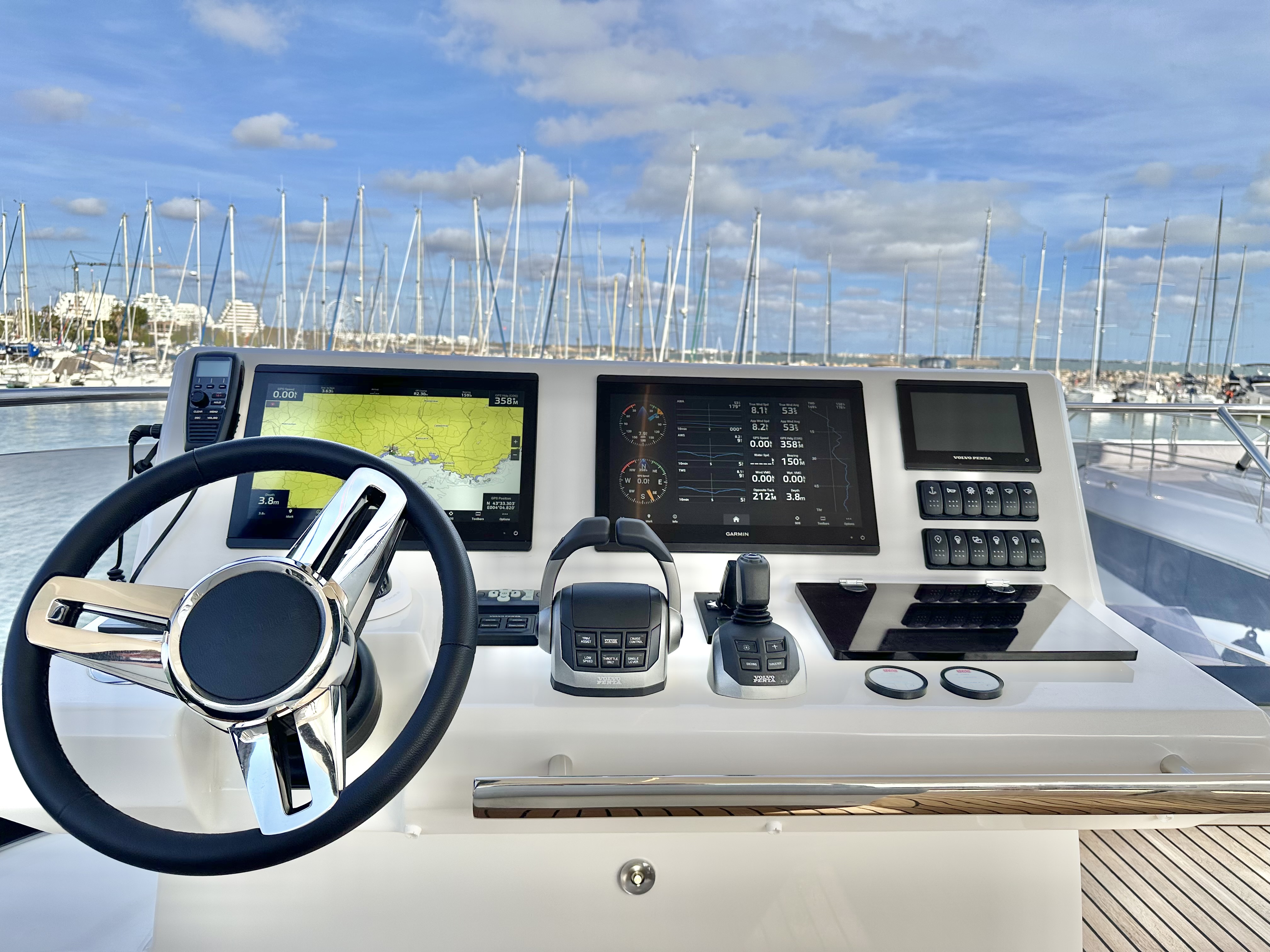 Dashboard with Garmin navigation screens, VHF, Volvo instrumentation and engine controls