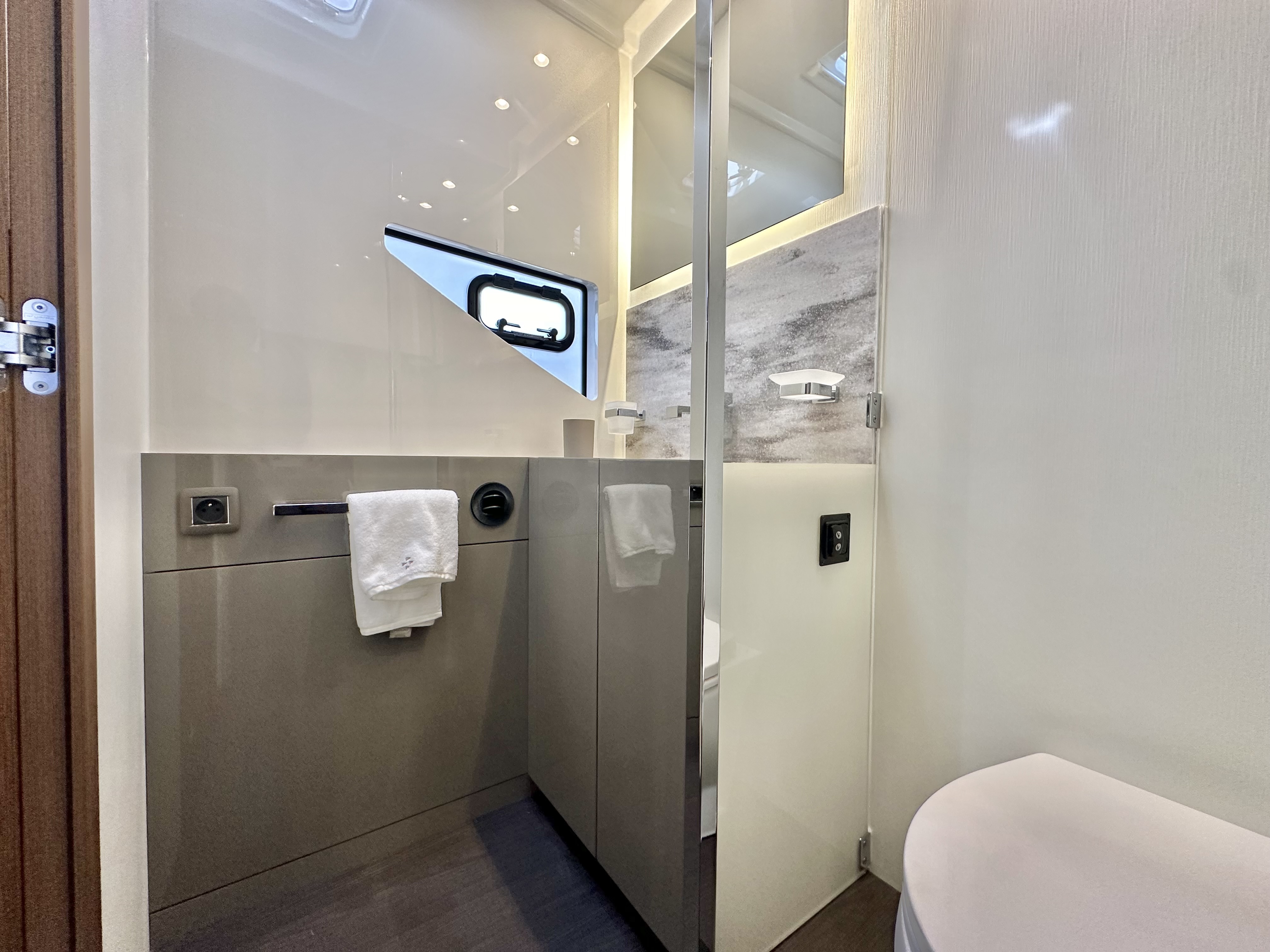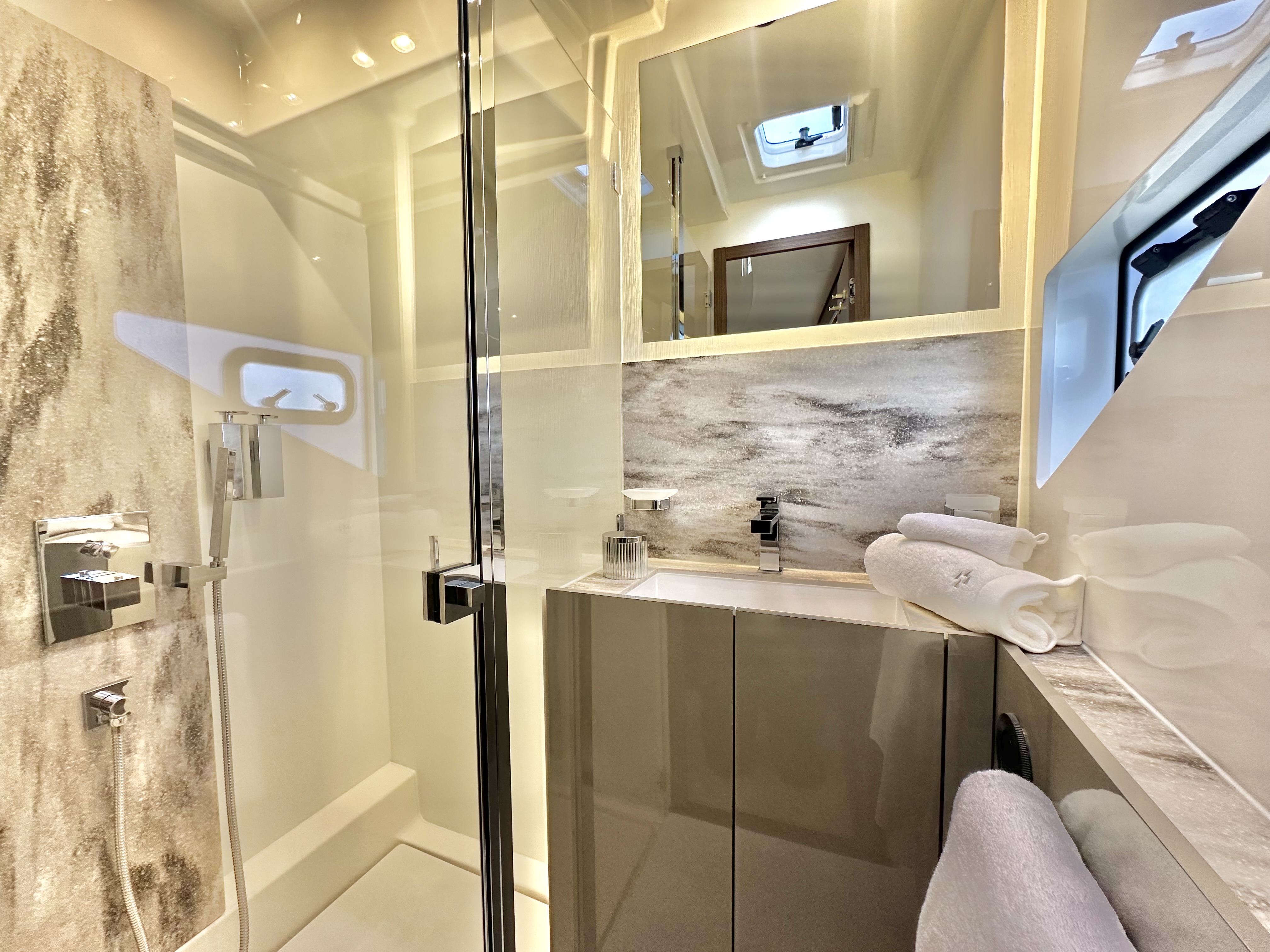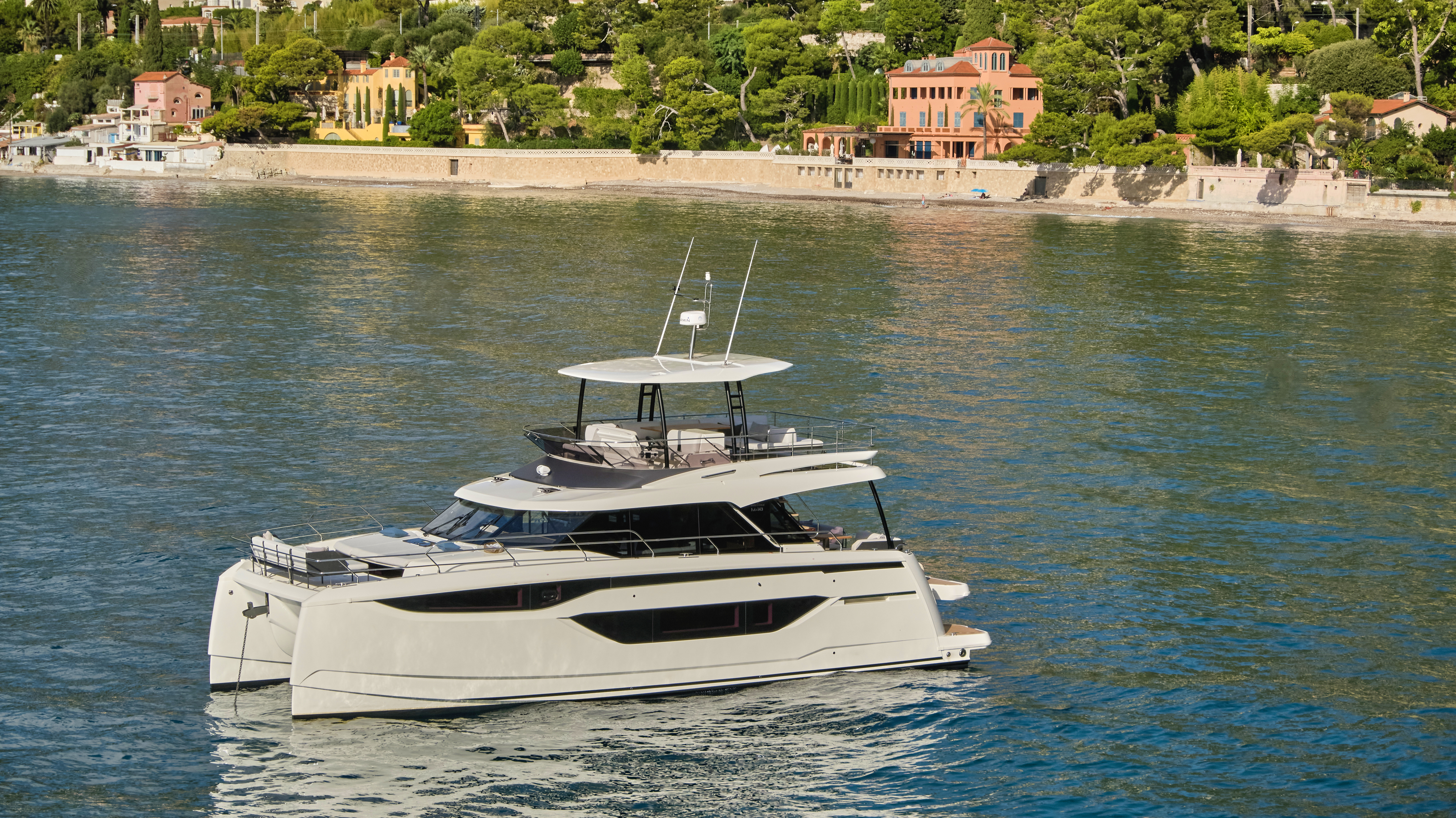 The M48 reveals generous, brightly lit, and refined living spaces, affording the ultimate in comfort. Whilst 48ft overall, the interior volume is equivalent to that of a 60-foot motor yacht. The deck surface allows for an optimized layout with vast zones for relaxation on the deck, flybridge and even a cockpit terrace. The flybridge has been maximised to provide living space as well as storage, and the hull shape offers an optimal balance between liveable space and seaworthy qualities. The M48 benefits from a wider beam than a monohull motor yacht of equal length, allowing for a full-beam owner’s suite, as well as entirely separate, private guest cabins.