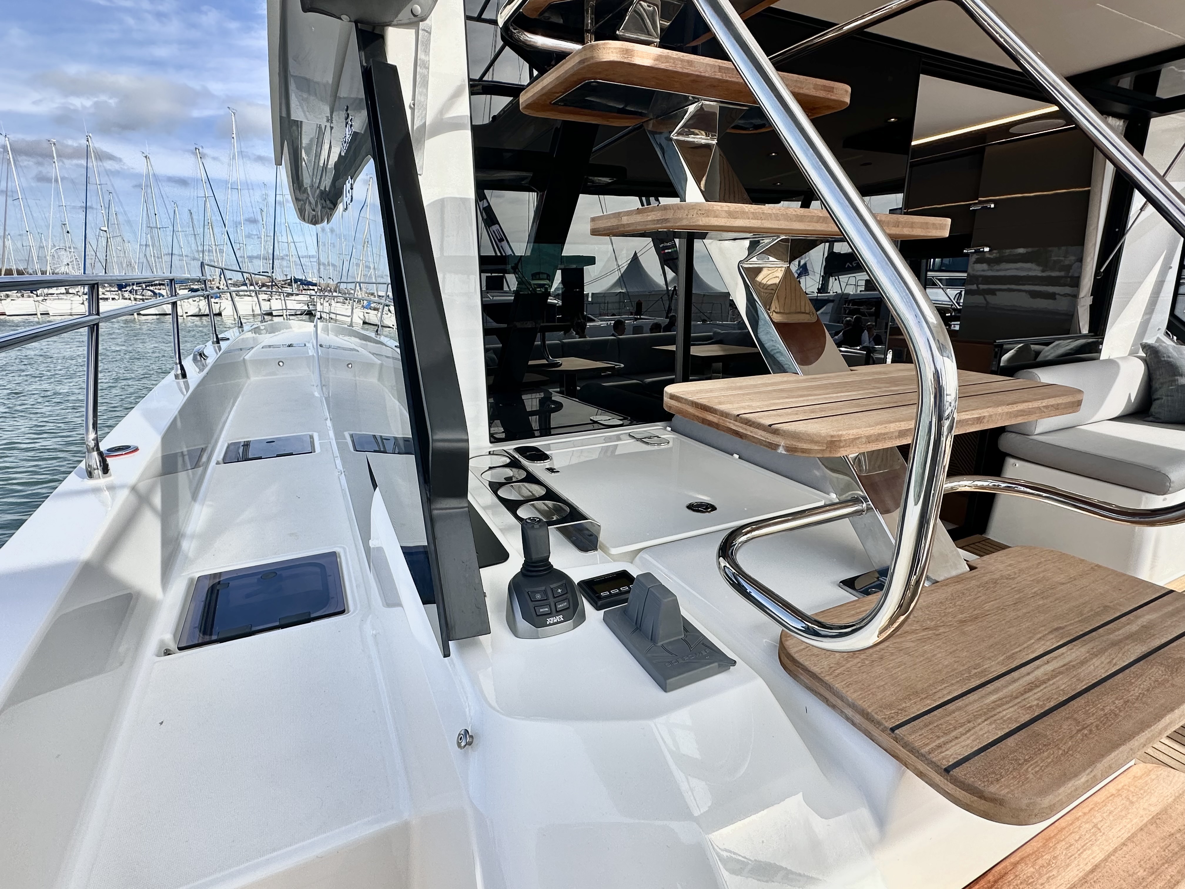 Helm console with engine throttles and Volvo Penta joystick, compass, 12 V plug, cup holders and storage compartment