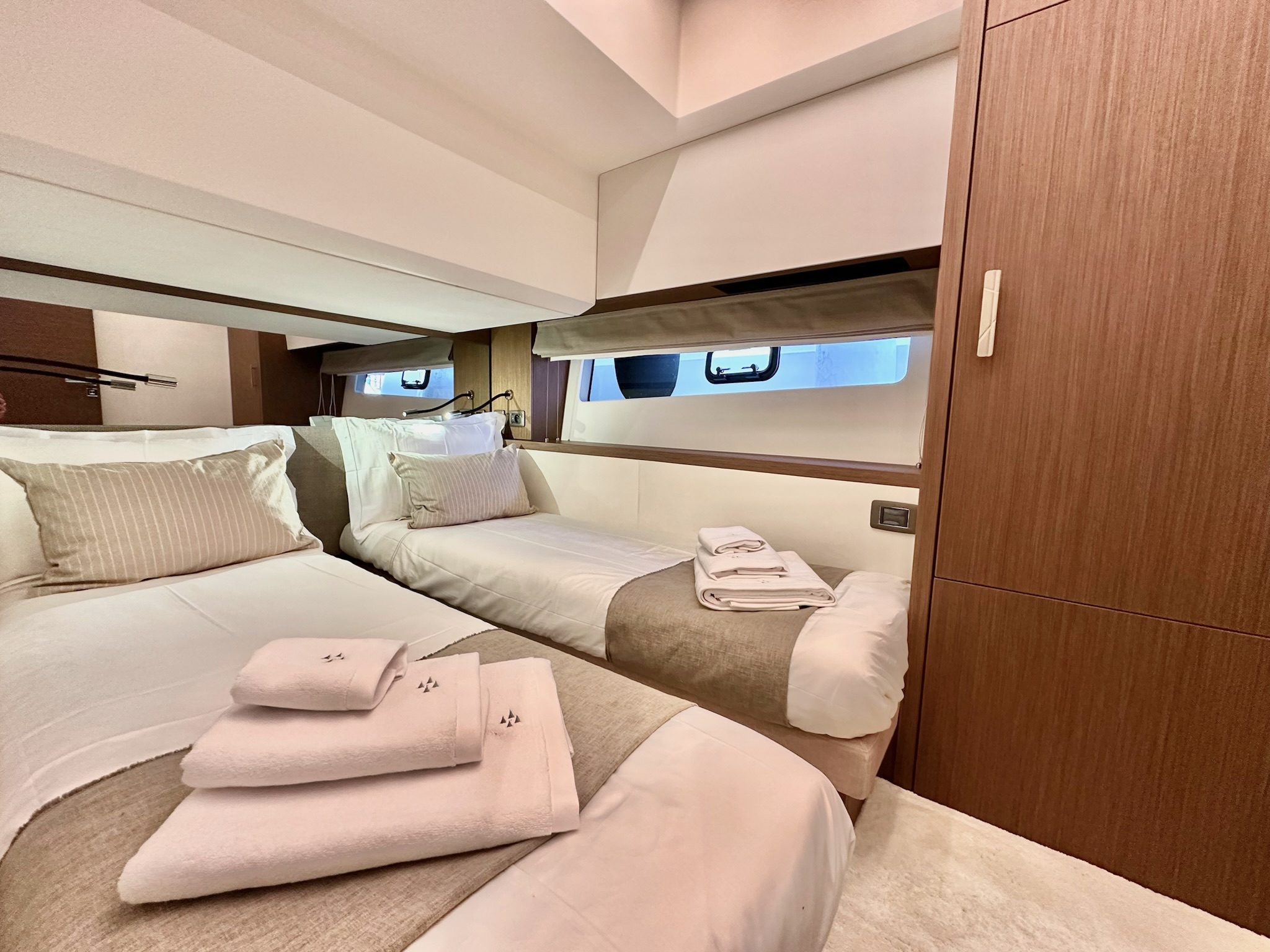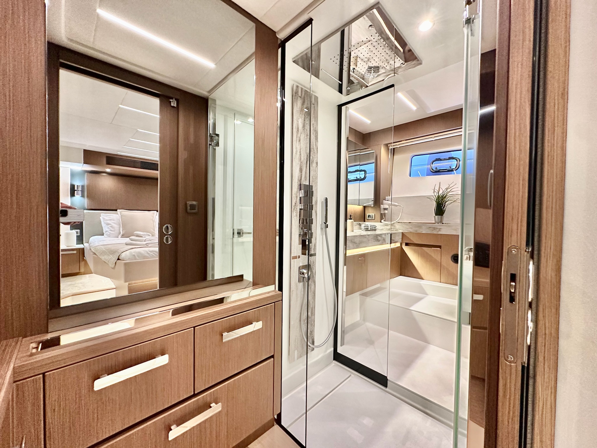 Diseñado para un crucero suave y armonioso, su diseño presenta una conexión perfecta con el mar. Completamente abierta, la "cabina infinita" ofrece una vista increíble del océano y un fácil acceso al salón a través de una gran puerta corredera eléctrica de cristal.