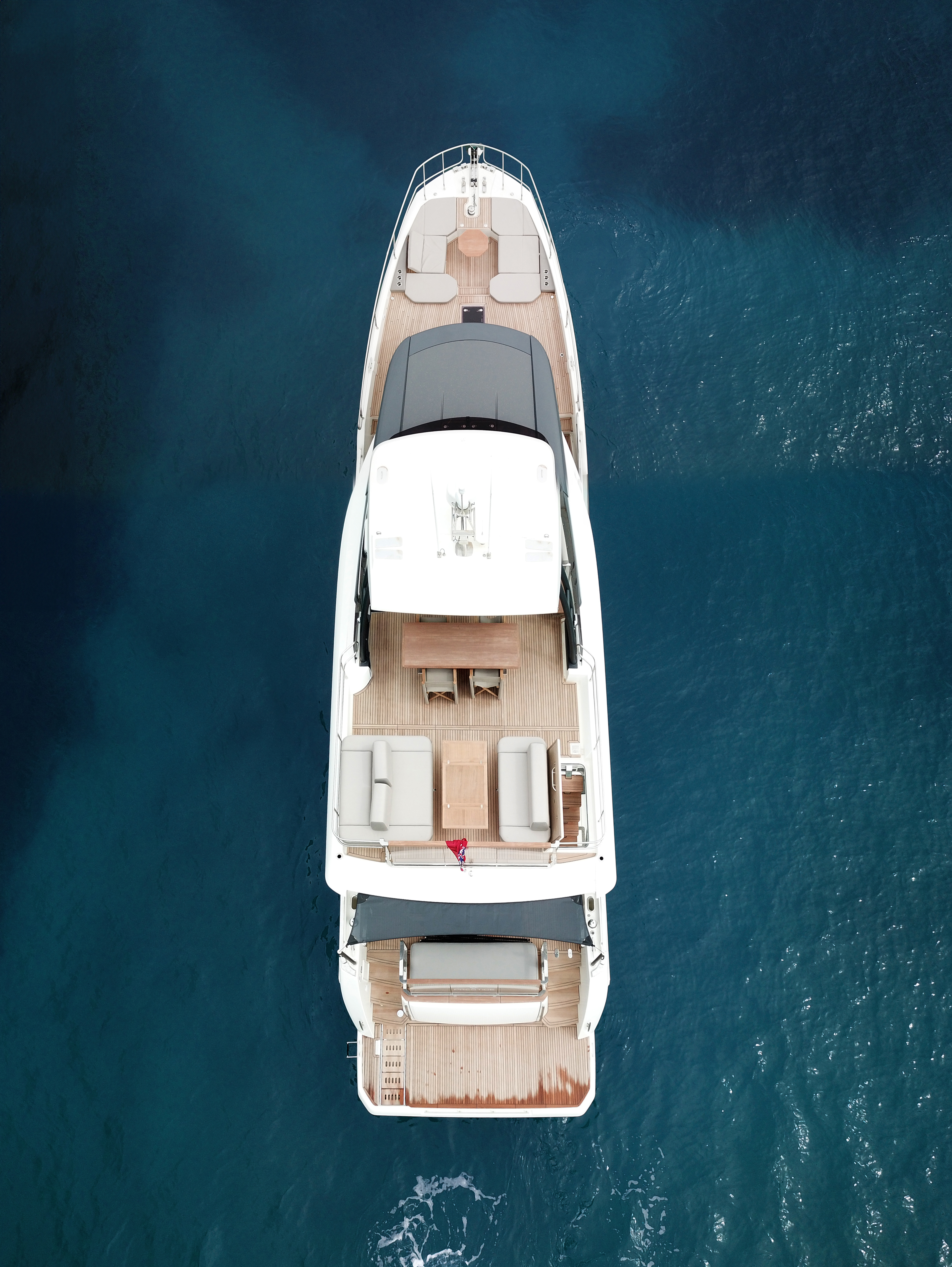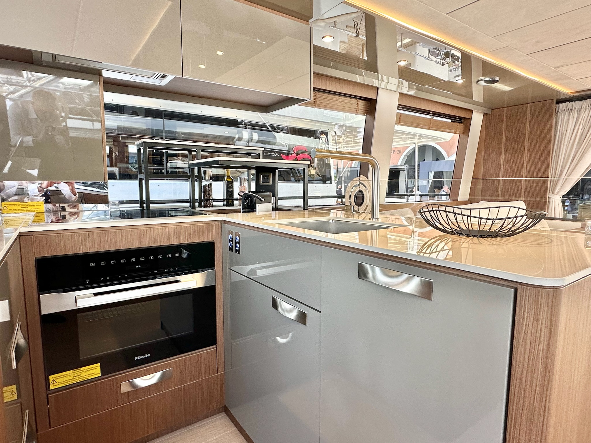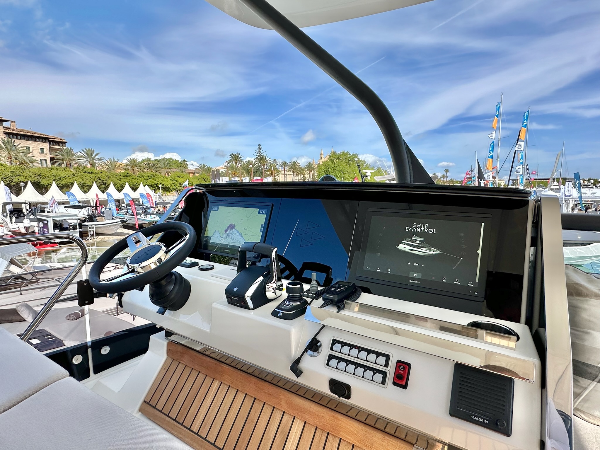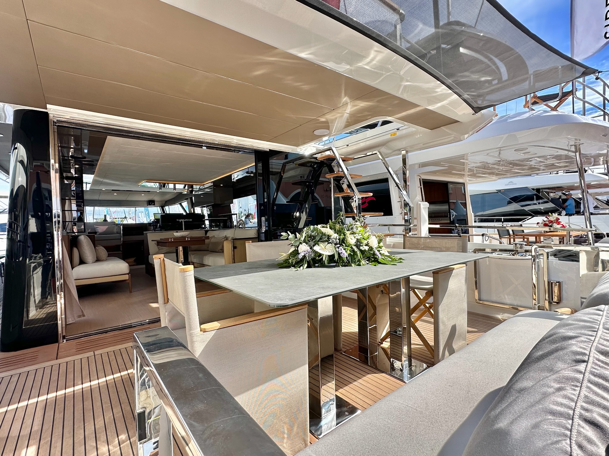 Ihr Design ist auf eine harmonische, sanfte Fahrt ausgelegt und bietet eine nahtlose Verbindung mit dem Meer. Das völlig offene "Infinity-Cockpit" bietet einen unglaublichen Blick auf das Meer und einen einfachen Zugang zum Salon durch eine große elektrische Glasschiebetür.