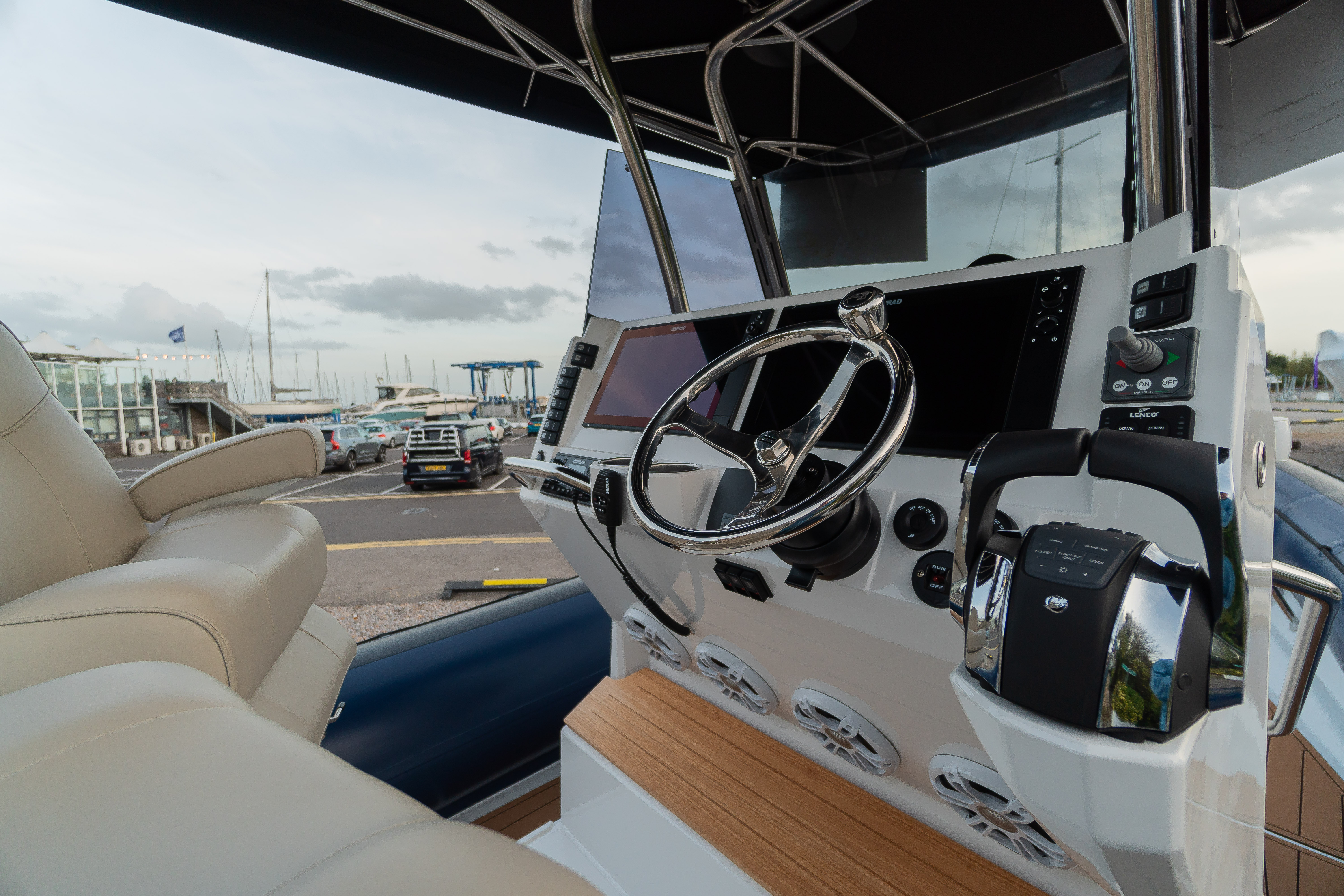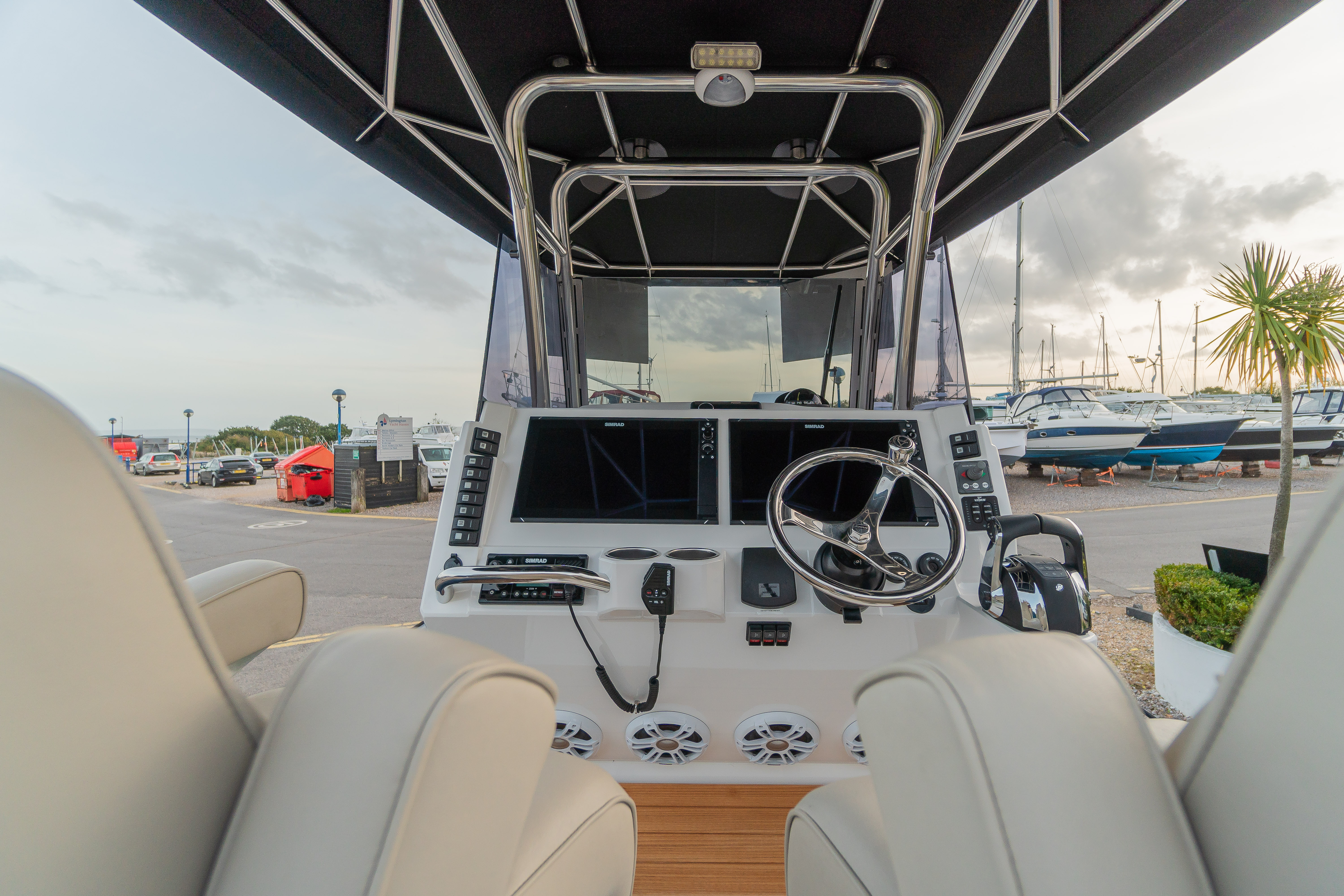 The 600 horsepower of Mercury Verado V8 engines give a fast, fun performance in a high quality, efficient hull. The smooth ride is boosted by the luxury soft rider helm seats, where you can drive under the protection of the bimini and windscreen.