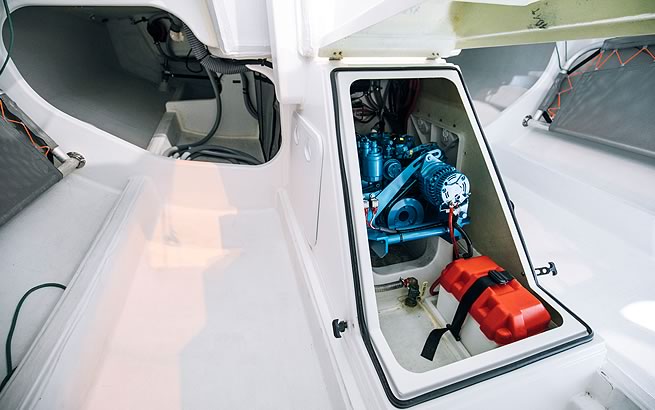 Textile anchor locker at the bow under deck hatch