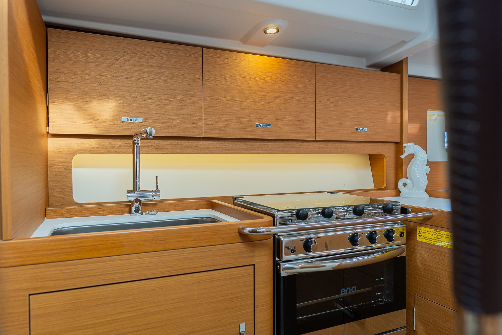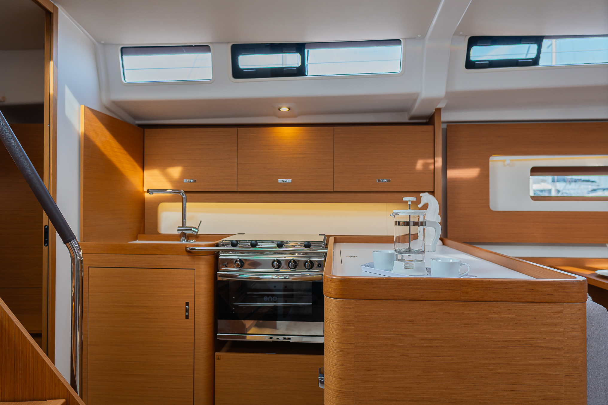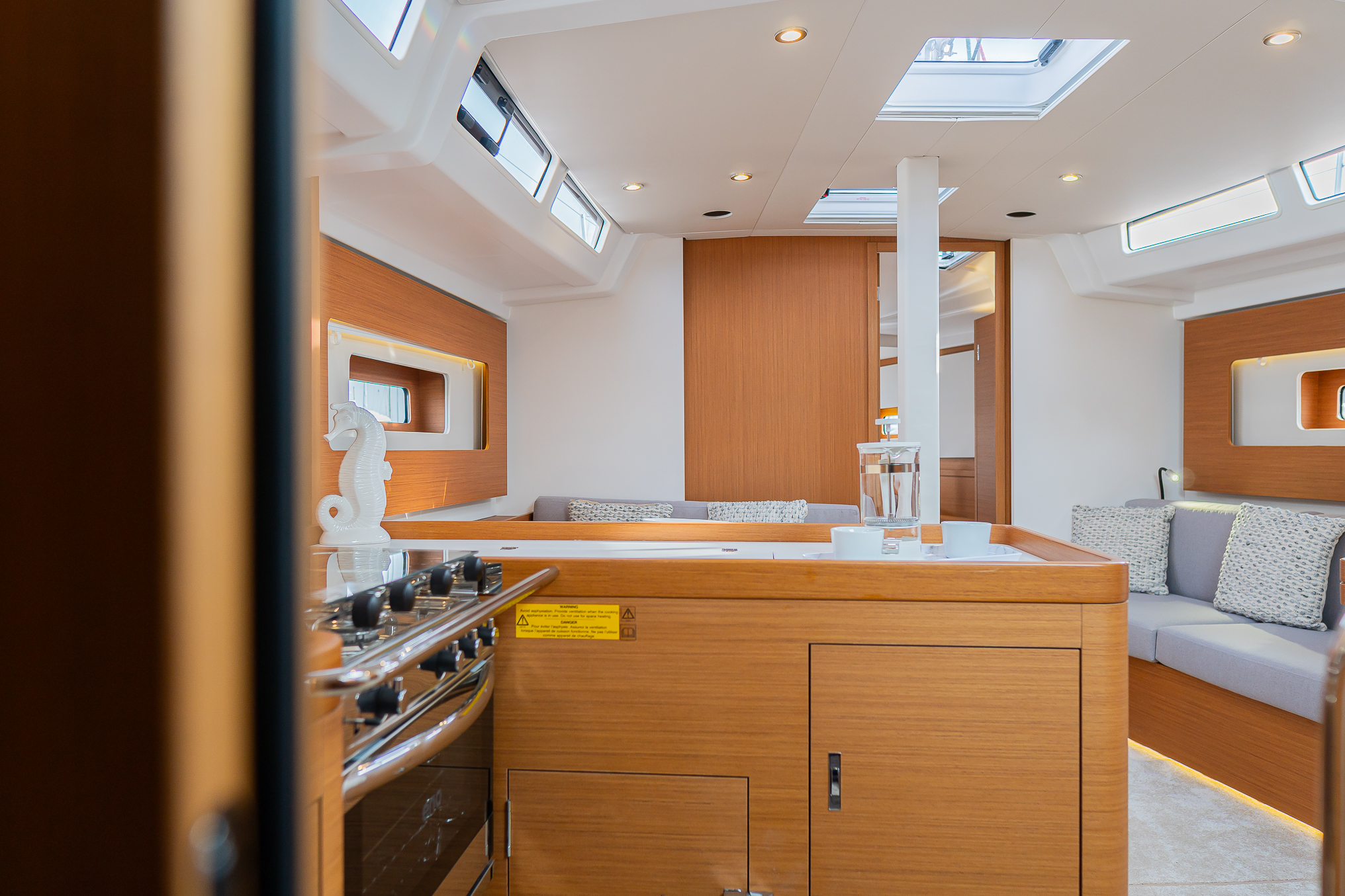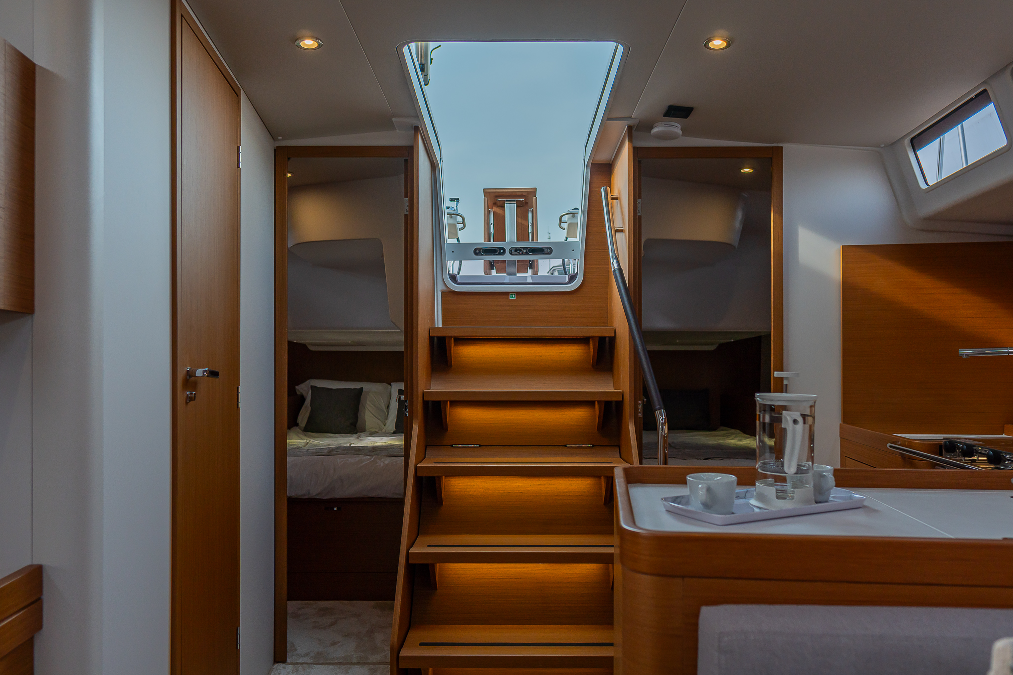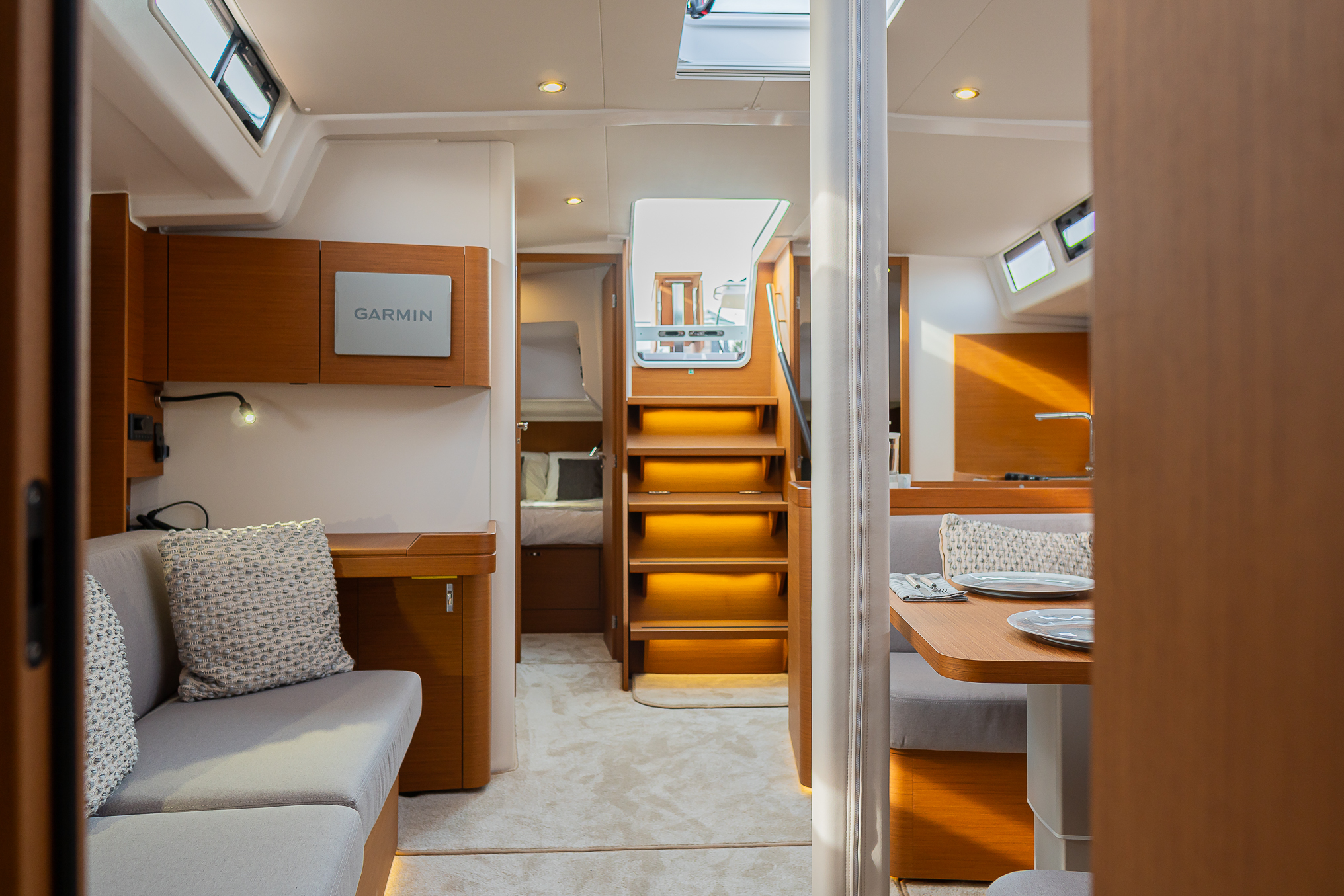 Inside, the First 44 boasts a well-appointed layout with three cabins, including a forward master suite with en-suite facilities and two aft cabins, along with an additional day head. The saloon, designed for both comfort and functionality, seamlessly combines dining, galley, and navigation spaces while maintaining the bright, open atmosphere Beneteau yachts are known for.