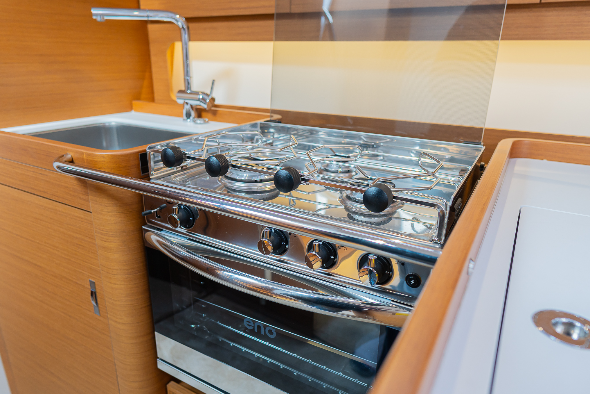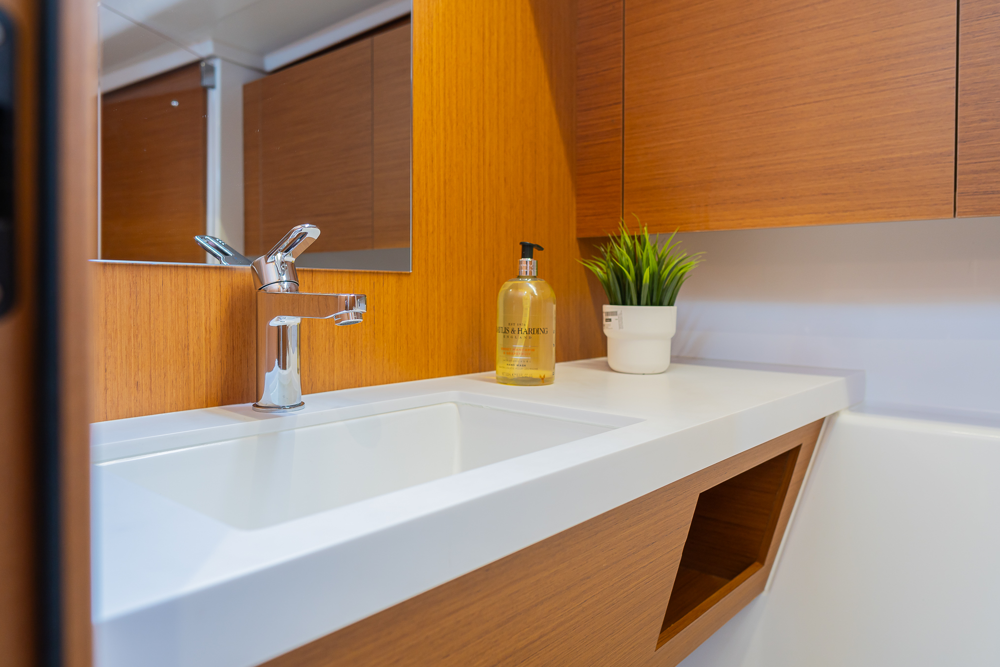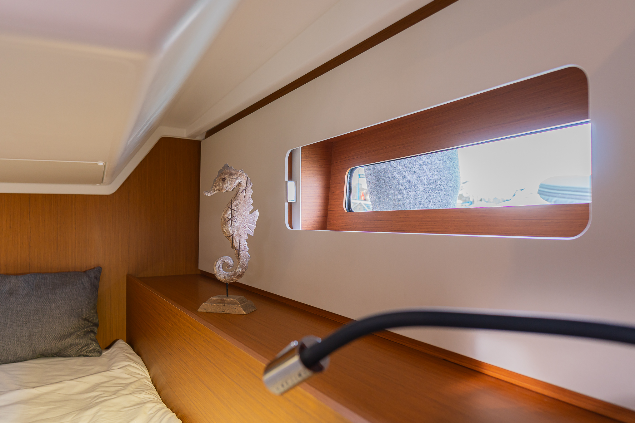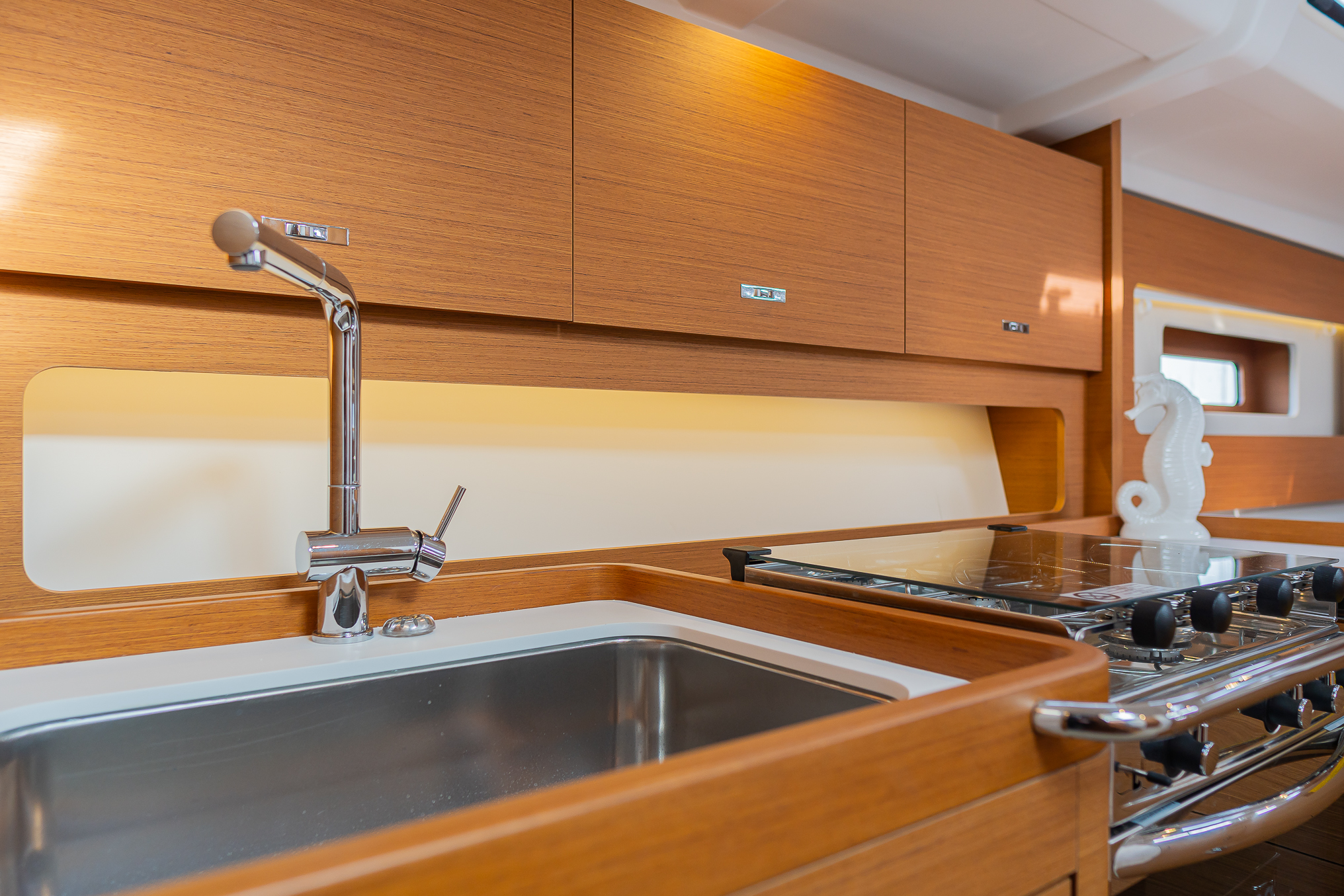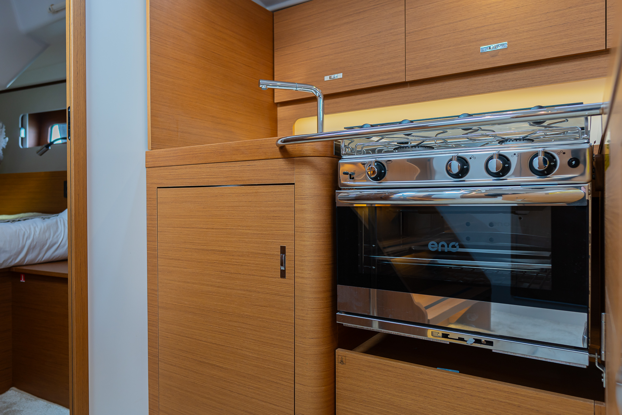 Inside, the First 44 boasts a well-appointed layout with three cabins, including a forward master suite with en-suite facilities and two aft cabins, along with an additional day head. The saloon, designed for both comfort and functionality, seamlessly combines dining, galley, and navigation spaces while maintaining the bright, open atmosphere Beneteau yachts are known for.