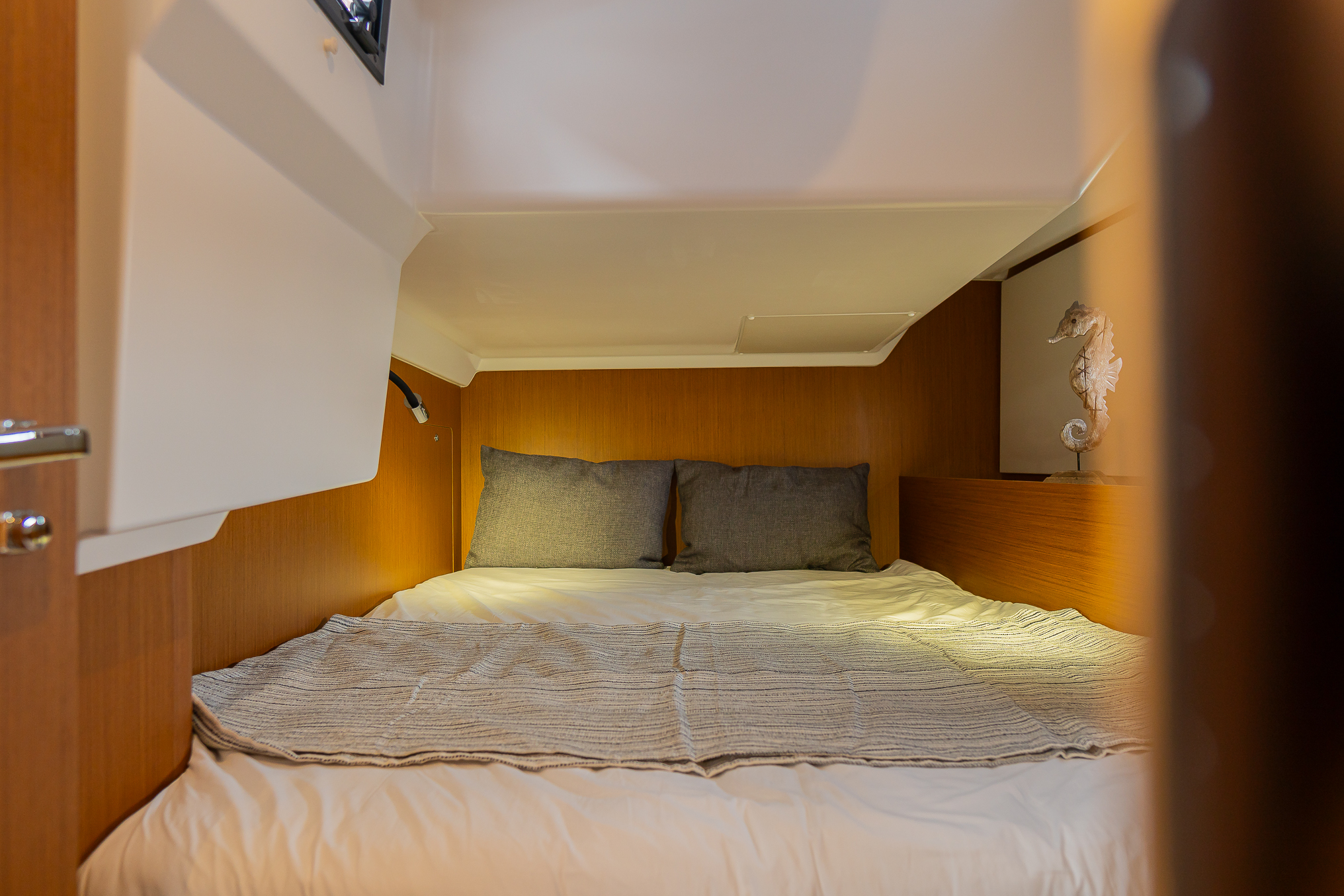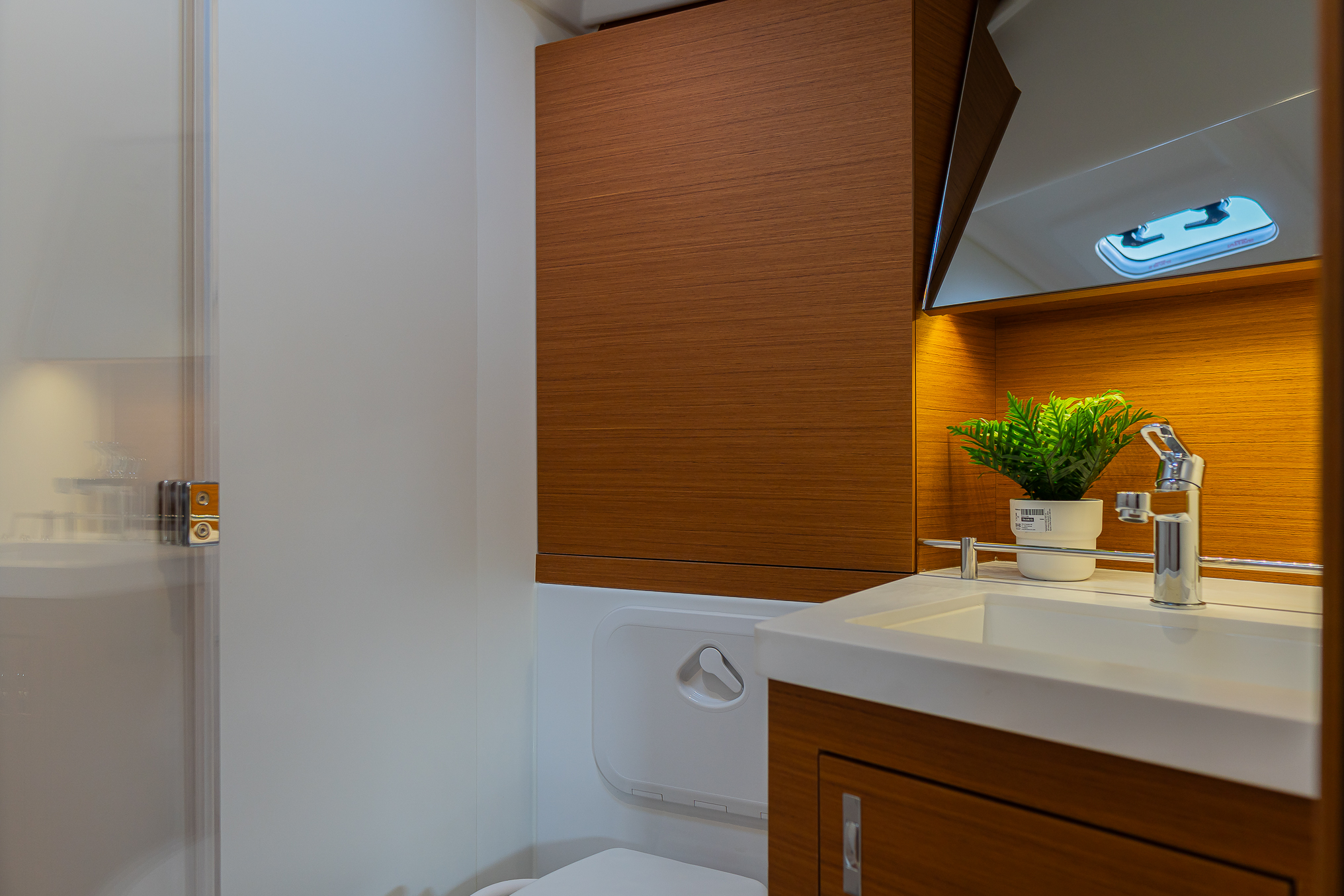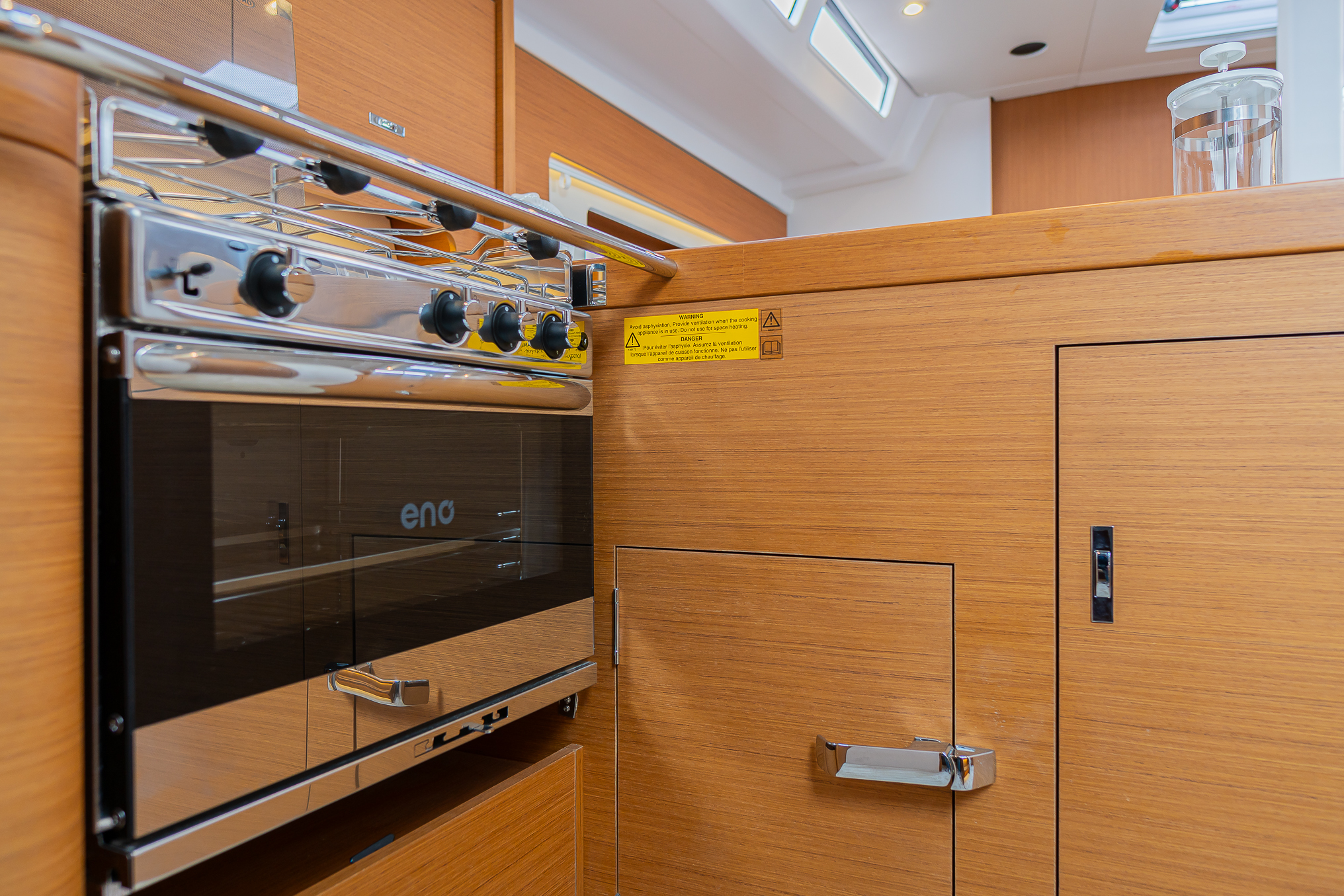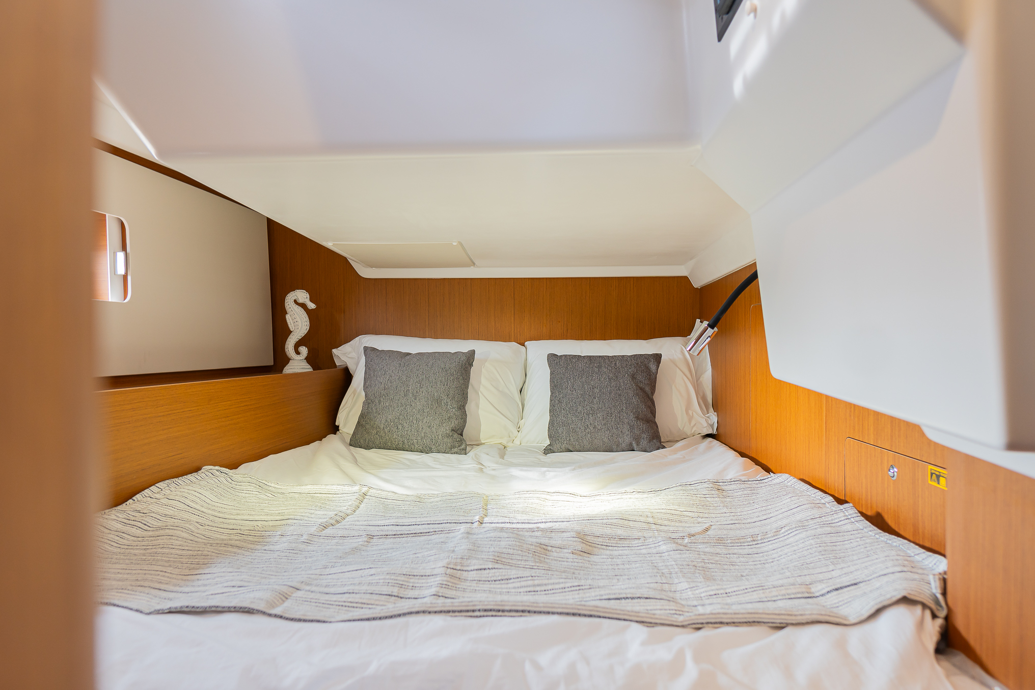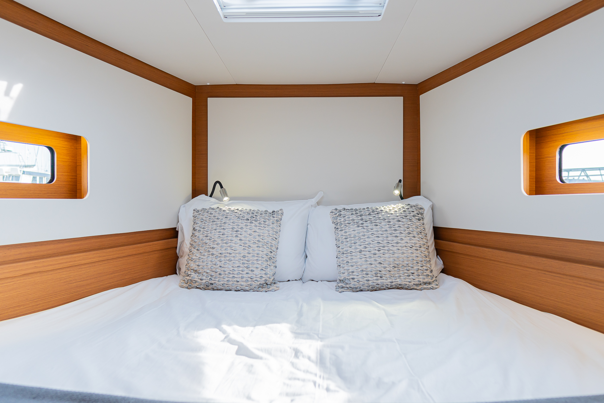 Inside, the First 44 boasts a well-appointed layout with three cabins, including a forward master suite with en-suite facilities and two aft cabins, along with an additional day head. The saloon, designed for both comfort and functionality, seamlessly combines dining, galley, and navigation spaces while maintaining the bright, open atmosphere Beneteau yachts are known for.