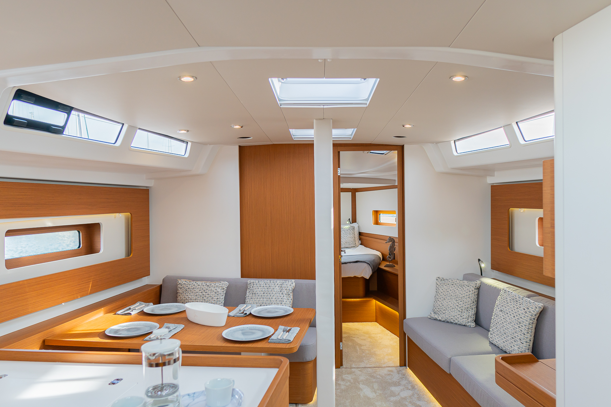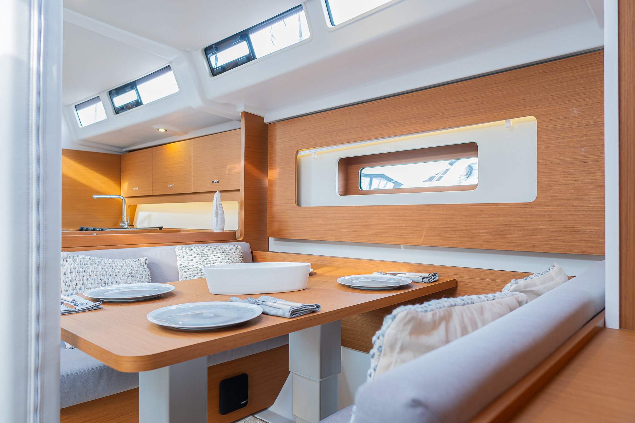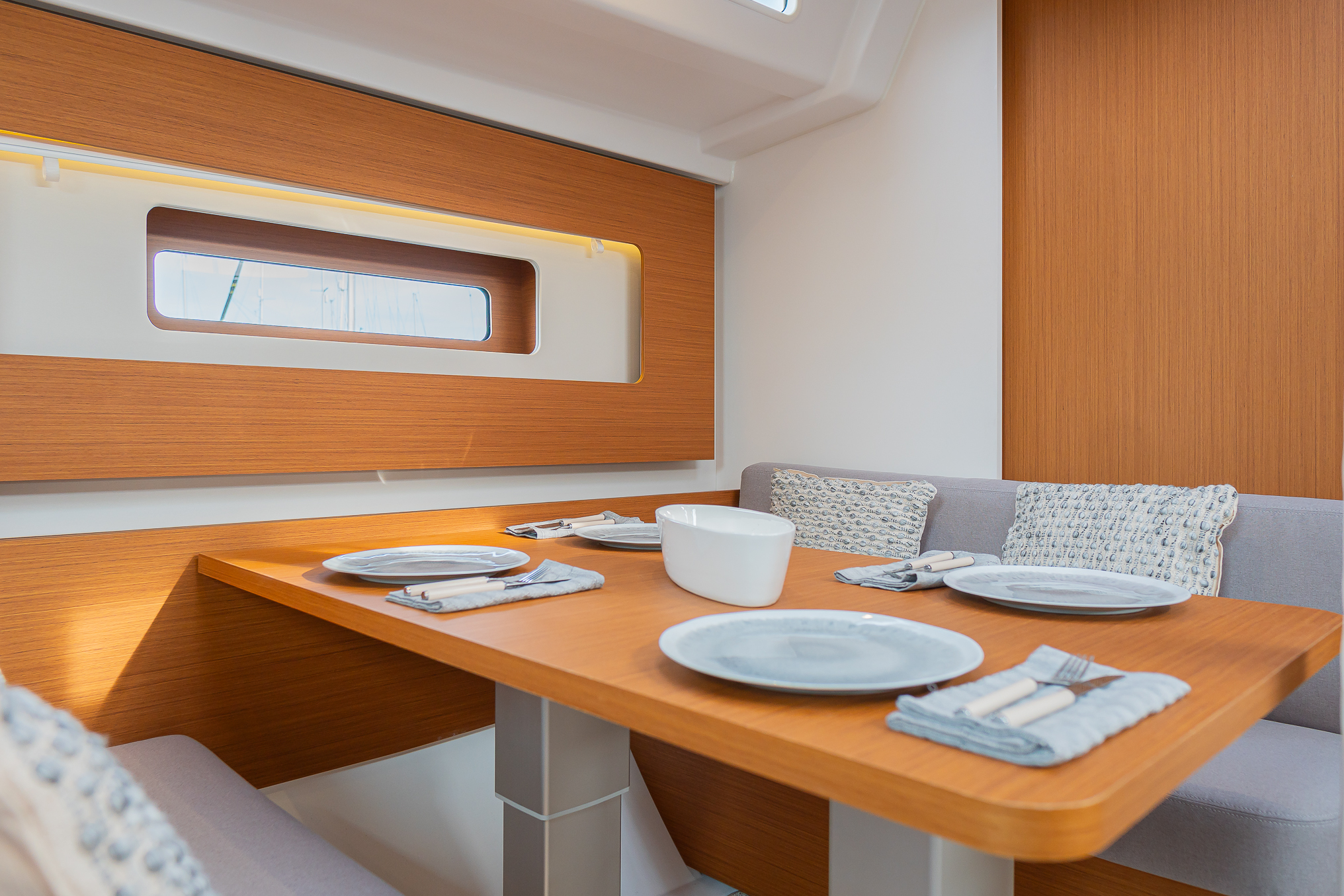 Saloon table on electric pedestal with facing benches seating up to 6 on port side converts to double berth with cushion matching saloon upholstery