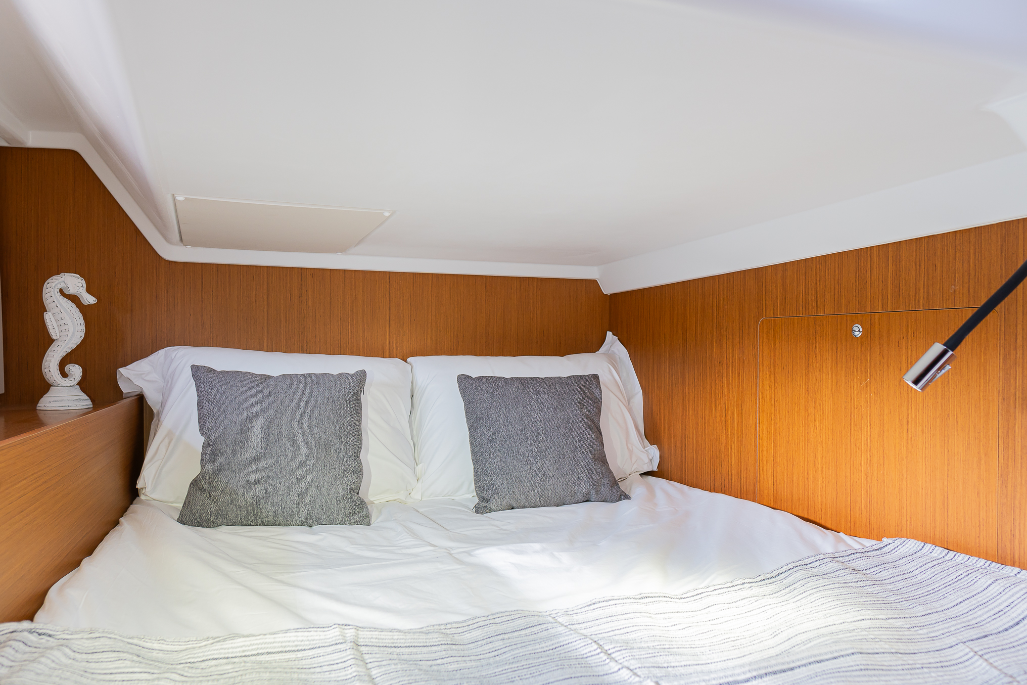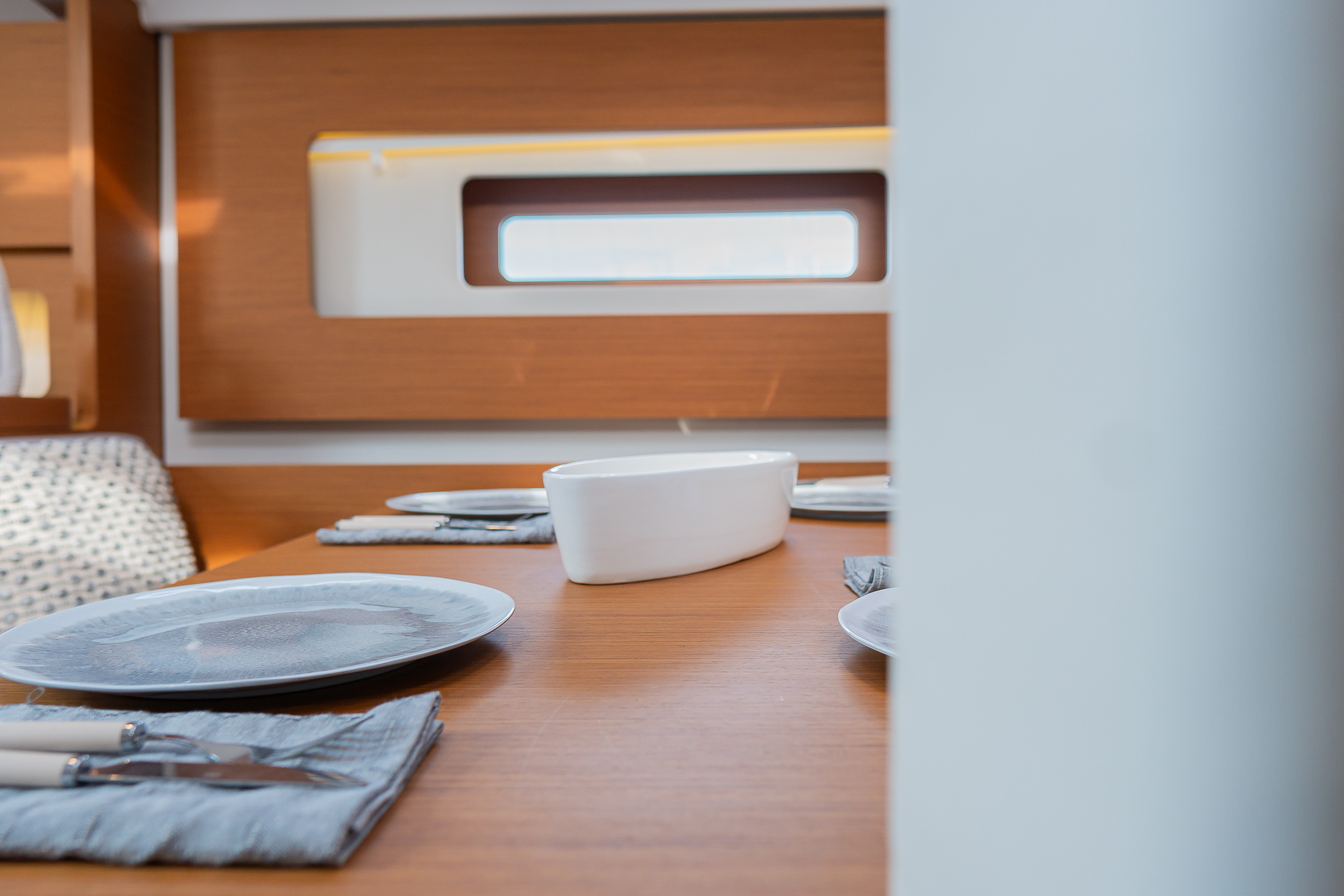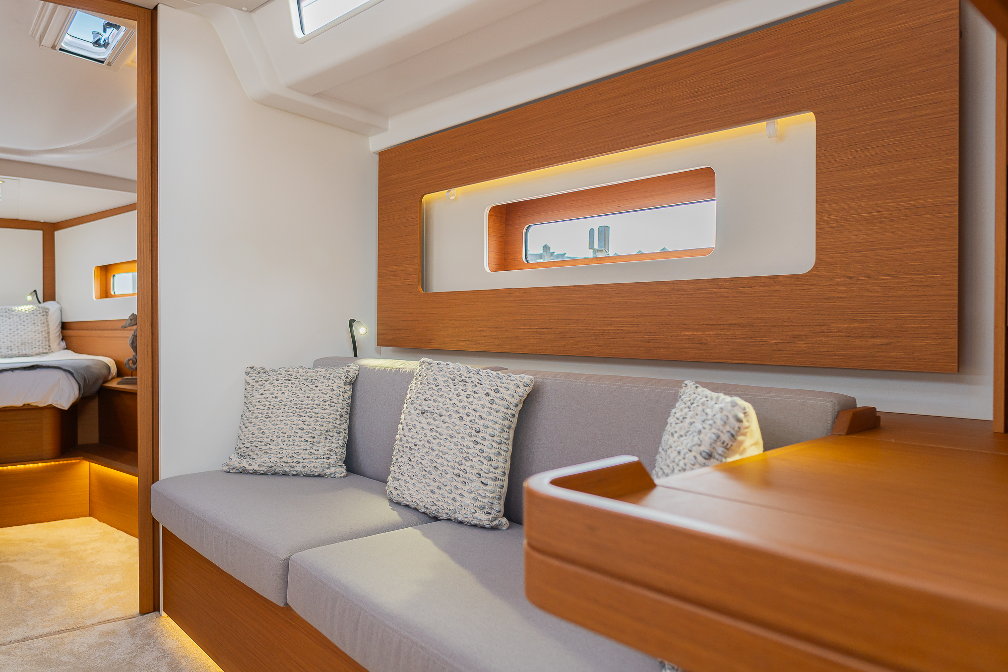 Saloon table on electric pedestal with facing benches seating up to 6 on port side converts to double berth with cushion matching saloon upholstery