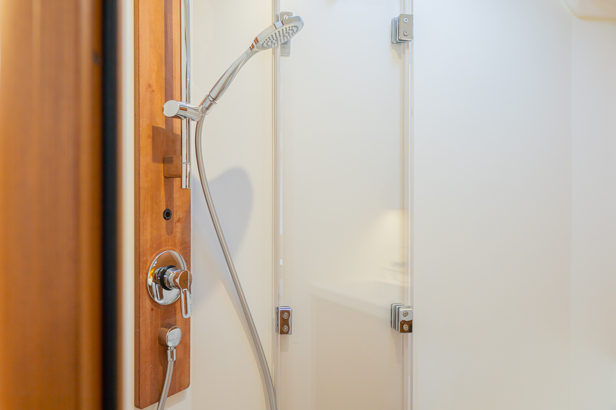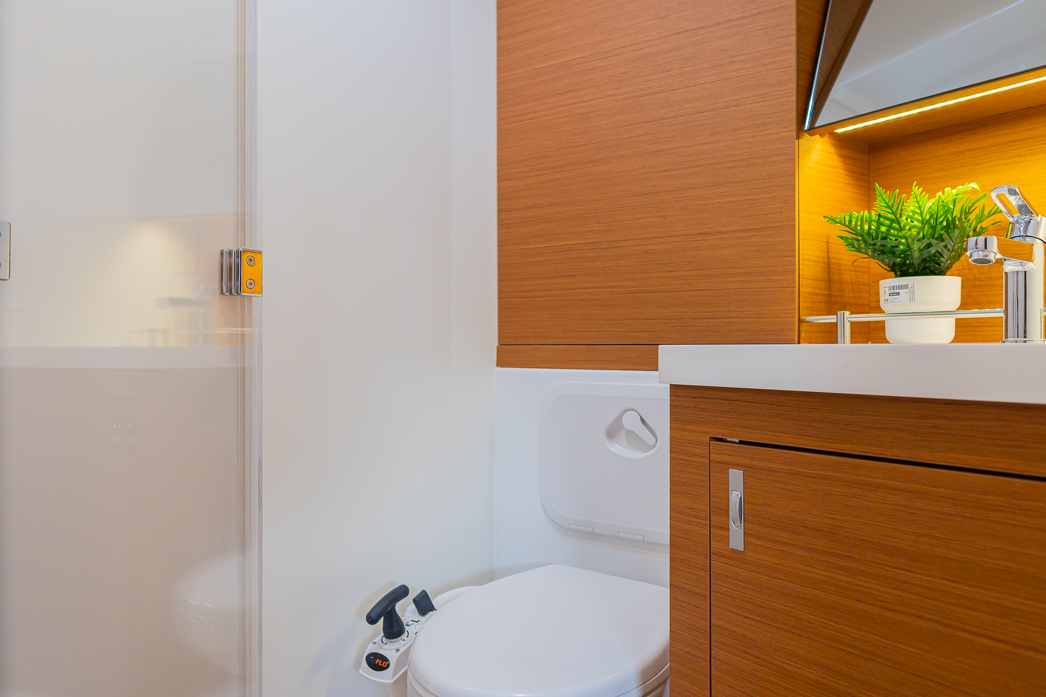 En-suite heads with Tecma electric flush toilet, shower with foldable screen, integrated handbasin with mixer tap
