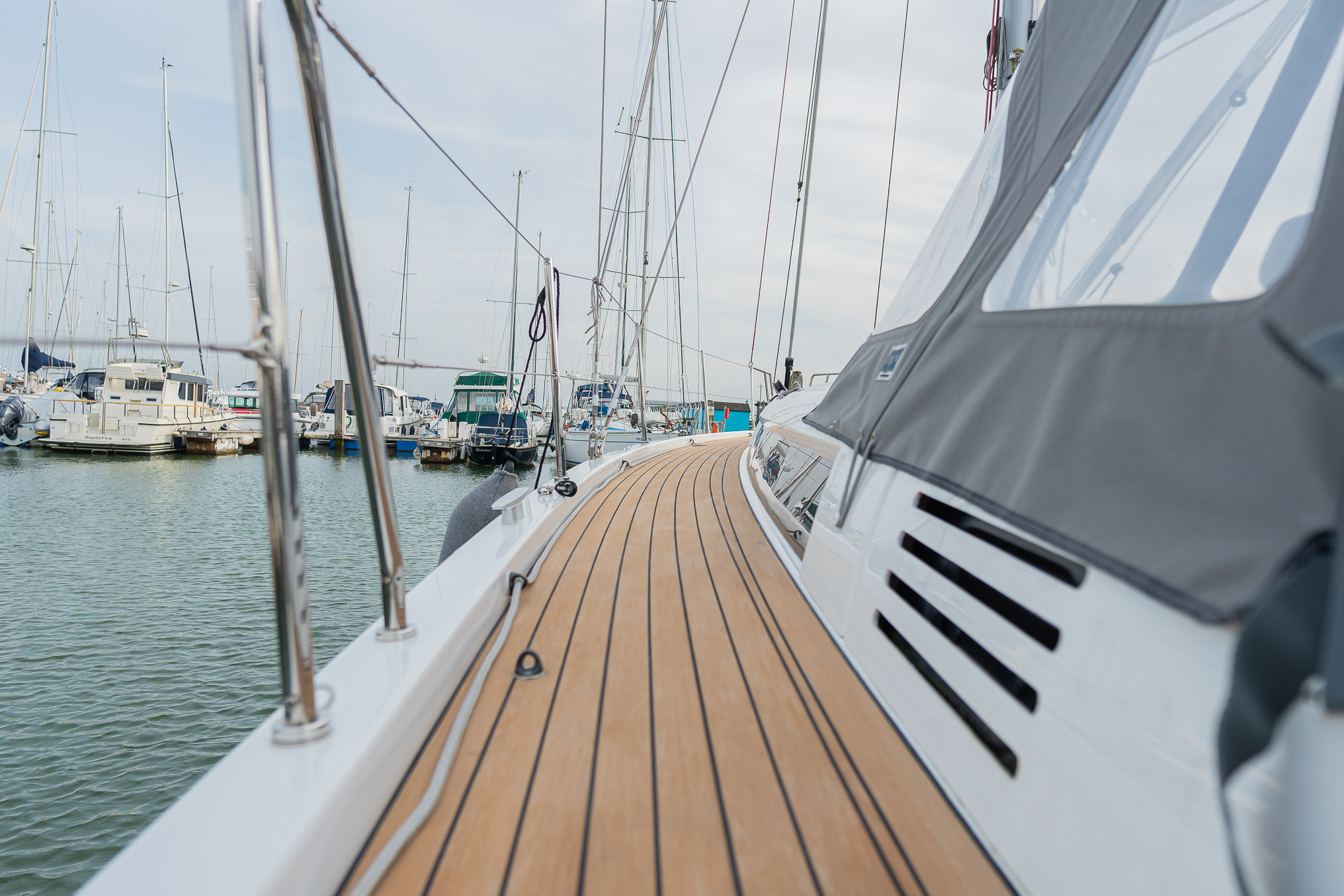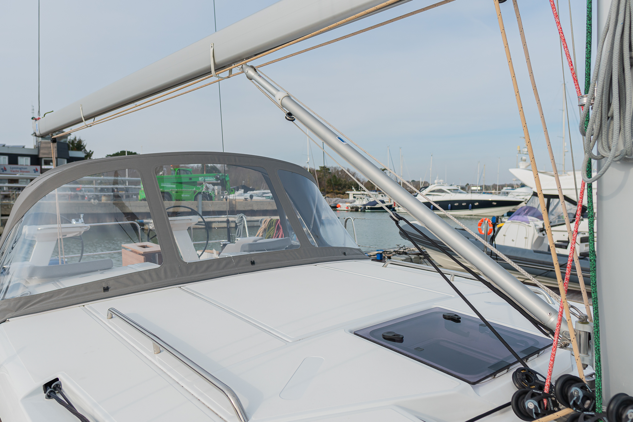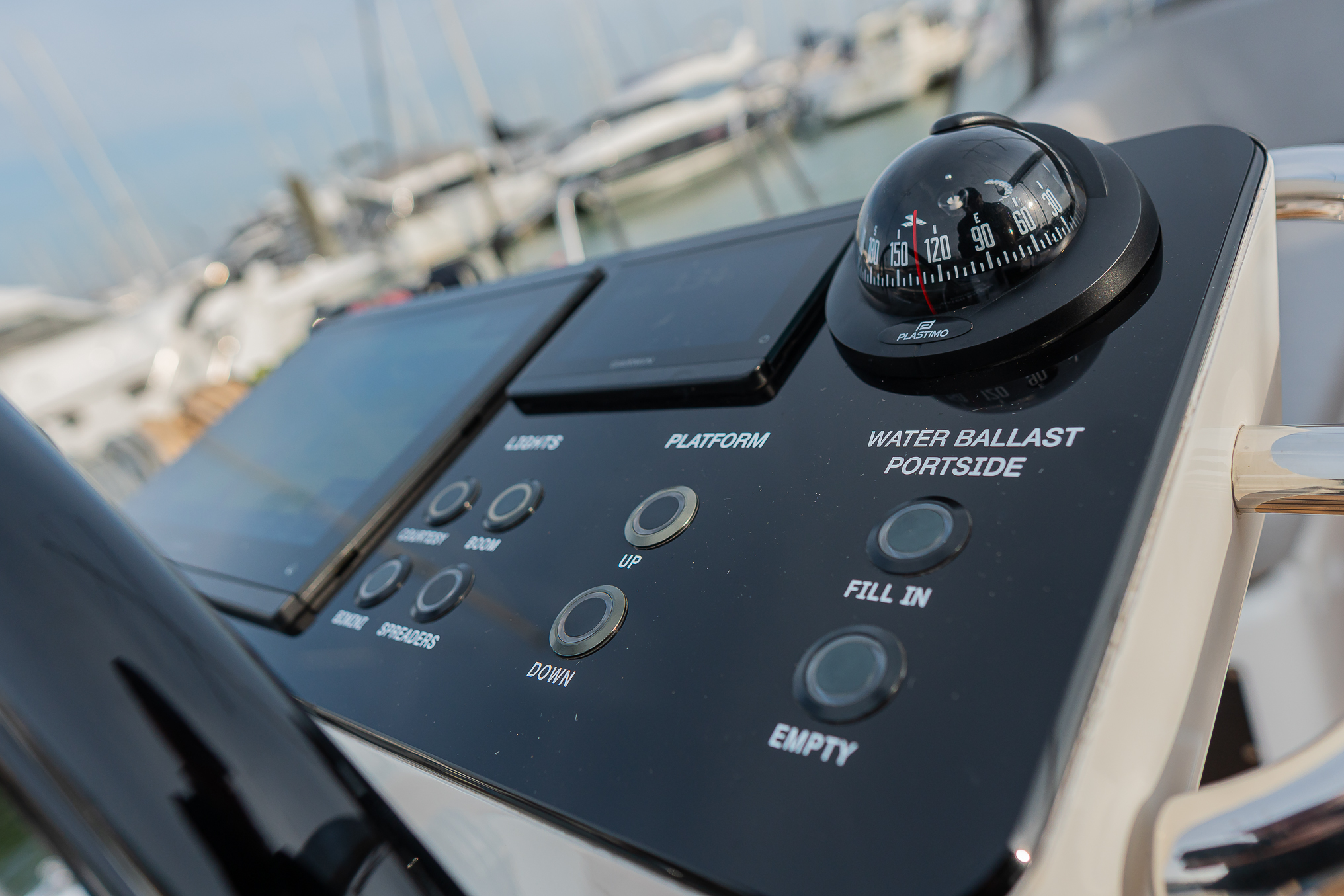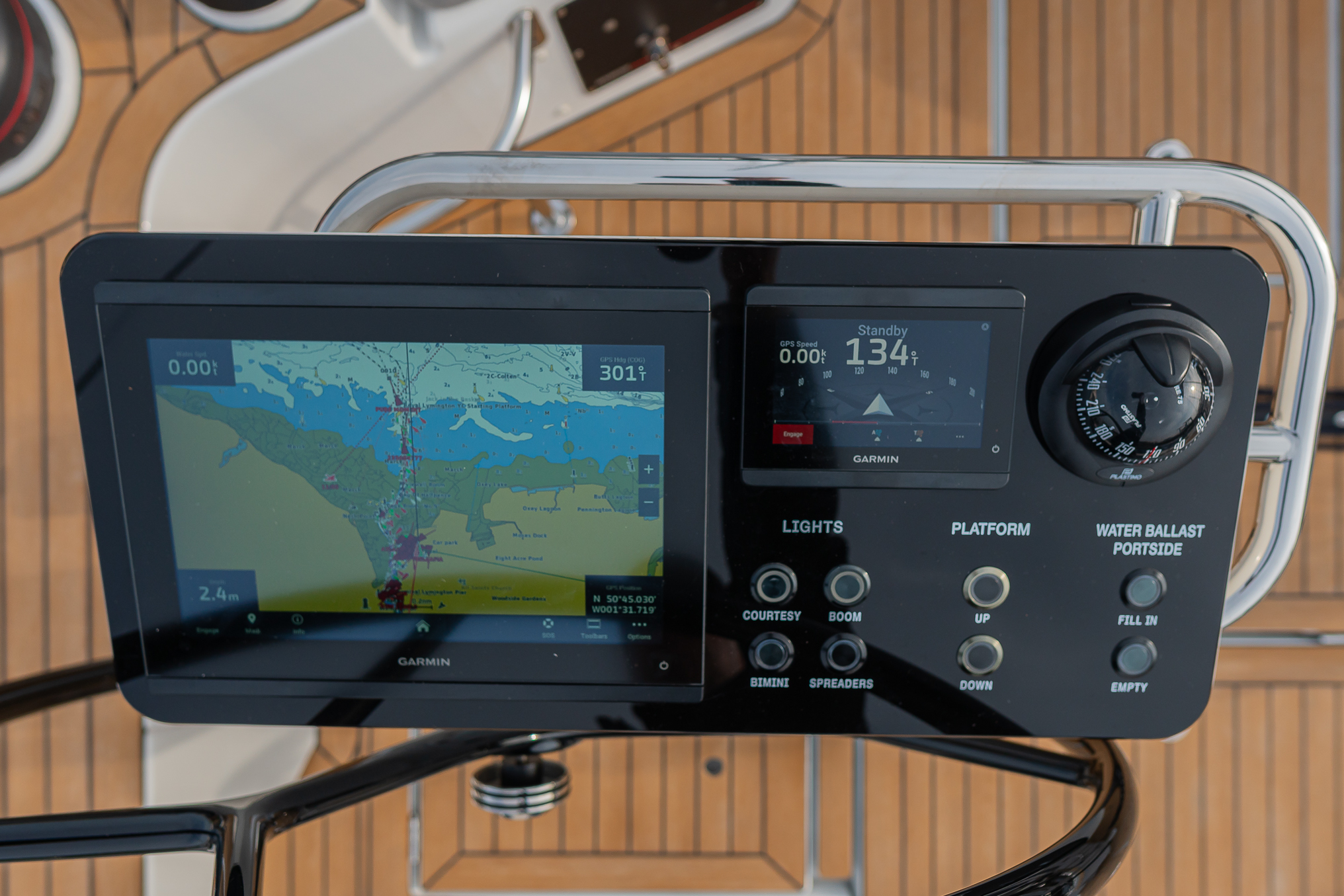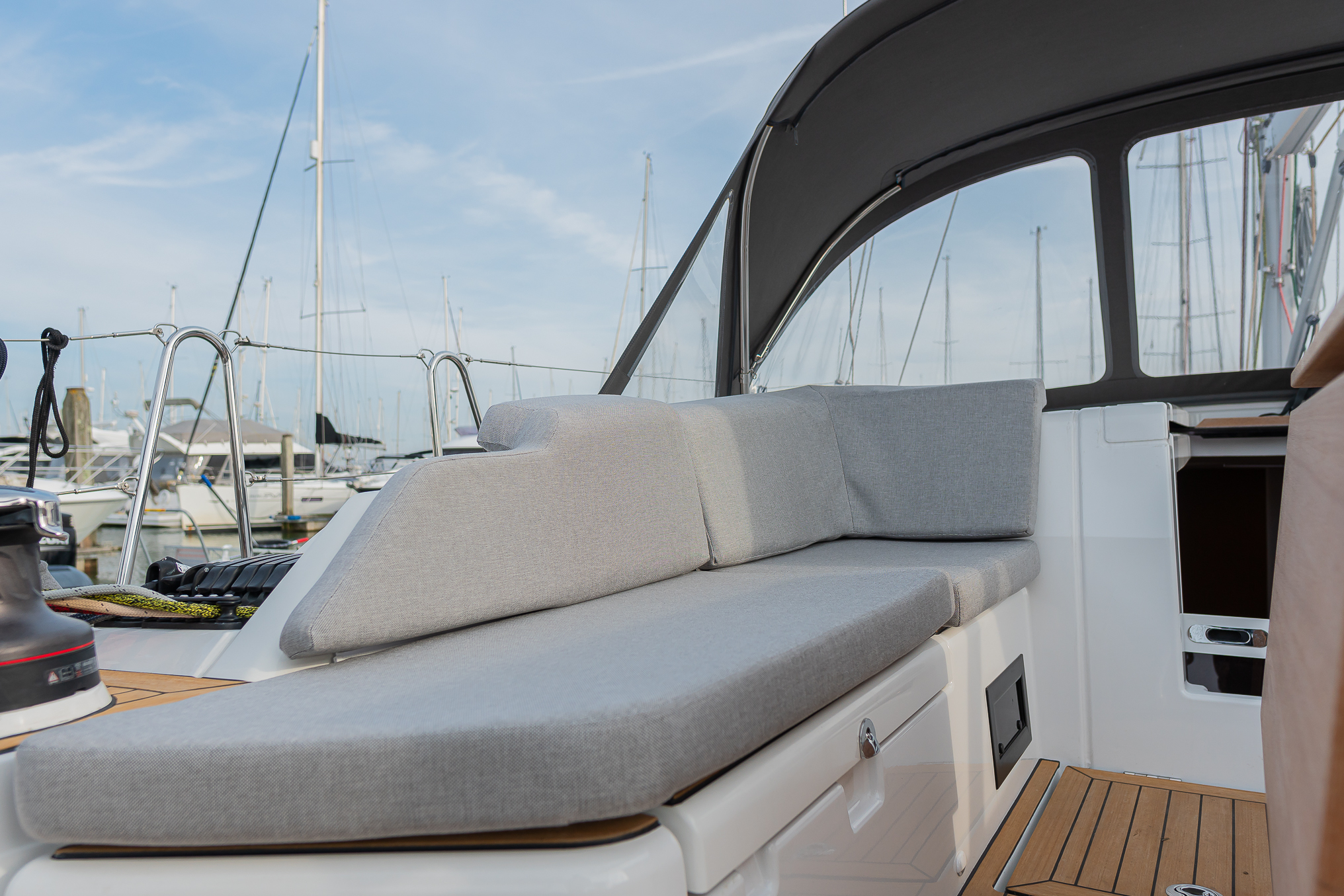 The cockpit is thoughtfully designed for social sailing, featuring four winches positioned conveniently forward of the helm and easy access to spacious side decks. The sail plan is expertly crafted to achieve a perfect balance between the mainsail and foresail, ensuring optimal sailing performance.