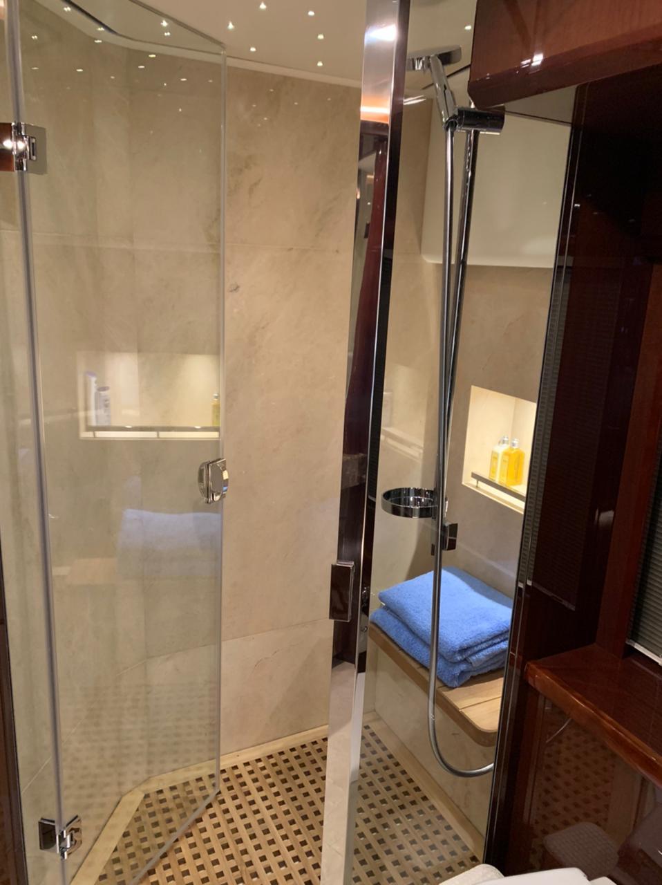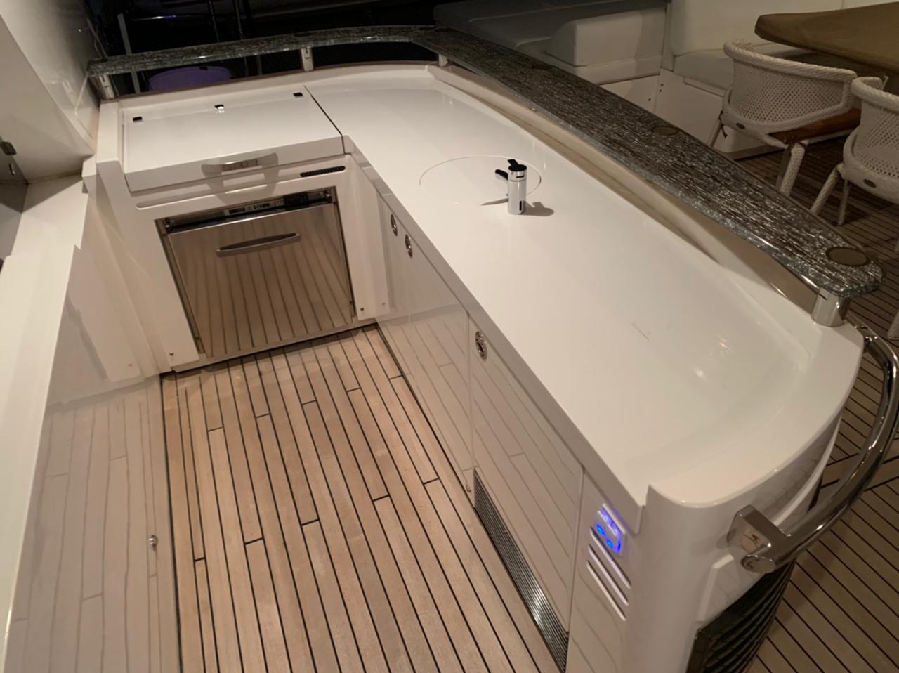 Gangway (remote-controlled) Cockpit cushions, shower, teak cockpit Tender & liferaft included Teak side decks Swimming ladder Flybridge crane Hydraulic bathing platform Aft mooring winches
