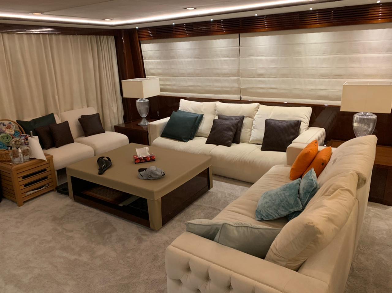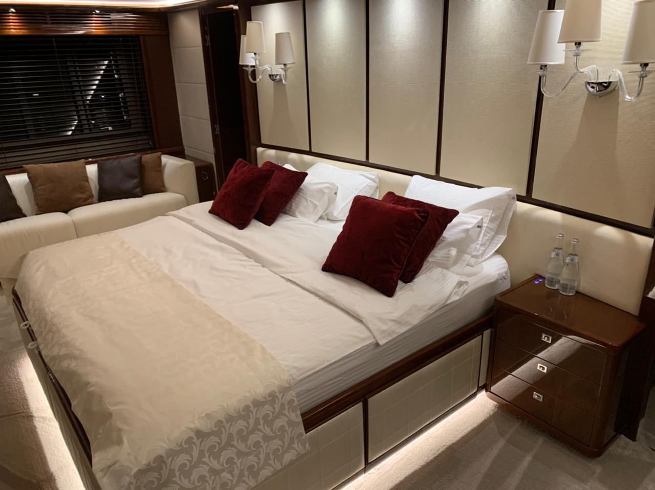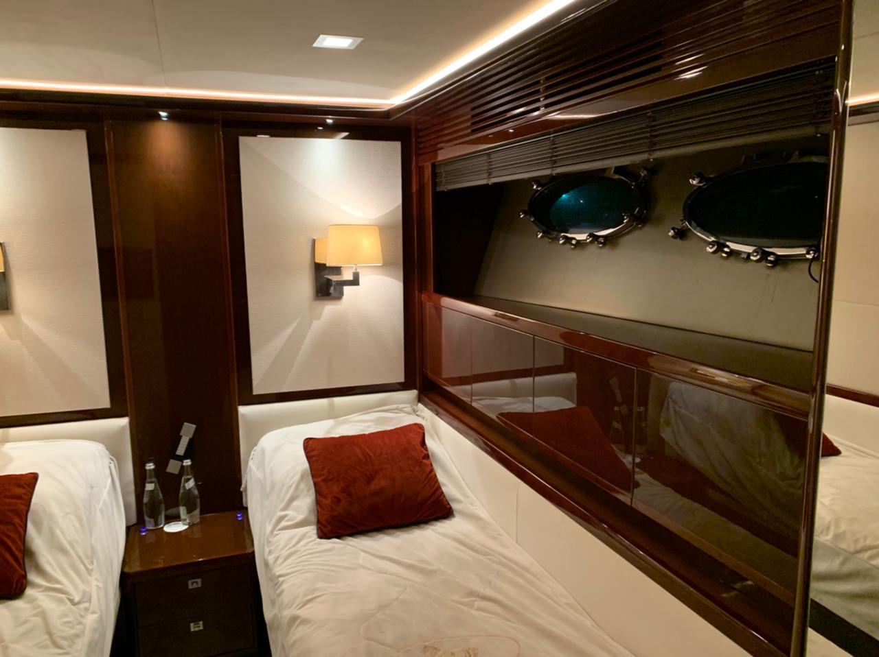 Twin MTU 16V 2000CR engines, 2400 hp each Max speed 25–27 knots 5 guest cabins with ensuite heads 3-seater jet ski garage & 1200 kg flybridge crane Watermaker (220 L/h), twin 40 kW generators Walk-through bow lounge with coffee table Teak decks: cockpit, side decks & flybridge CCTV, FLIR thermal camera, autopilot, dual VHF Fully equipped galley with dishwasher, oven, freezer Separate washer, dryer & combined unit Raise-and-fall salon TV, guest cabin LED TVs Remote gangway & bathing platform Fendi furniture and upscale interior finish Battery charger, air con, shore power, bow & stern thrusters