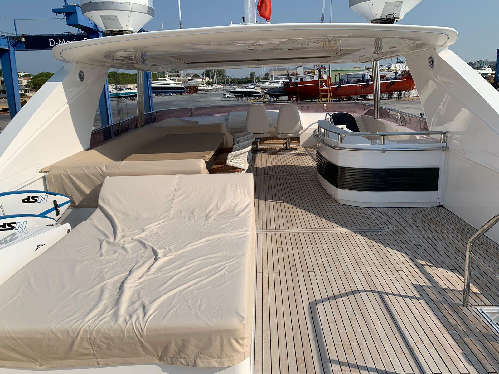 VAT-unpaid Princess 98 MY from 2012 in superb condition with full-spec and Fendi-styled interior. 5 cabins, 2400 hp MTUs, and a garage for a jet ski — ready for inspection in Antalya.