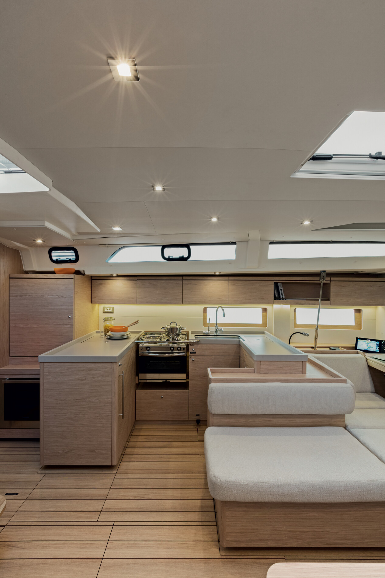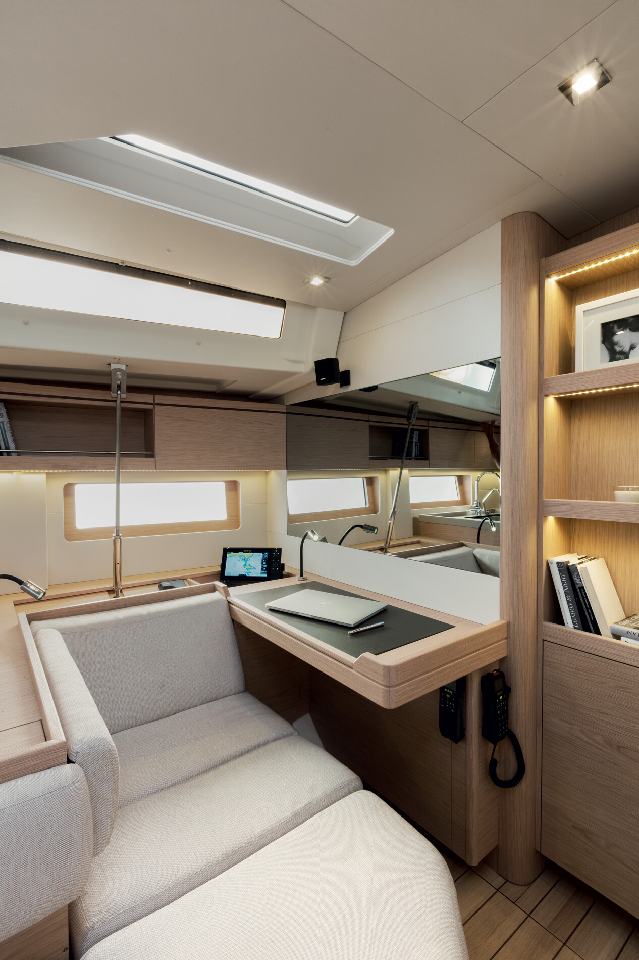 Headroom: 2,03 m / 6’8’’. U shaped saloon bench - double density foam. 1 Flexible and swiveling reading light. Saloon table - Varnished wooden top. Storage under bench seats. Mirrors in the saloon on forward bulkhead on the forward bulkhead. Bottle rack behind the bench against the forward bulkhead. Panoramic coachroof windows with curtains. 2 Hull portholes, pleated blinds