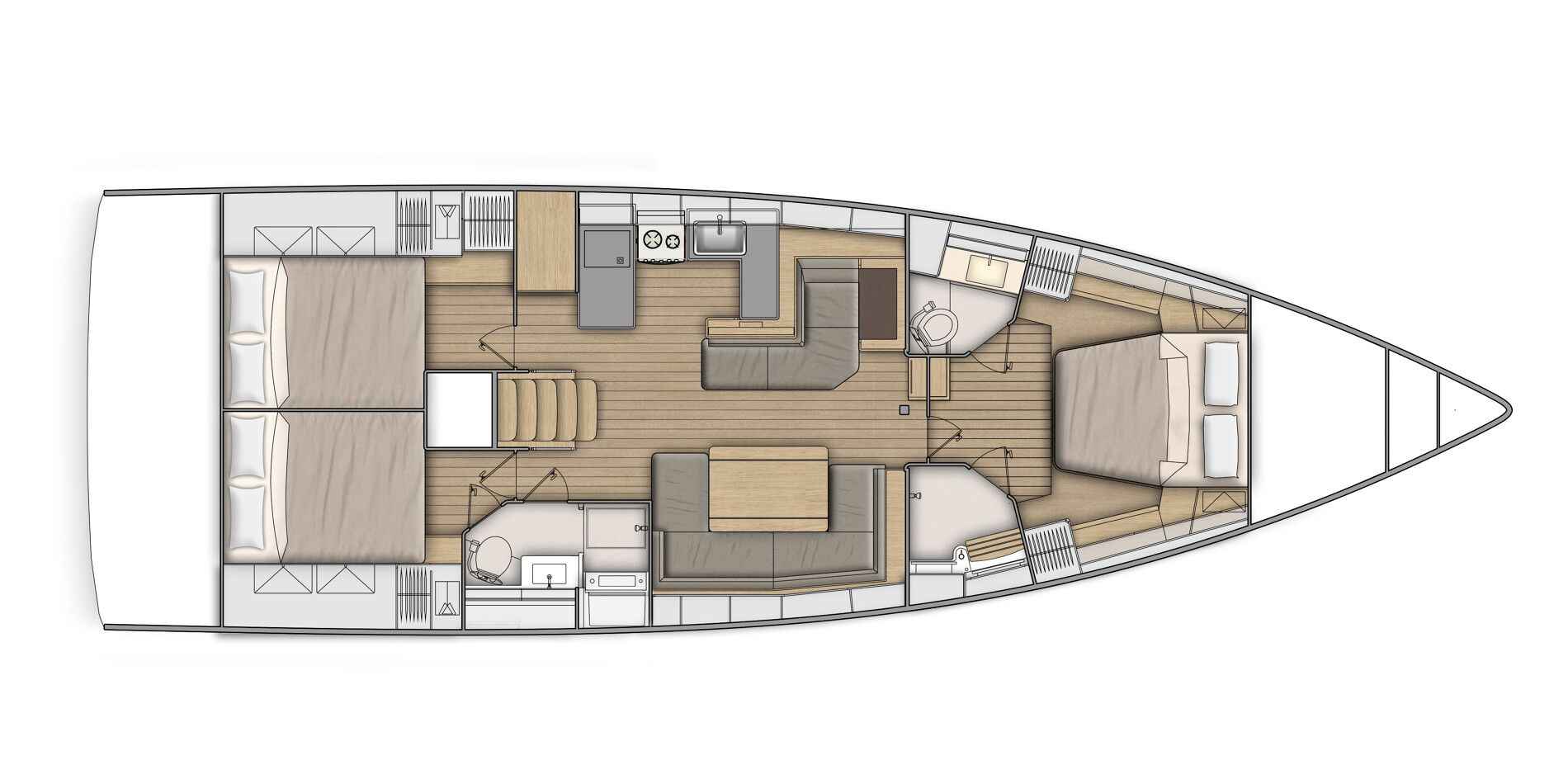 The 51.1 is designed to be fast and spacious, yet easy to handle, pushing the boundaries of cruising yacht design with great success. The stepped hull design allows for extra interior space, this one with the owners three cabin, two head layout. The deck plan is simple yet stylish and designed for smooth, short handed sailing and straightforward harbour manoeuvring.