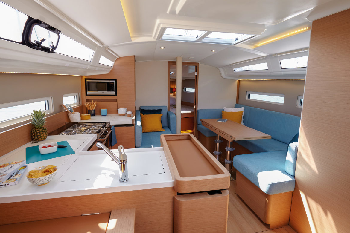 The interior is at once surprising and consistent with the Sun Odyssey line, where innovation serves to heighten the aesthetic and the level of comfort. Designed by Jean-Marc Piaton and his crew, the interior design reveals stunning potential for a sailboat of this size. The partitions and the distribution of space were designed in a somewhat atypical fashion to maximize the interior space, both visually and physically. The eye easily follows the uninterrupted interior lines. The interior is at once surprising and consistent with the Sun Odyssey line, where innovation serves to heighten the aesthetic and the level of comfort. Designed by Jean-Marc Piaton and his crew, the interior design reveals stunning potential for a sailboat of this size.