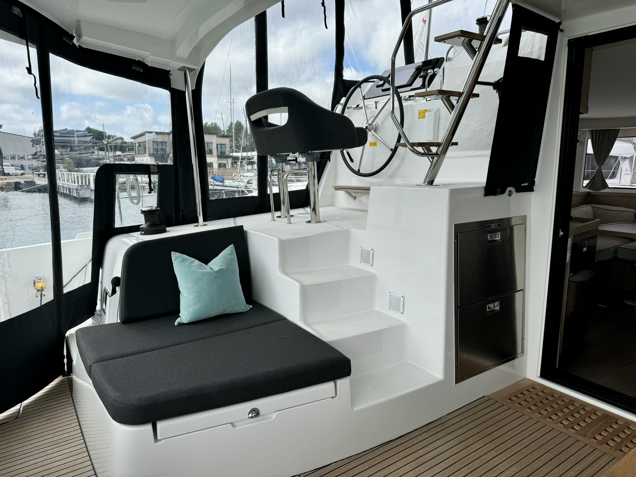 The raised helm station to port provides superb visibility and with all lines and winches to hand, an extremely straightforward sail plan.