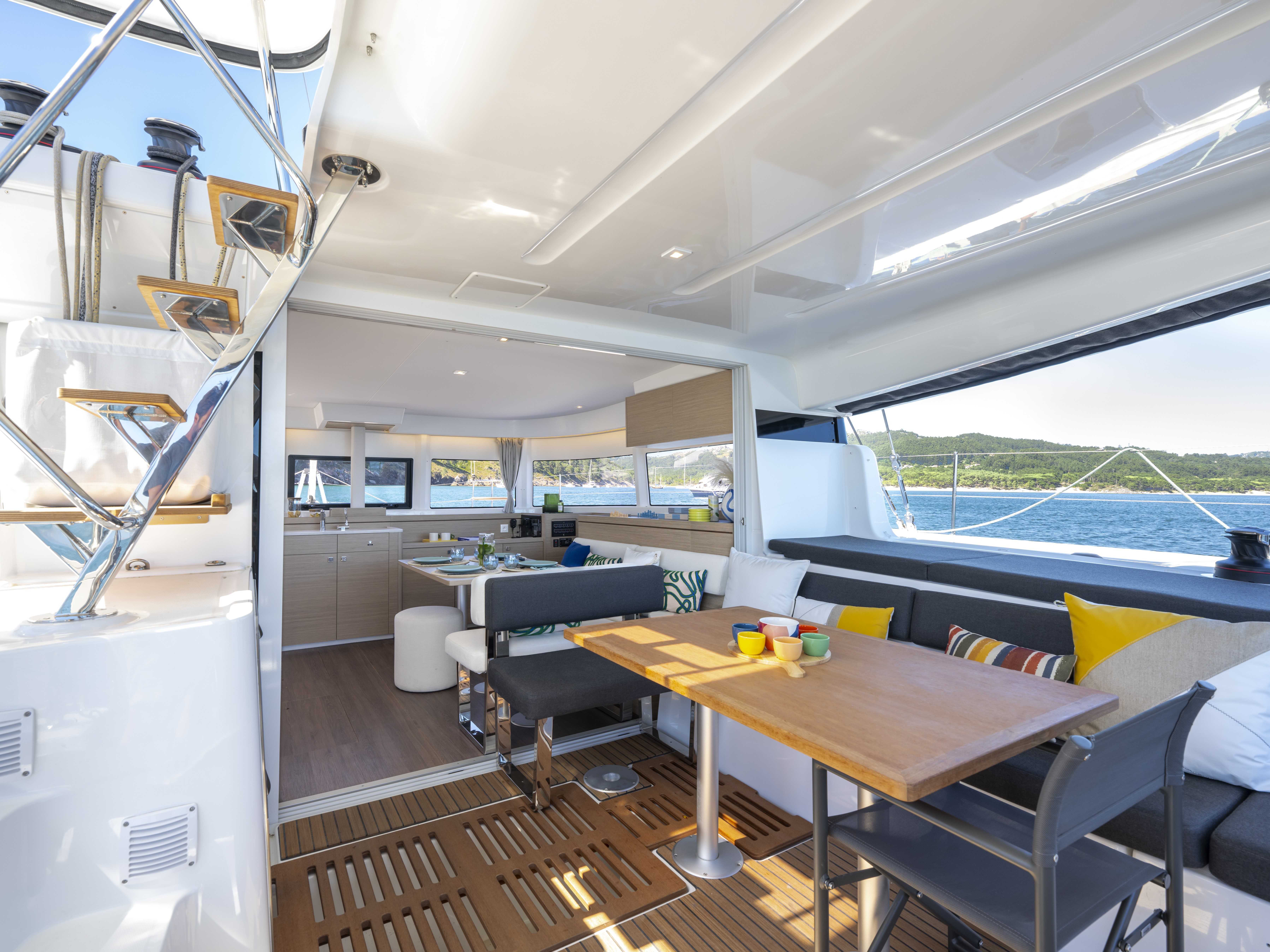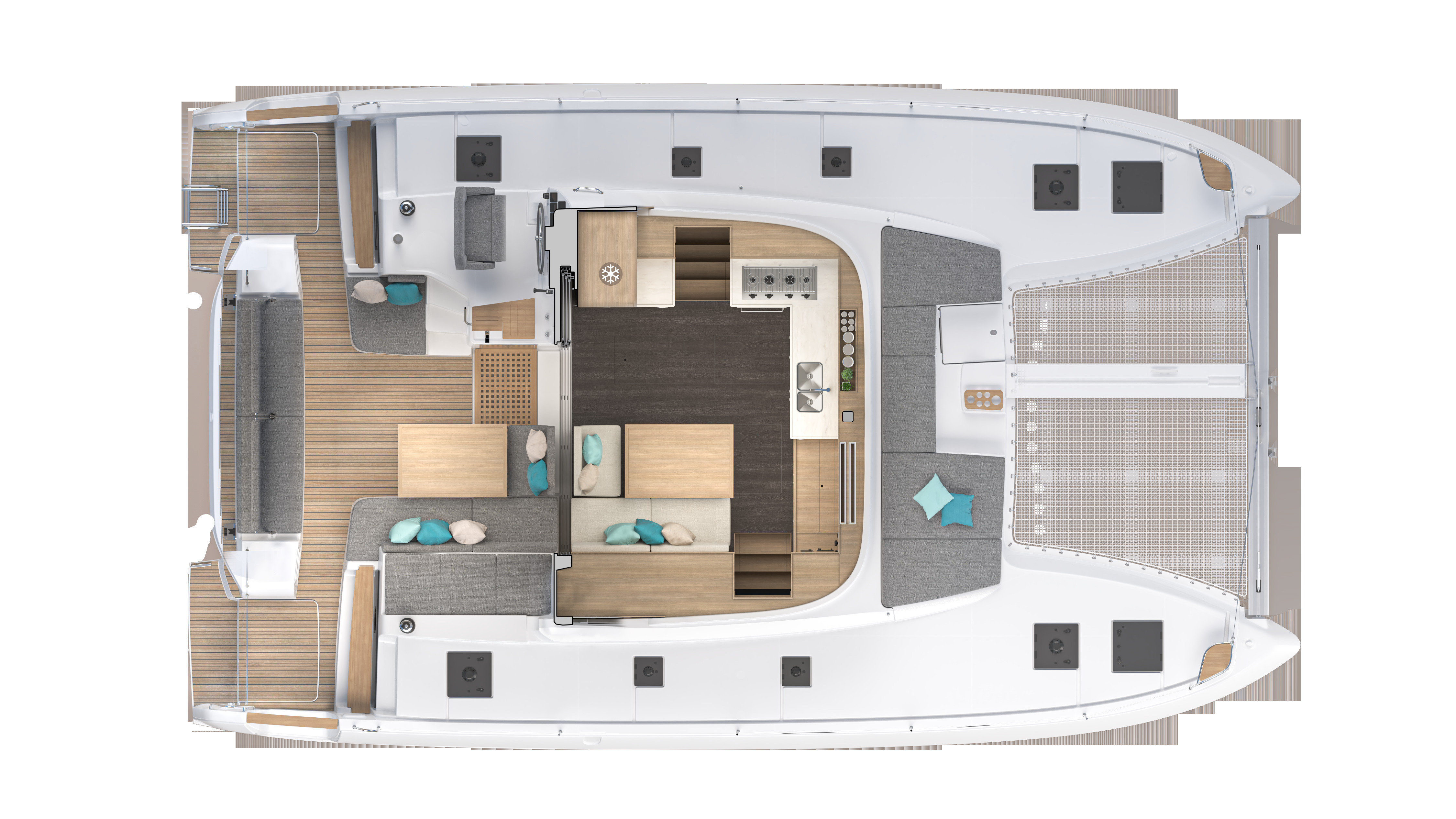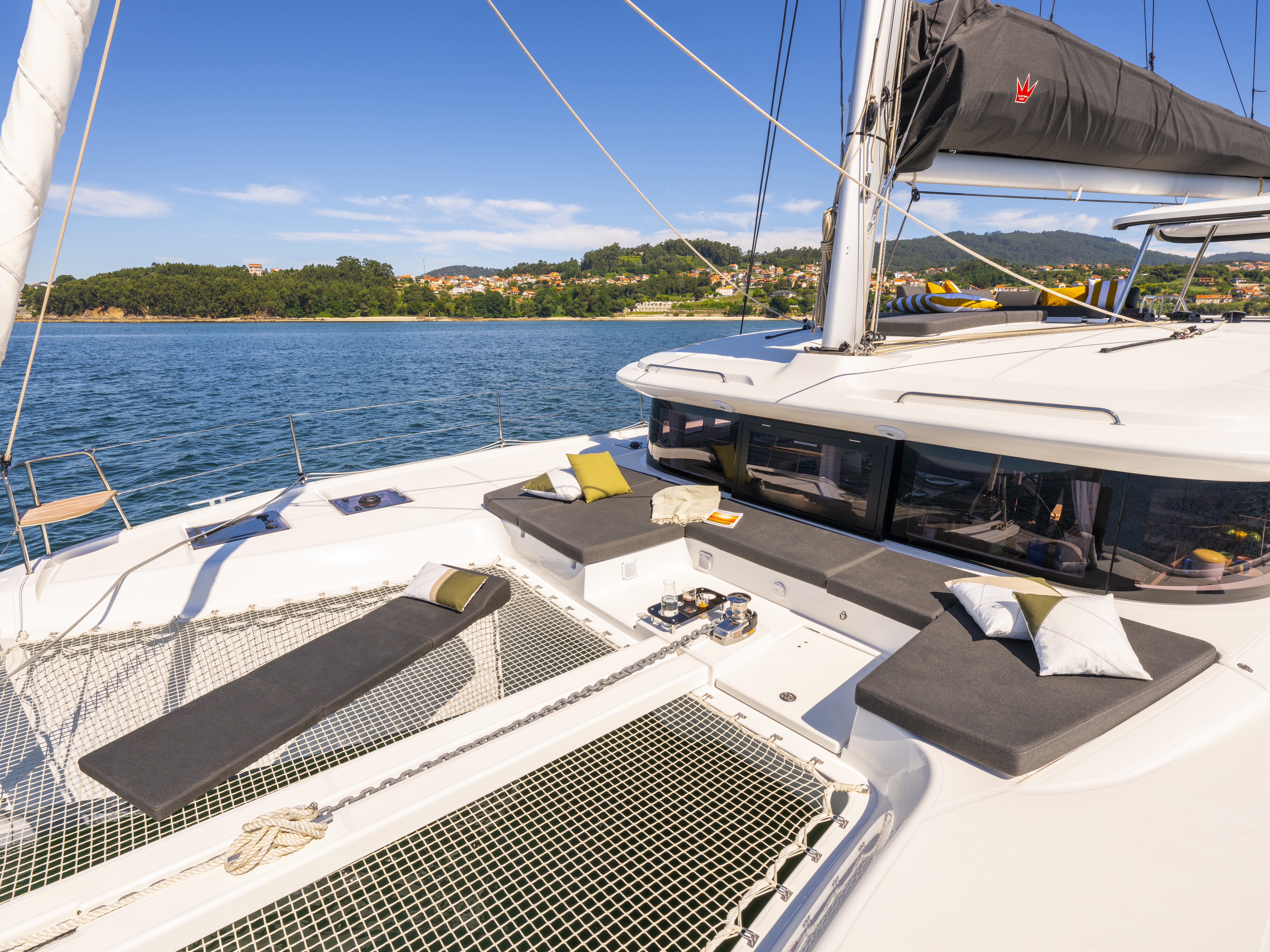 Exterior space is fully utilized, with an innovative movable backrest of the aft seating, moulded foredeck seating area as well as a roof lounge accessible from the helm, giving the social and relaxation space afforded to much larger catamarans.