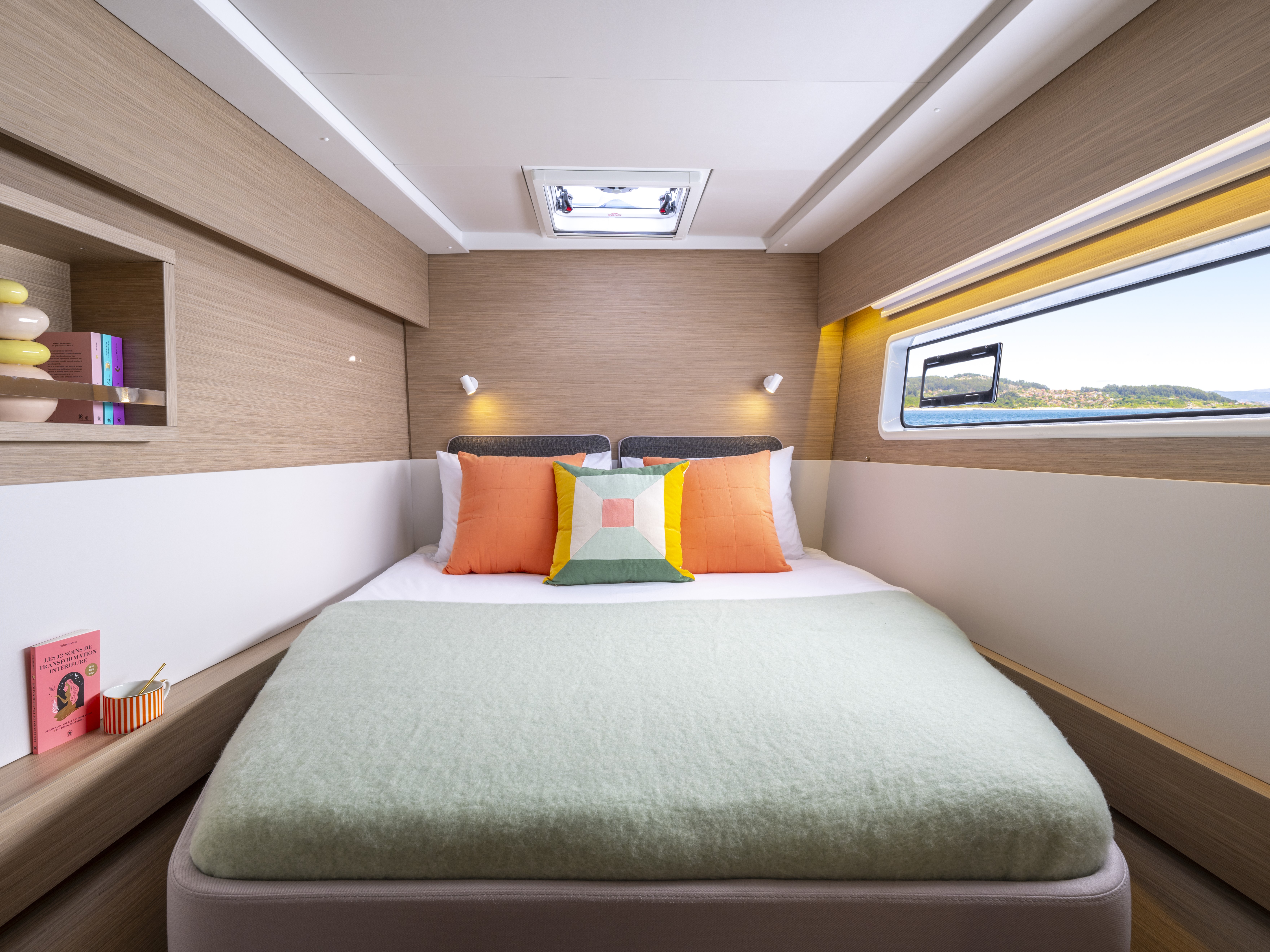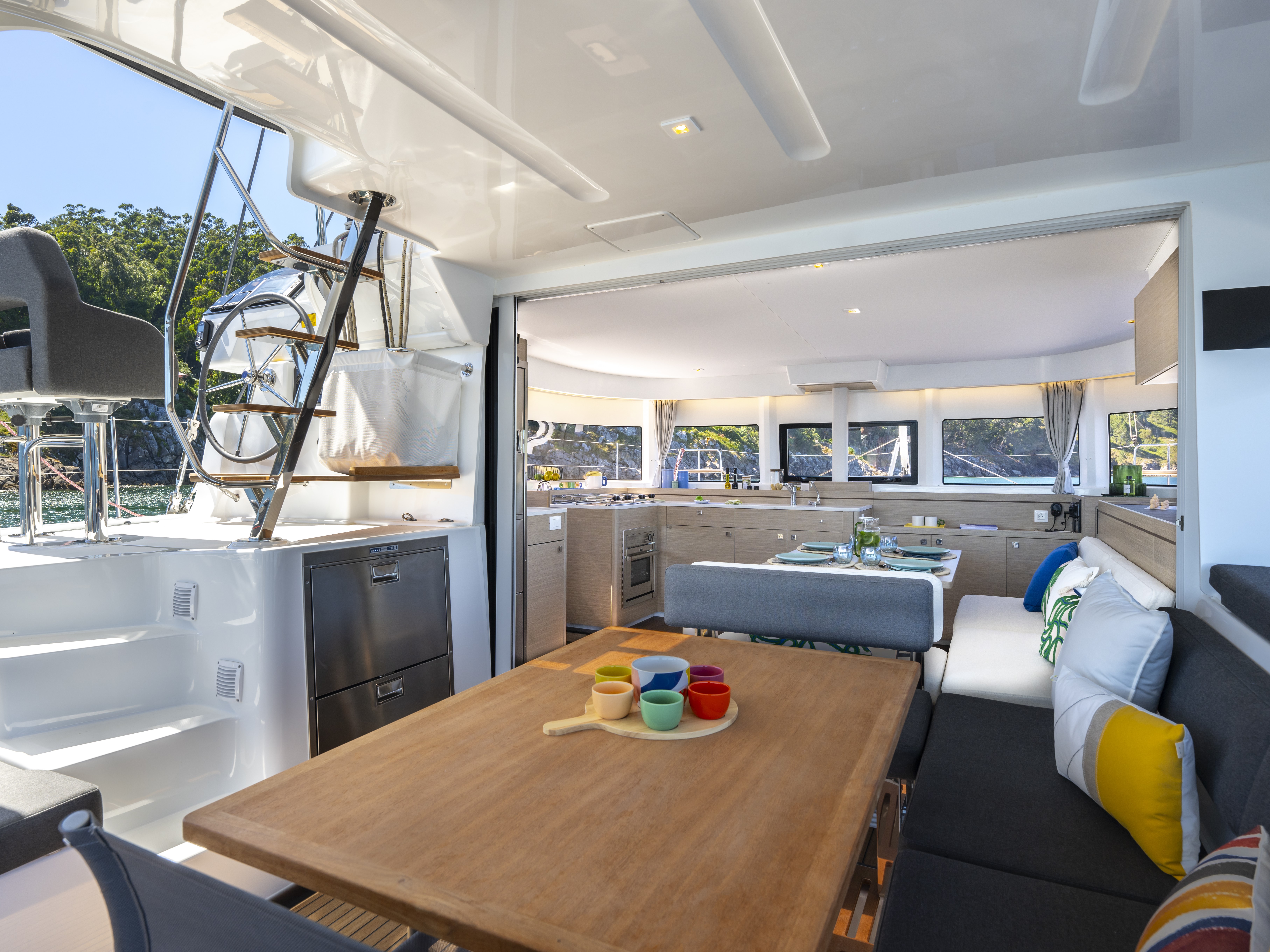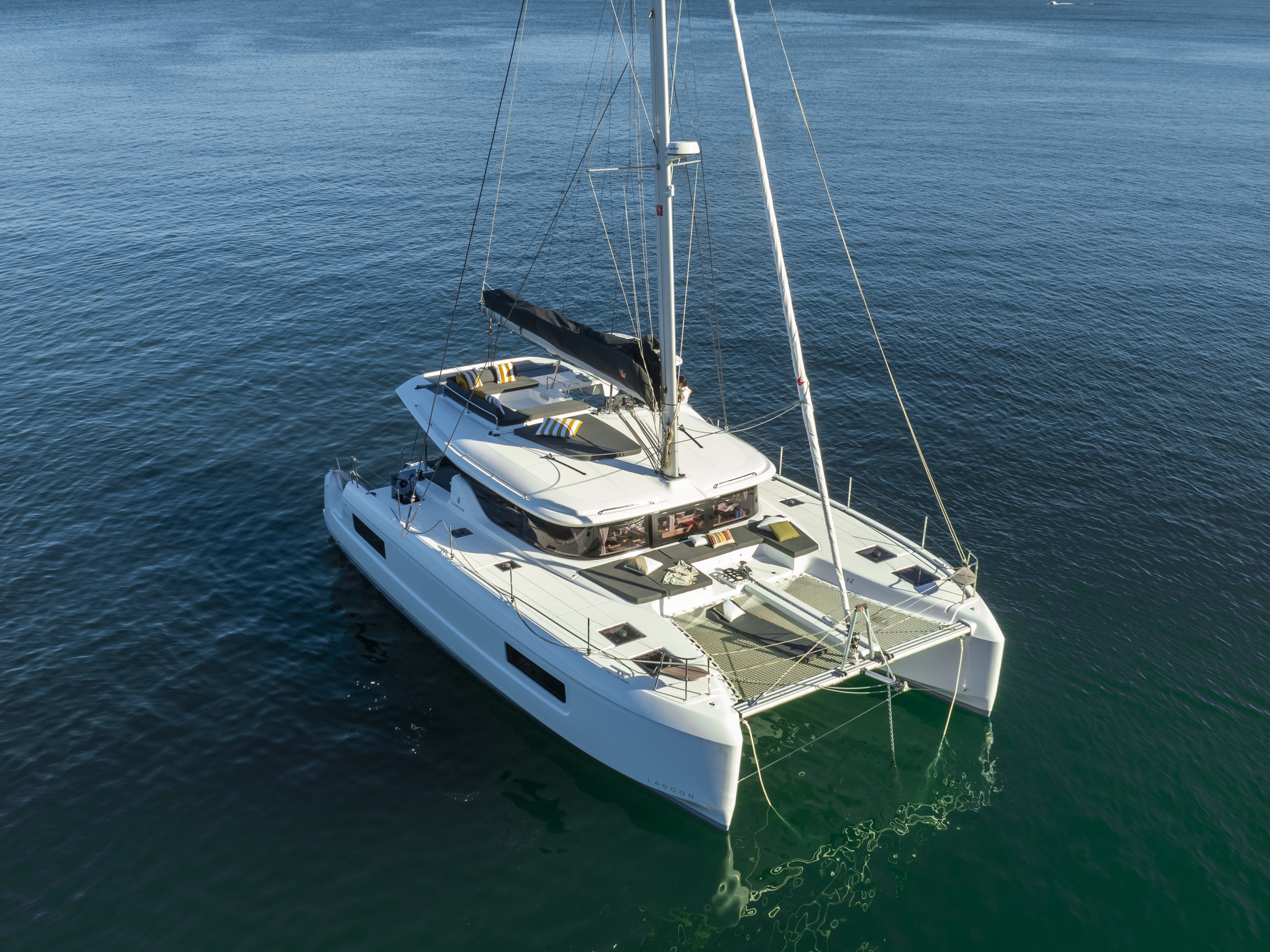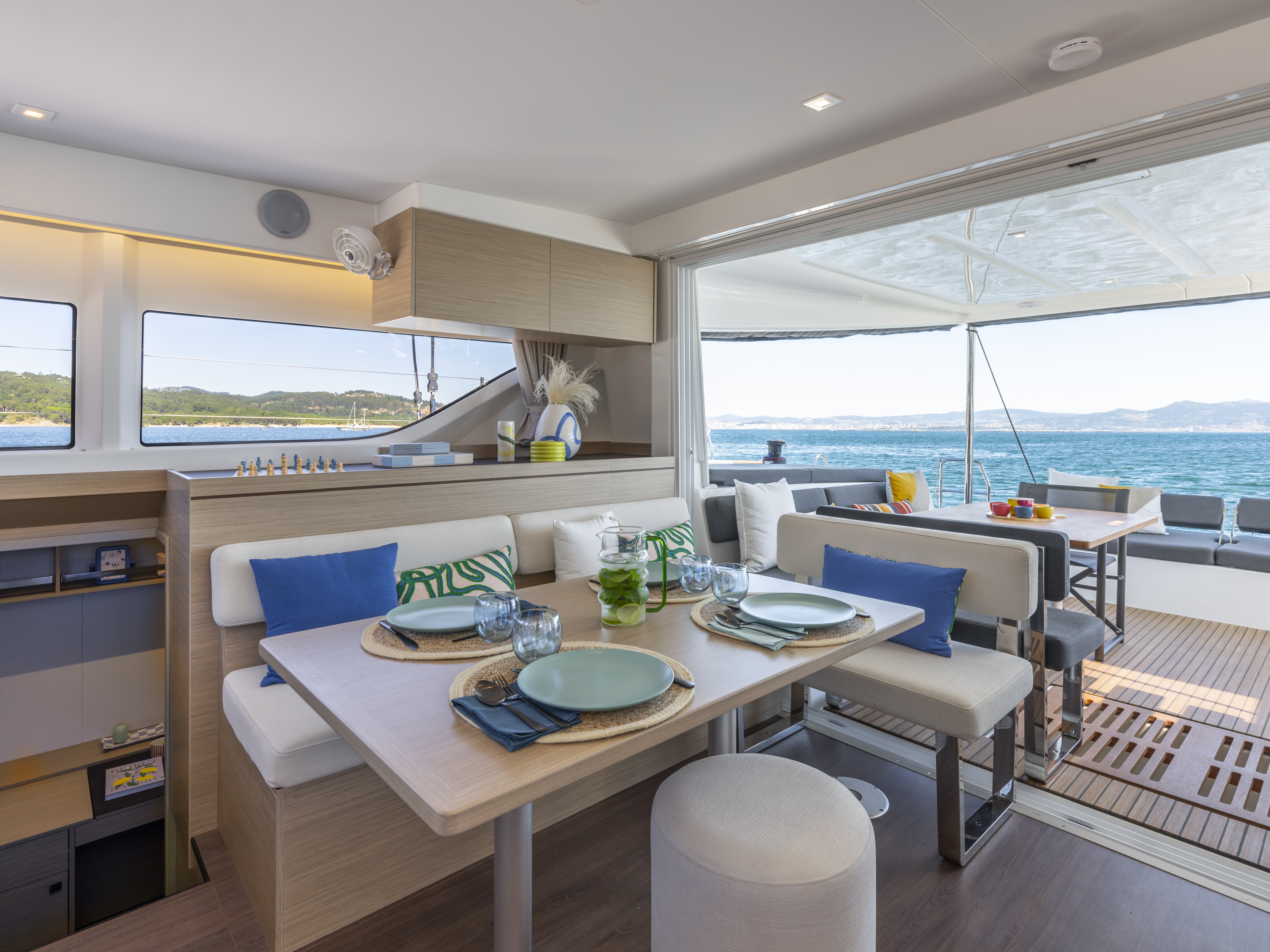 Exterior space is fully utilized, with an innovative movable backrest of the aft seating, moulded foredeck seating area as well as a roof lounge accessible from the helm, giving the social and relaxation space afforded to much larger catamarans.